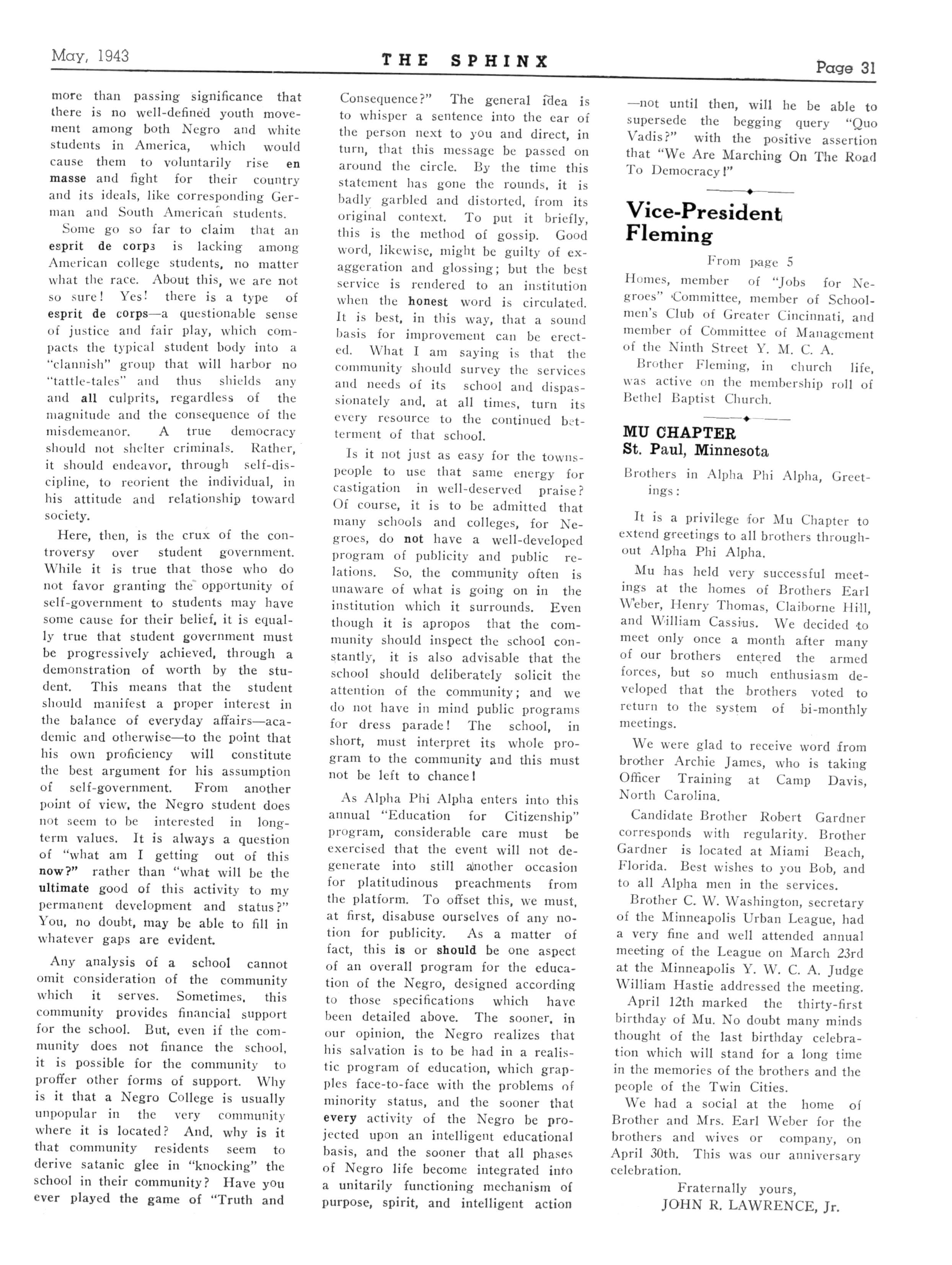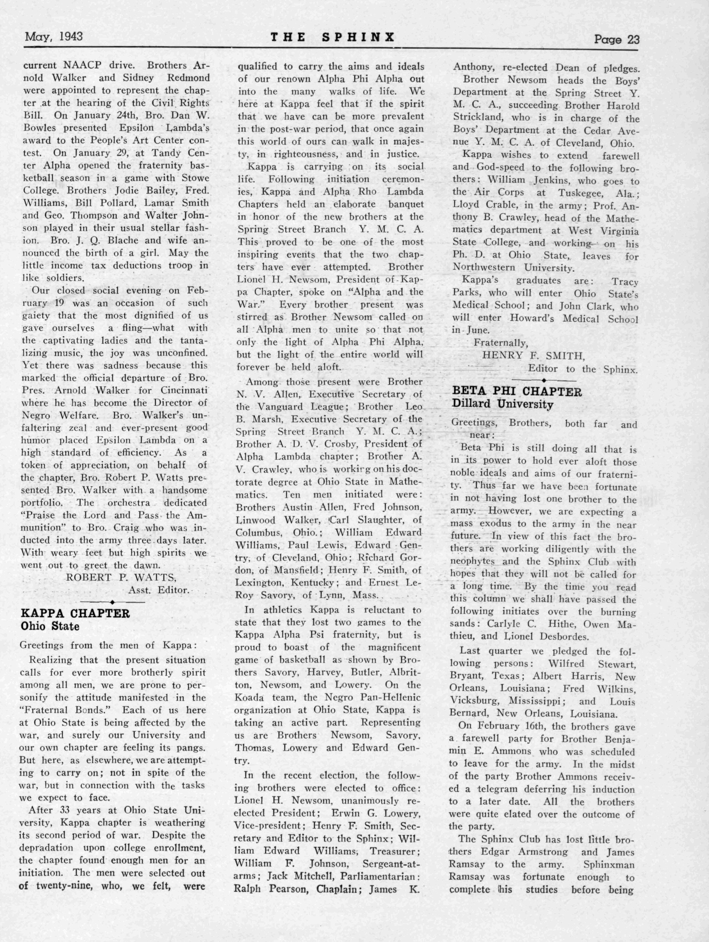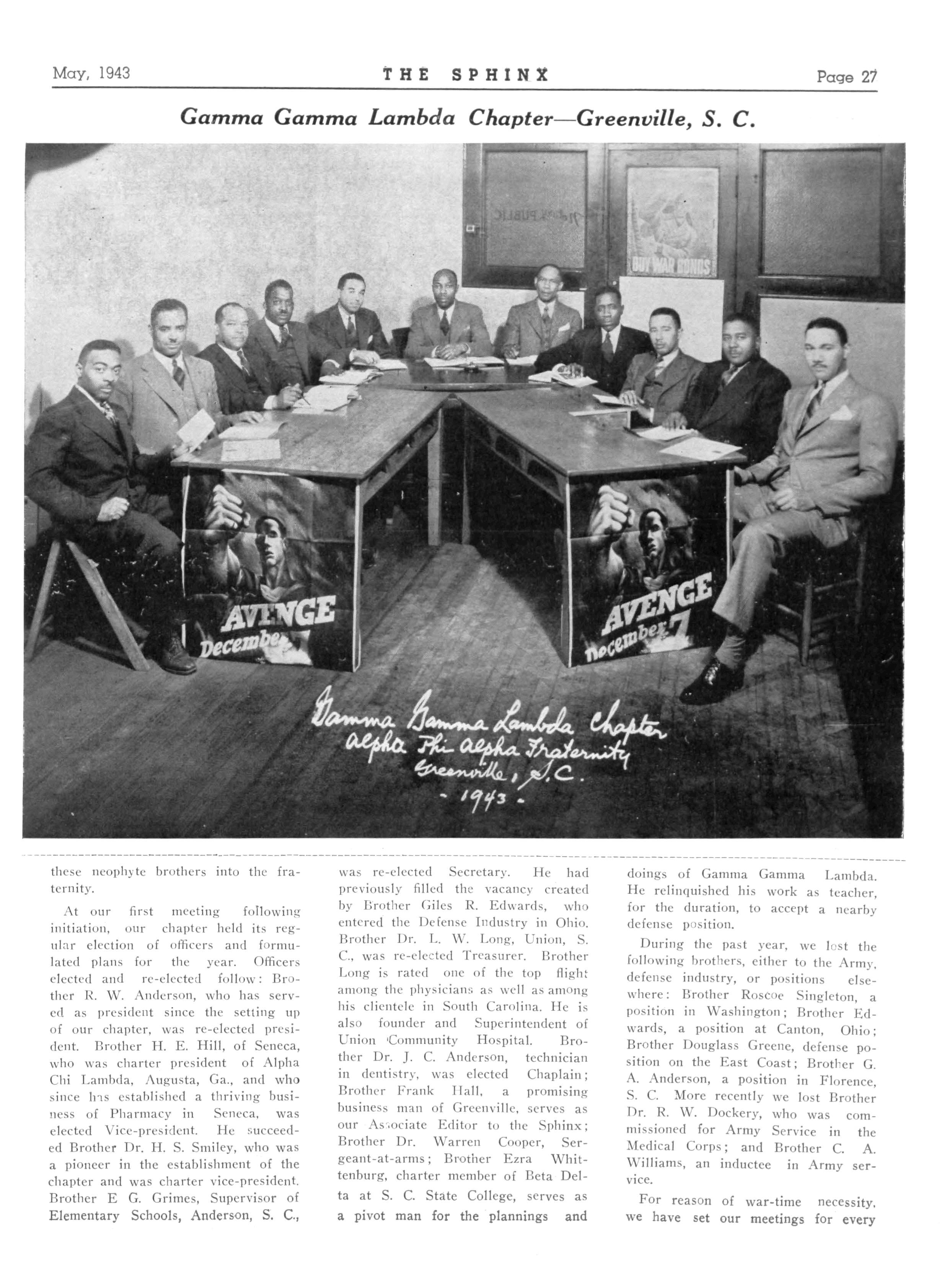 At subsequent meetings at the homes of several brothers, the chapter has committed its deliberations to promoting activities of local and national racial benefit Efforts were made to get the State Legislature to appropriate money for the building of a Vocational High School for Negro students The just participation of Negroes in the war efforts has been the concern of President Barnett and his corps of officers ,-, , , fraternally yours, JOHN F MATHEUS, Reporter