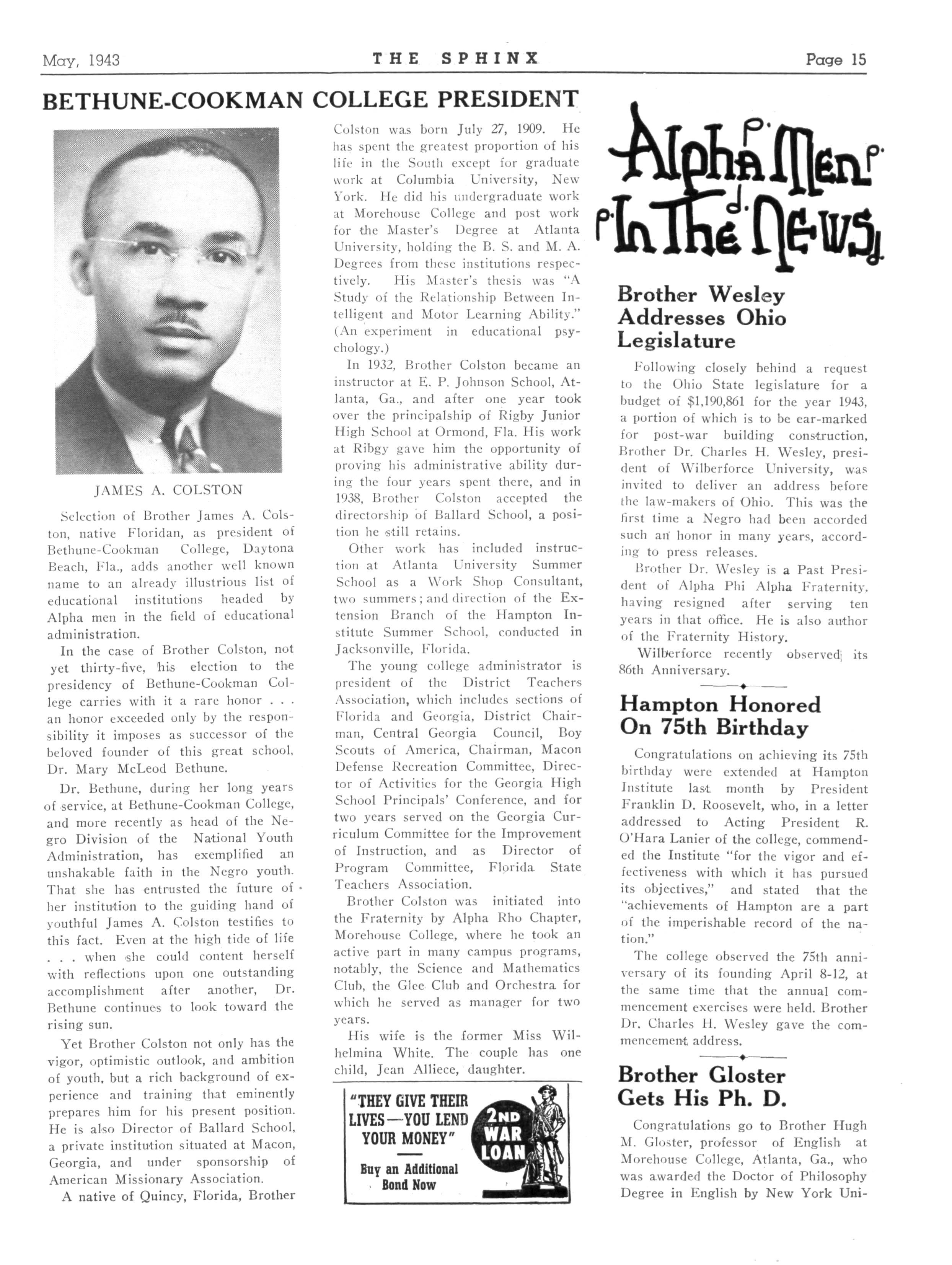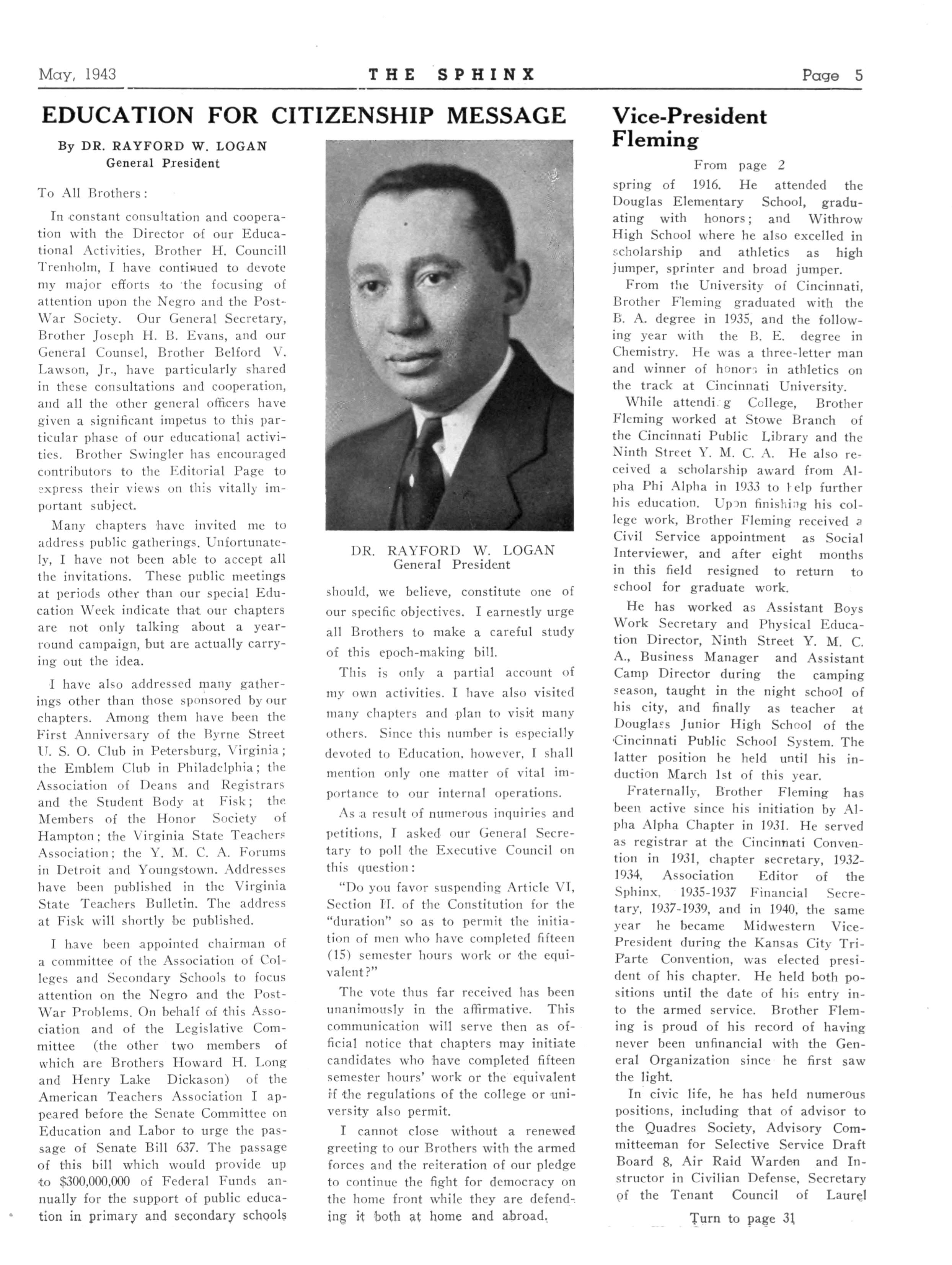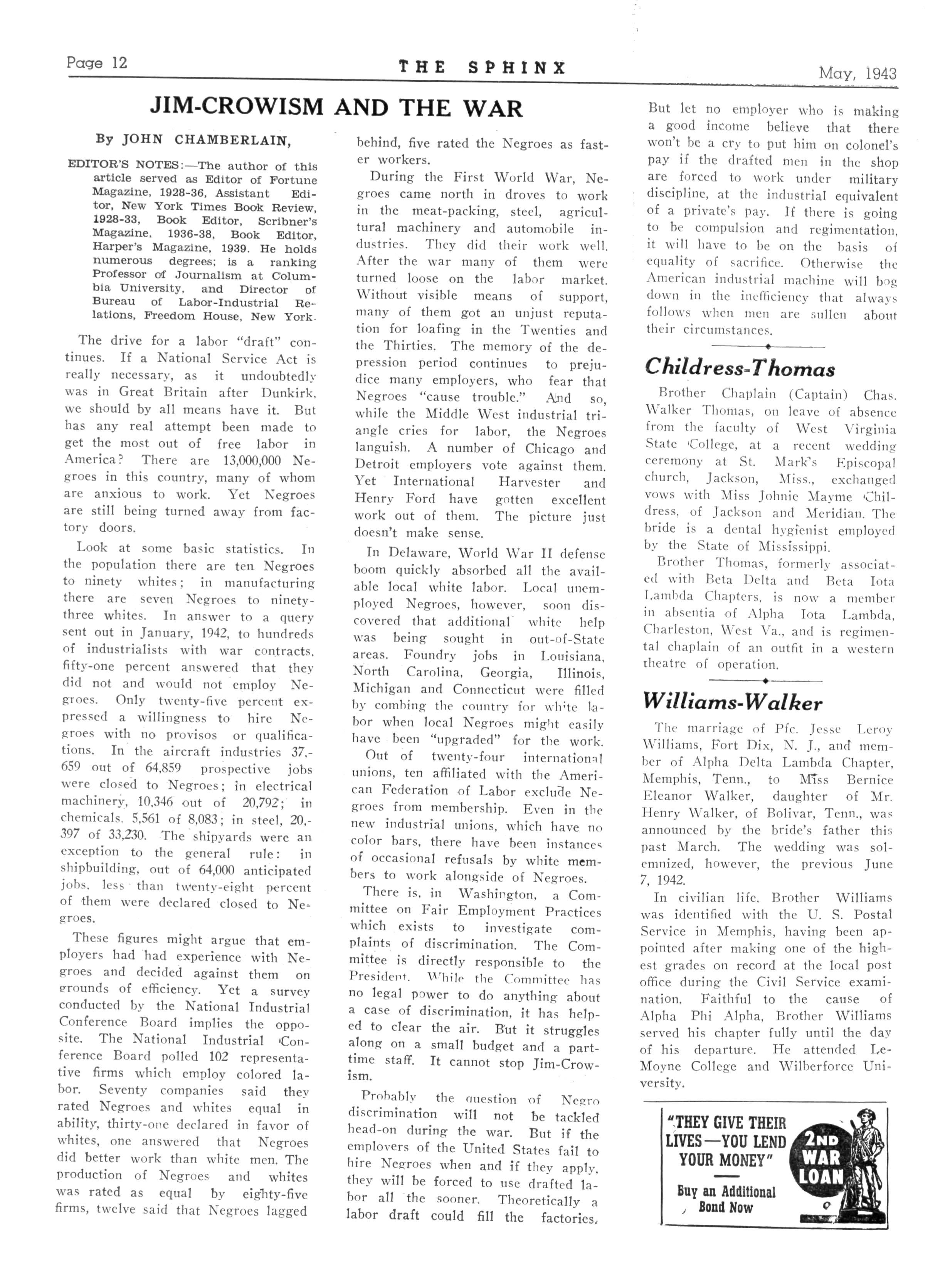 At subsequent meetings at the homes of several brothers, the chapter has committed its deliberations to promoting activities of local and national racial benefit Efforts were made to get the State Legislature to appropriate money for the building of a Vocational High School for Negro students The just participation of Negroes in the war efforts has been the concern of President Barnett and his corps of officers ,-, , , fraternally yours, JOHN F MATHEUS, Reporter