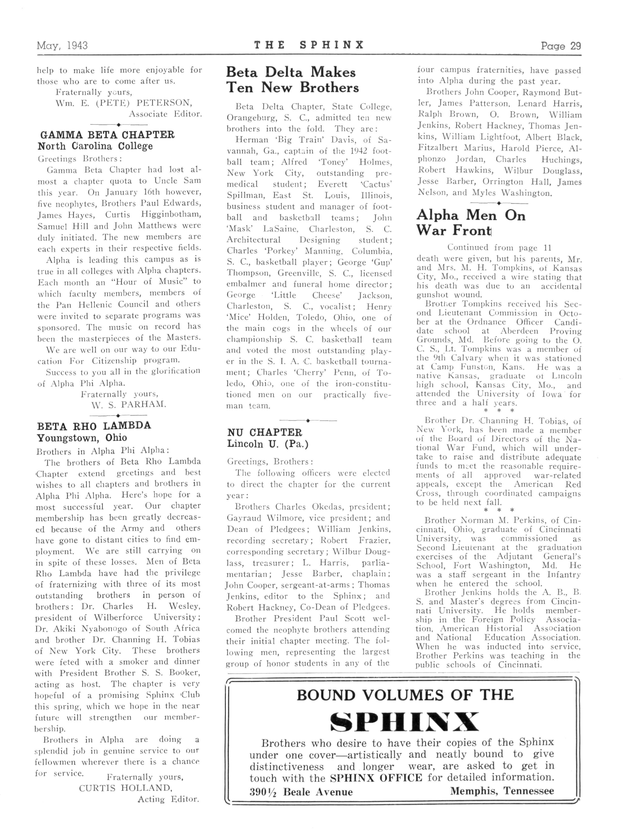 44 ALPHA PSI—Lincoln University, Jefferson City, Mo.; President, Alphonse E Ellis, Allen Hall, Lincoln University; Secretary, William McCoy, Allen Hall Lincoln University