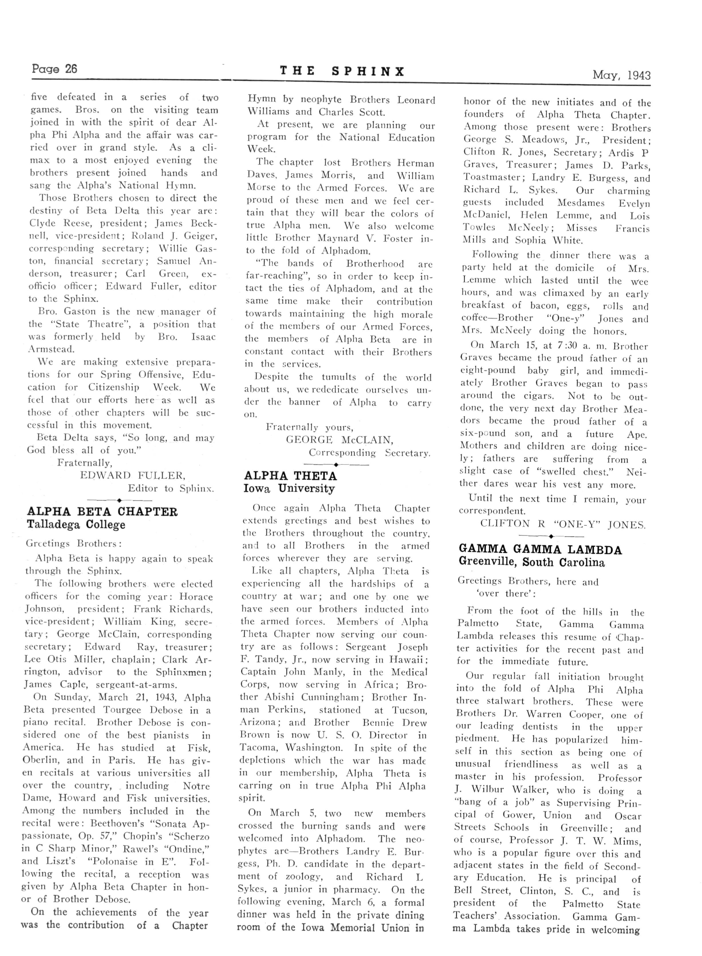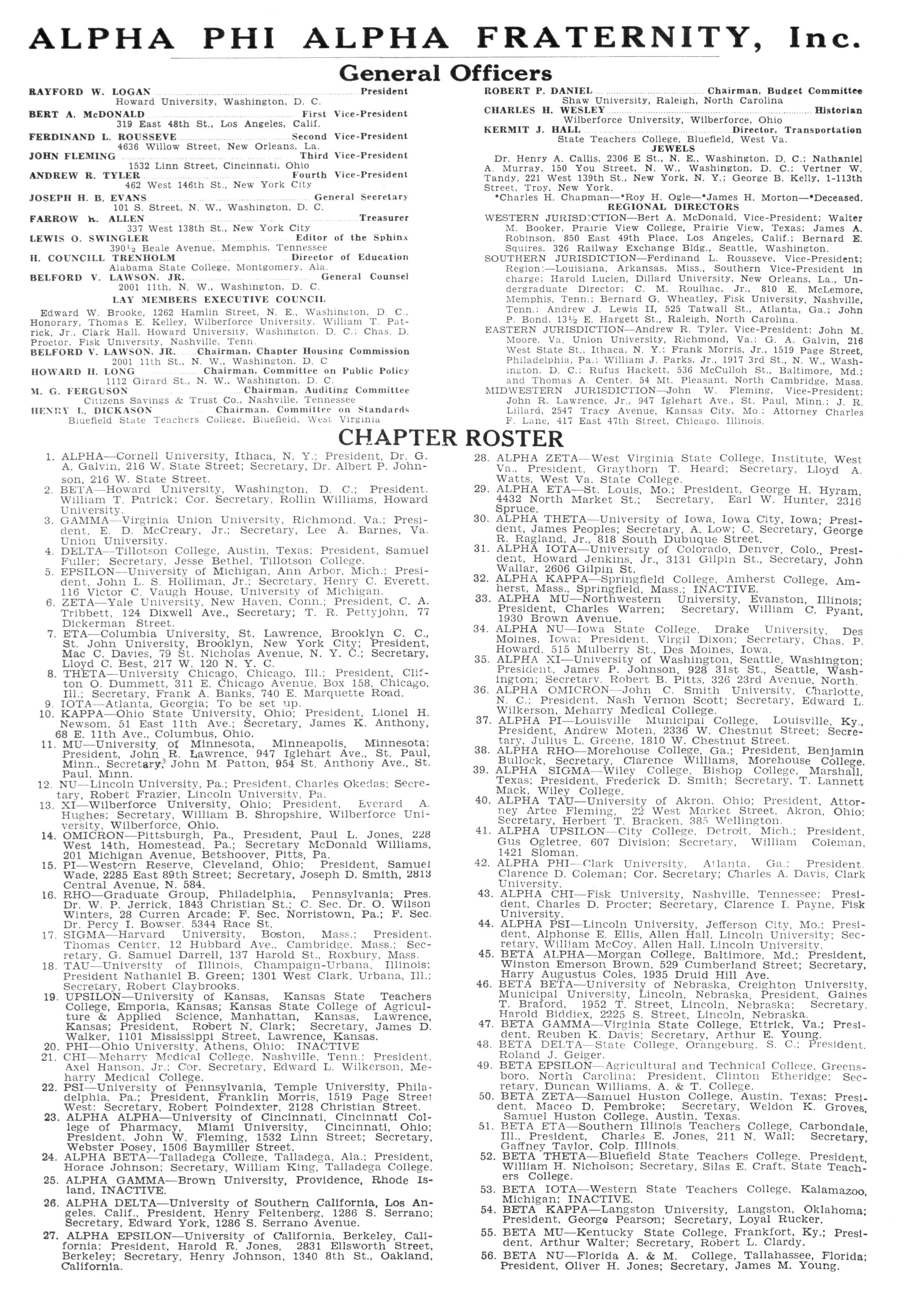 43 ALPHA CHI—Fisk University, Nashville, Tennessee; President, Charles D Procter; Secretary, Clarence I Payne, Fisk University