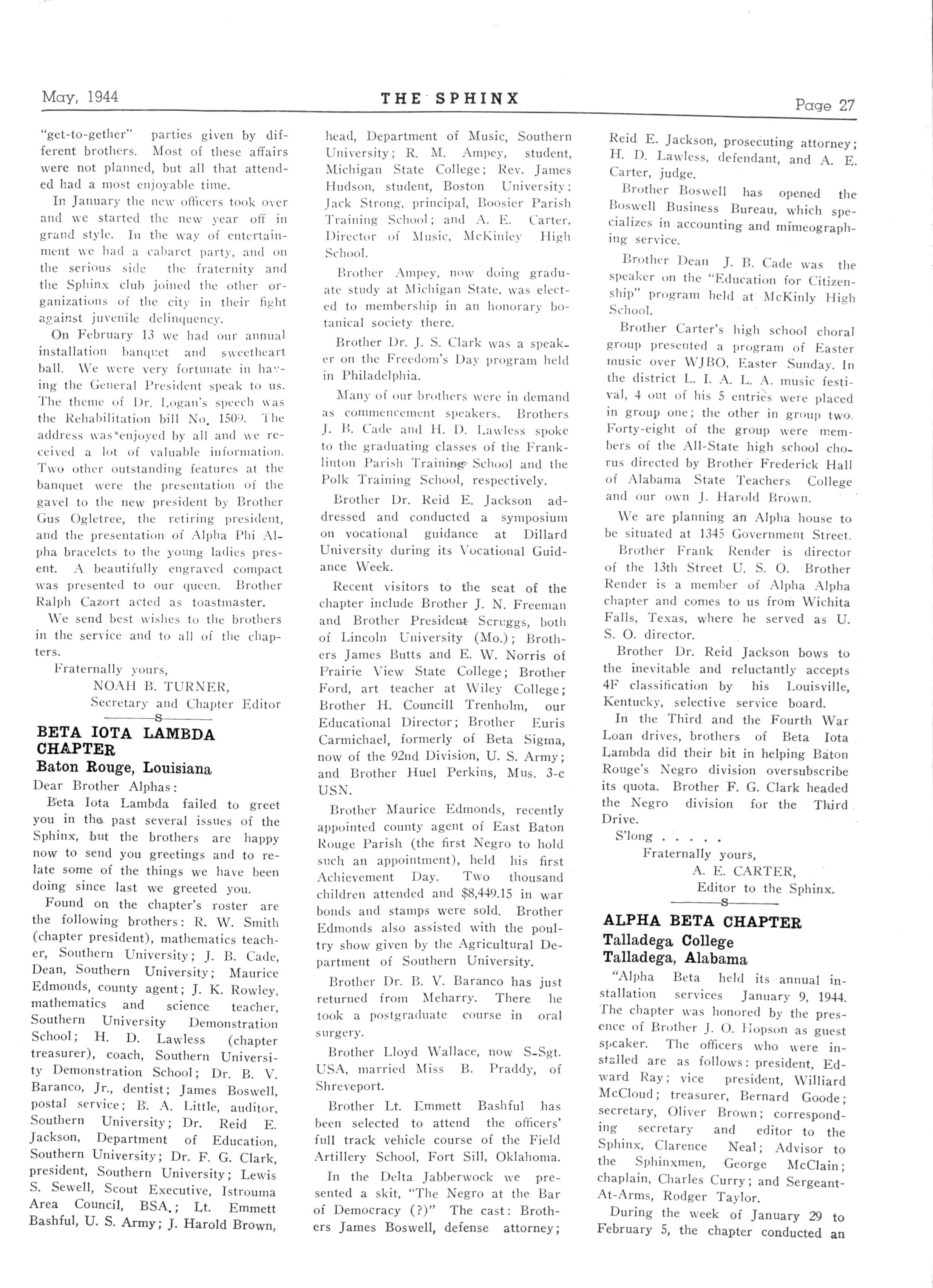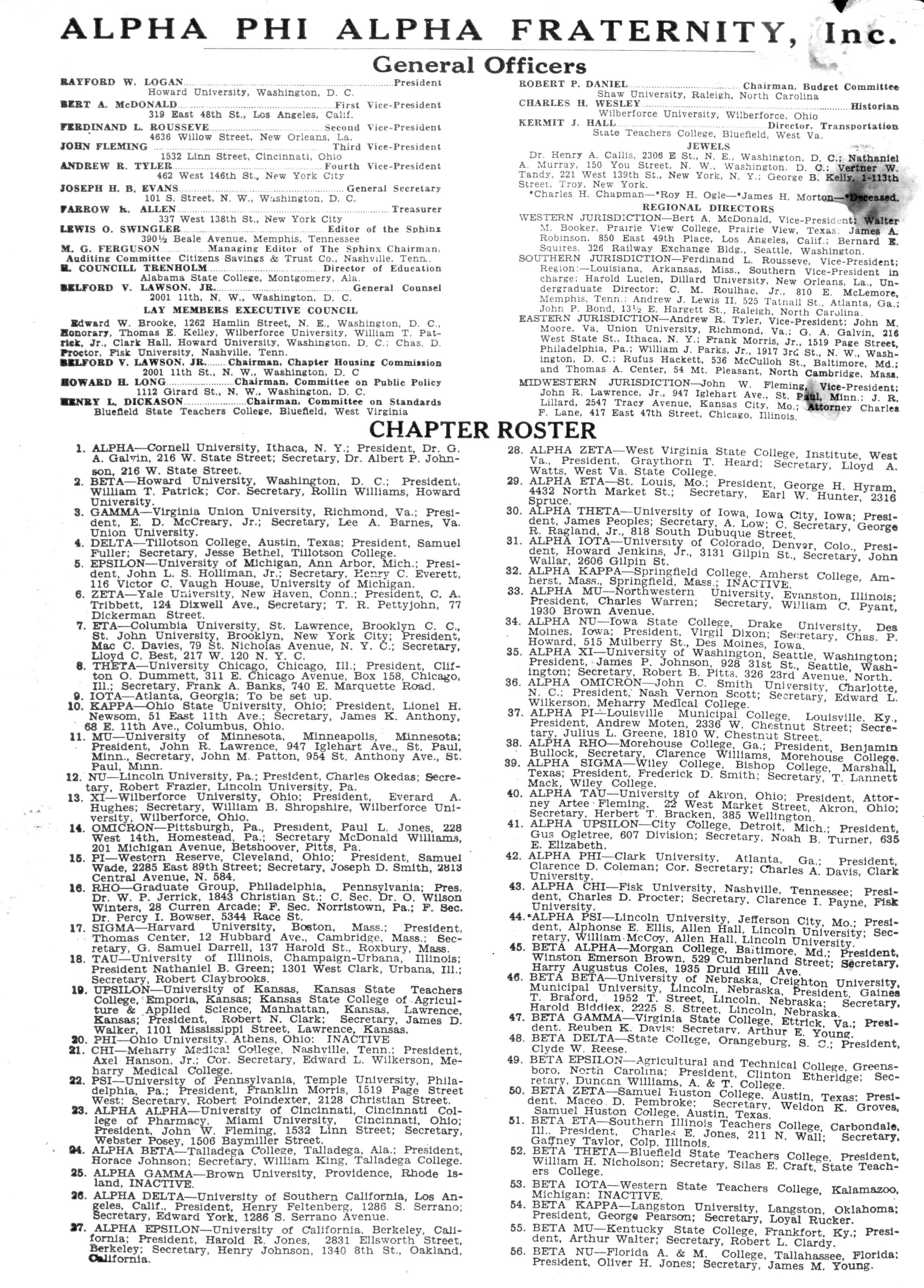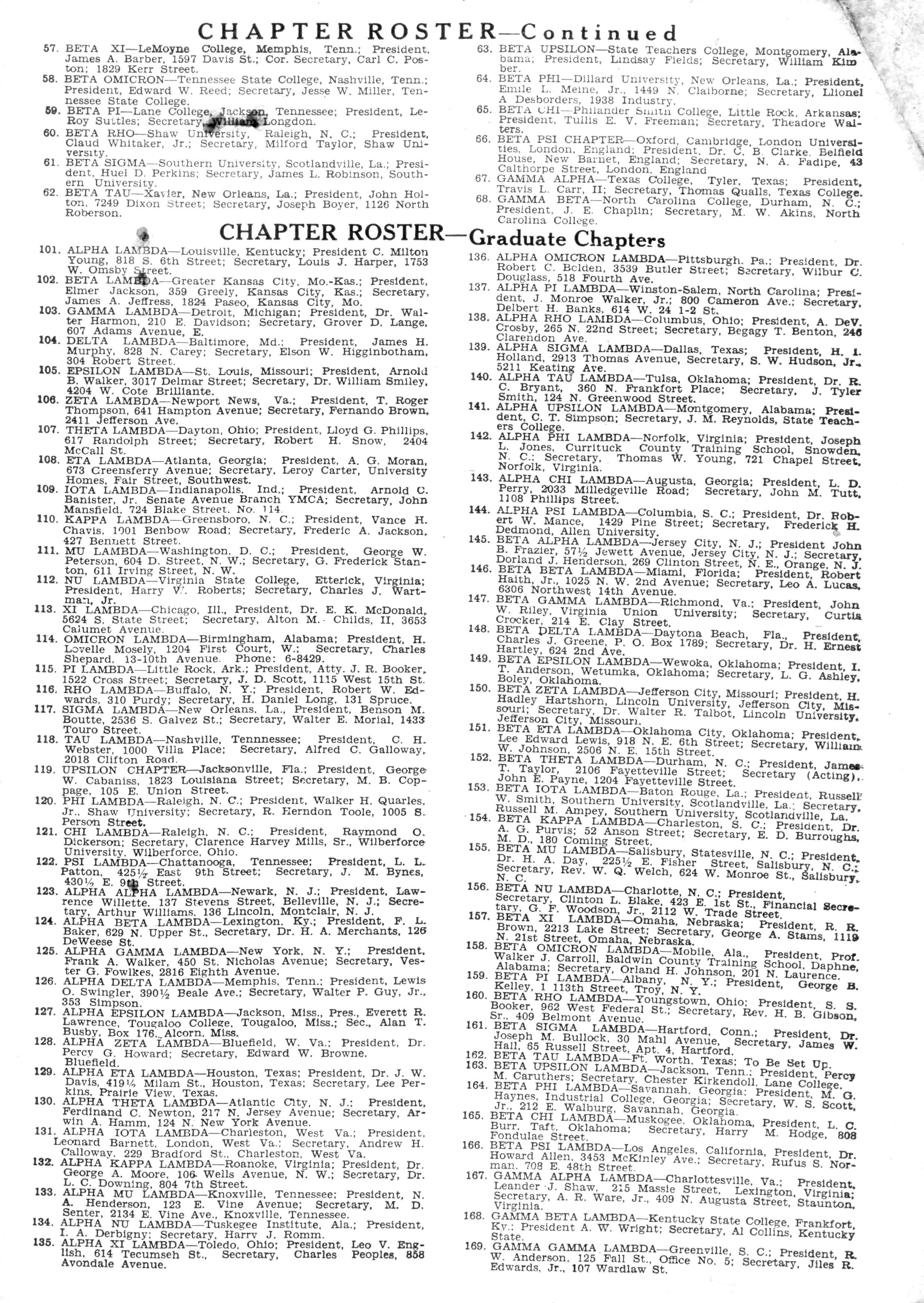 102 BETA LAMBDA—Greater Kansas City, Mo.-Kas.; President, Elmer Jackson, 359 Greely, Kansas City, Kas.; Secretary, James A Jeffress, 1824Paseo, Kansas City, Mo