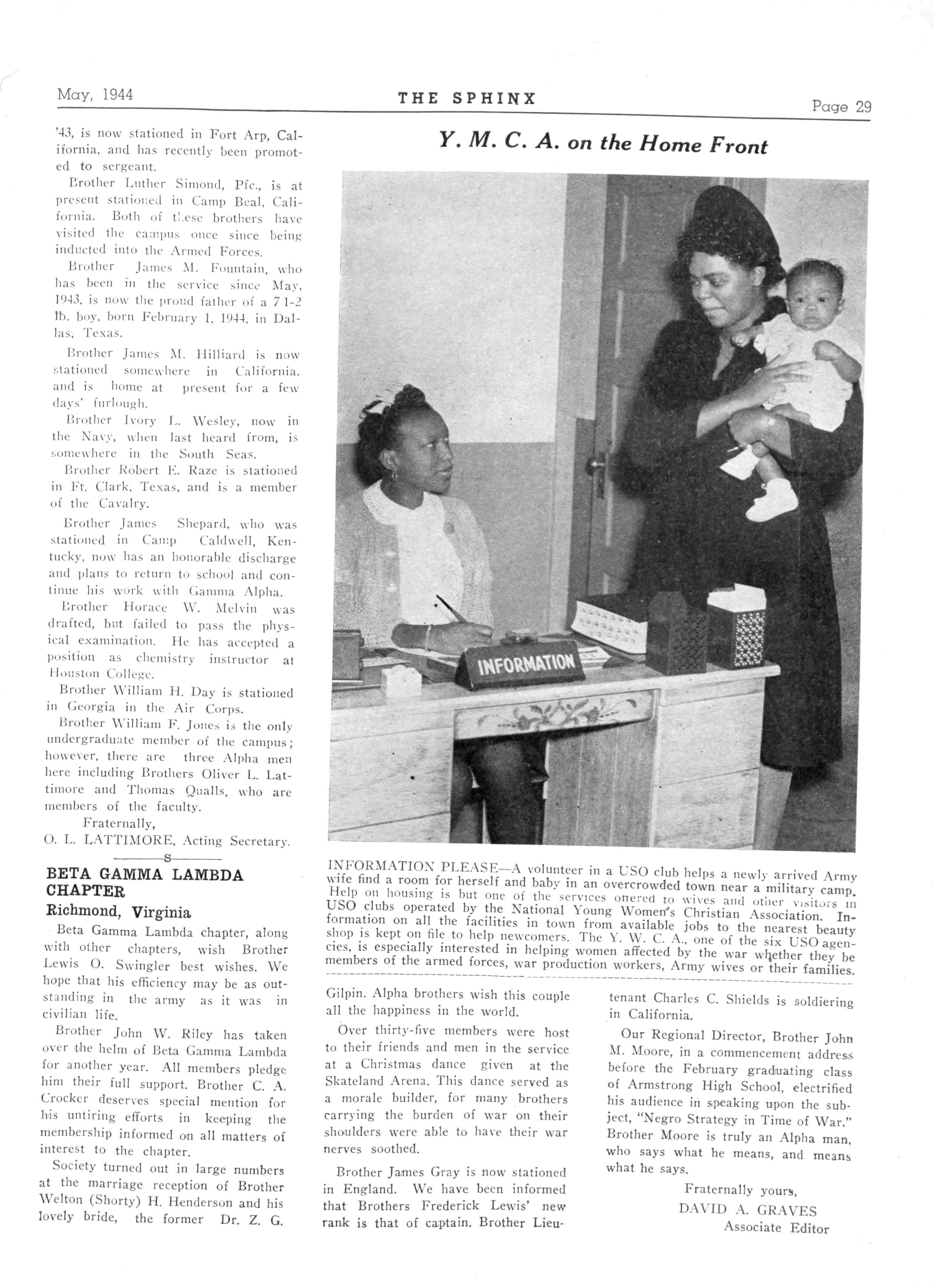Tuesday evening, January 4, 1)44, the Stork visited the home of Brother Wallace on Picquet Avenue and left an eight pound bouncing baby boy. Congratulations Mother and Dad Alpha Chi Lambda brothers know now why the president did not preside at