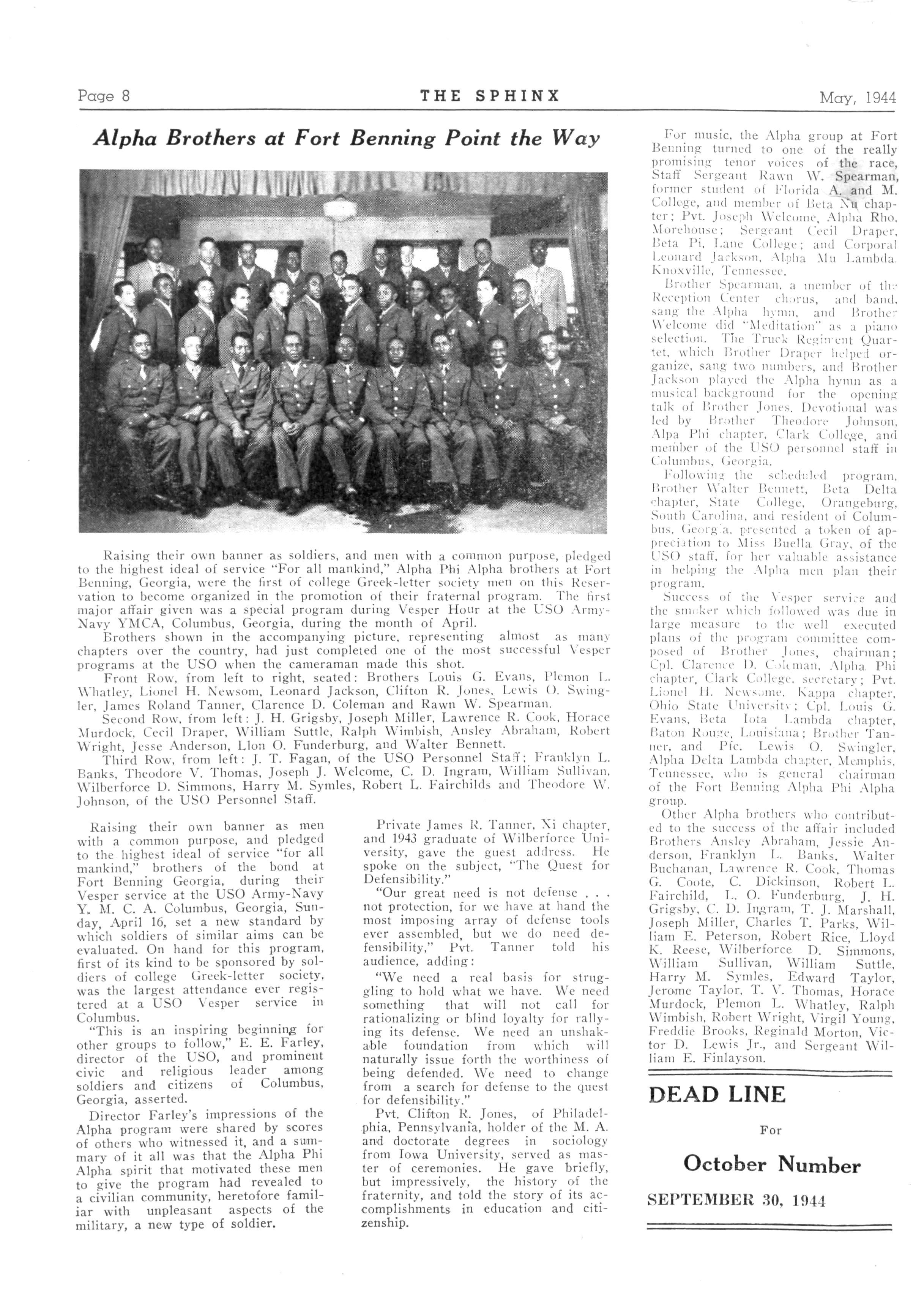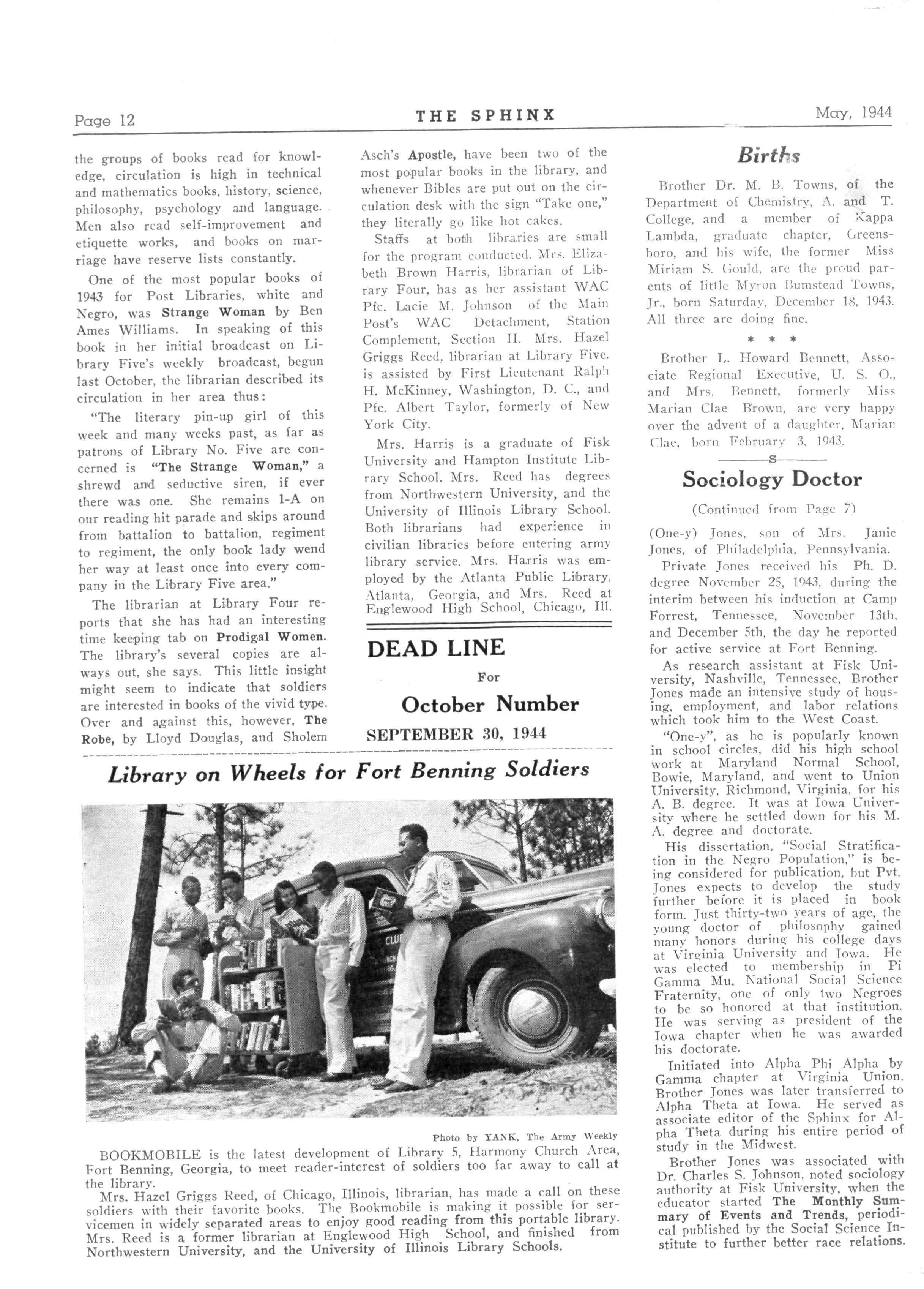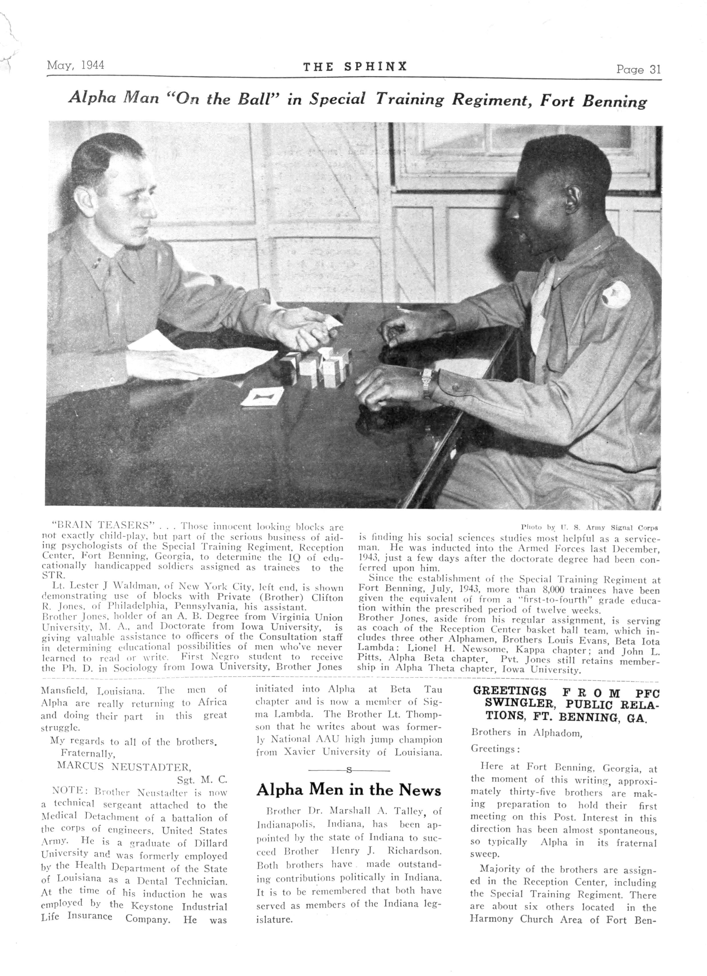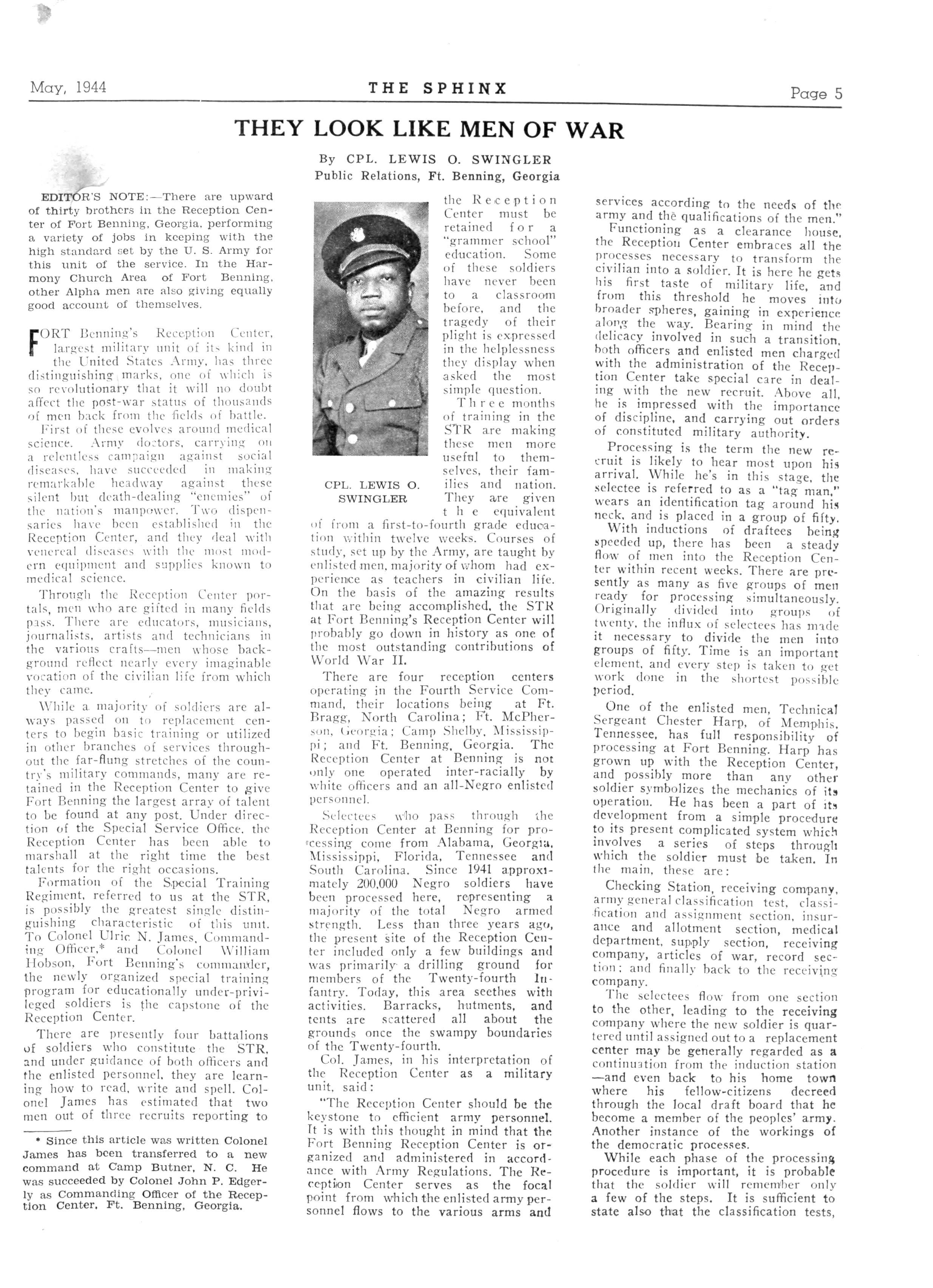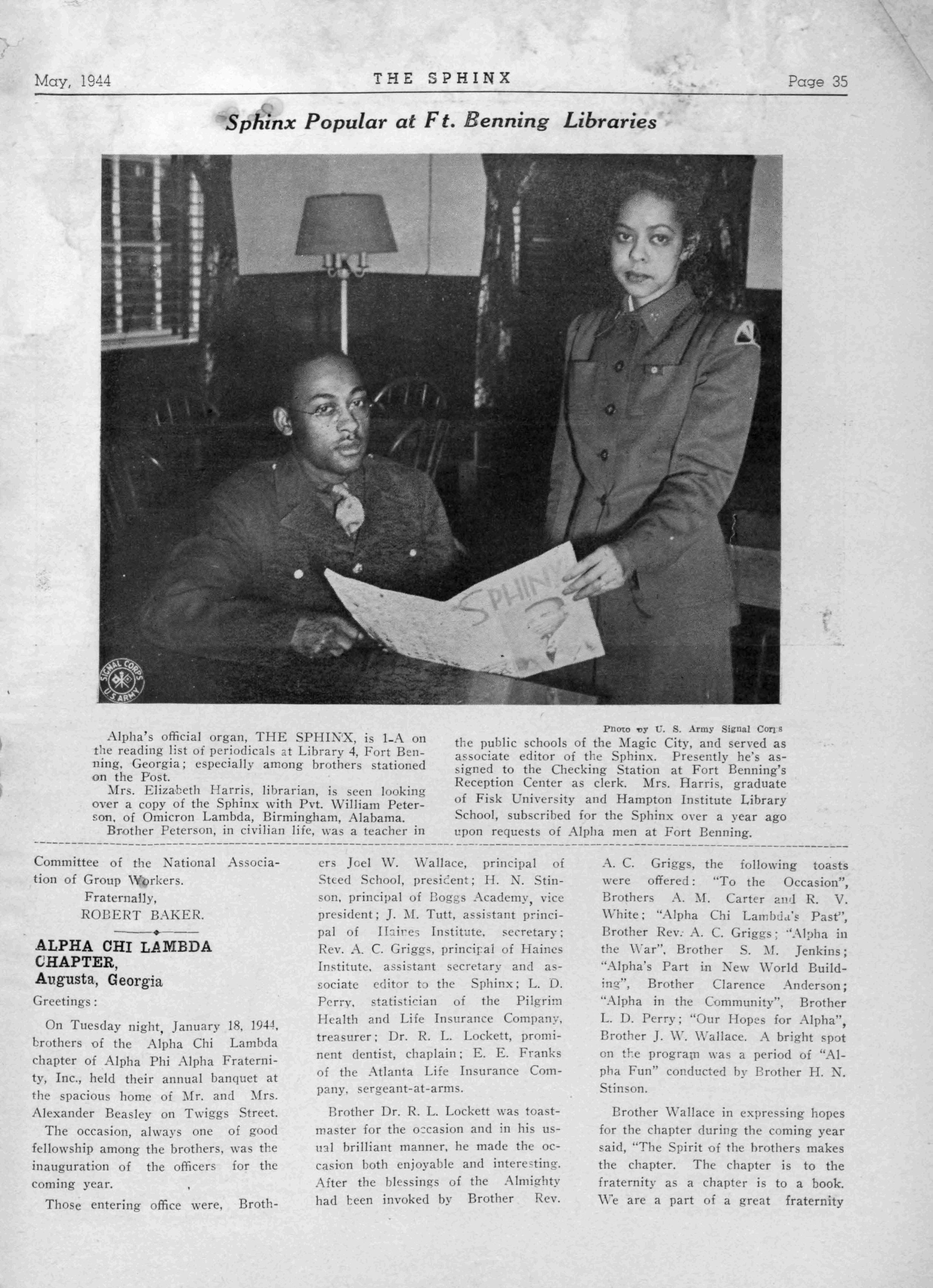 Pnoto vy V. S Army Sieual Con * the public schools of the Magic City, and served as associate editor of the Sphinx Presently he's assigned to the Checking Station at Fort Benning's Reception Center as clerk Mrs Harris, graduate of Fisk University and Hampton Institute Library School, subscribed for the Sphinx over a year ago upon requests of Alpha men at port Benning