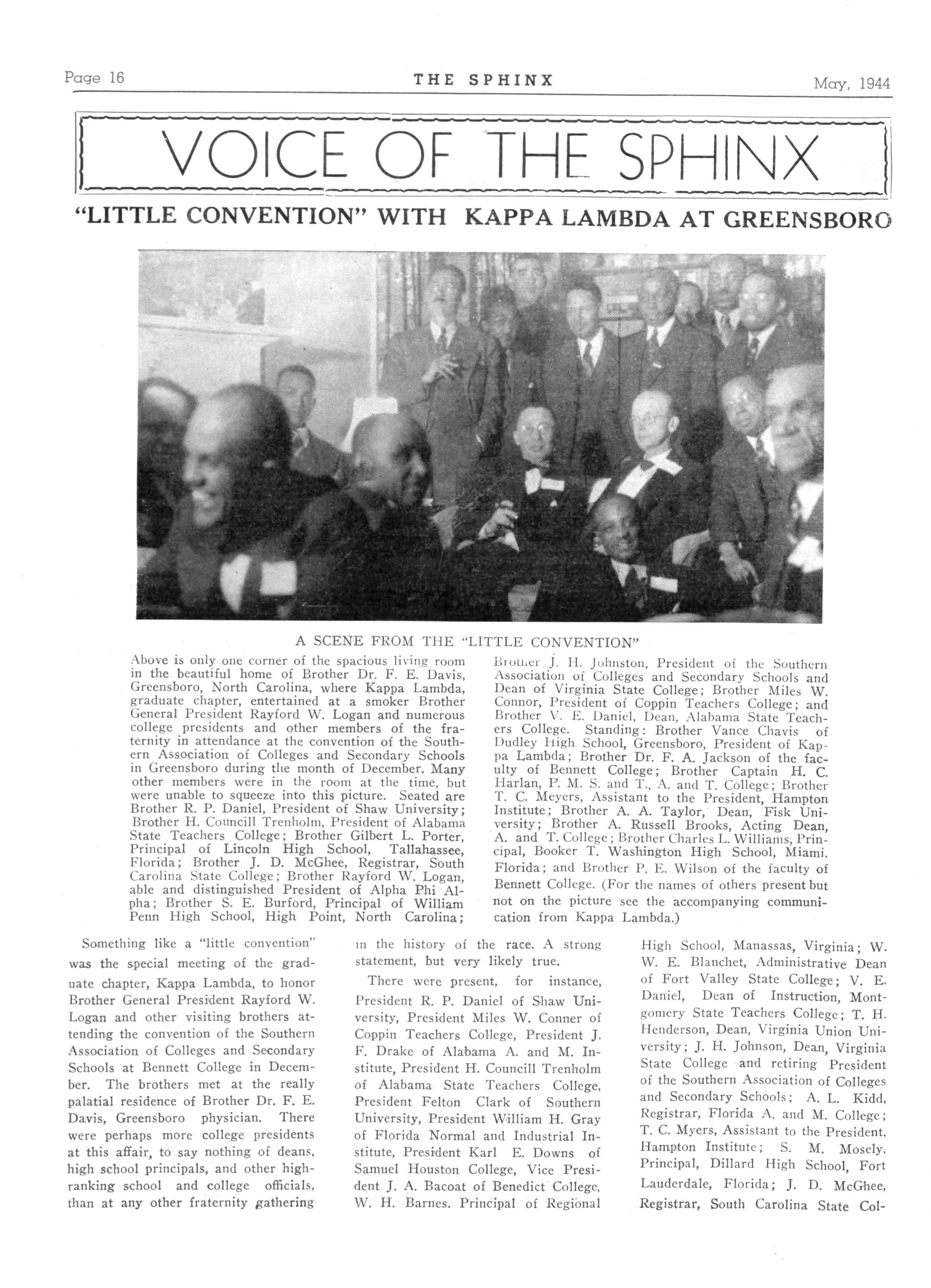 110 KAPPA LAMBDA—Greensboro, N C; President, Vance H Chavis 1001Benbow Road; Secretary, Frederic A Jackson, 427 Bennett Street