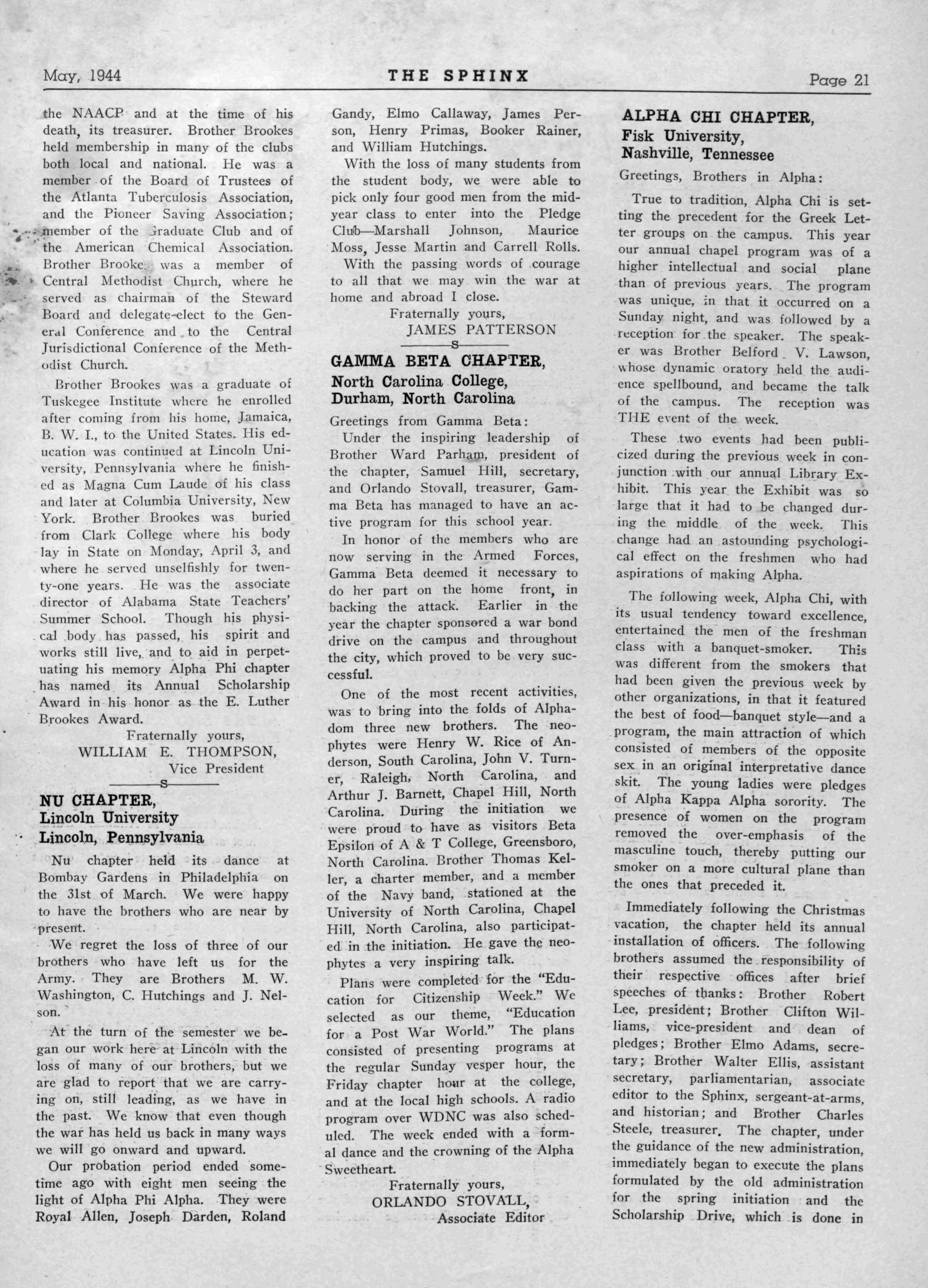 ALPHA CHI—Flsk University, Nashville, Tennessee- PreslUn'lver'sft."168 ^ Pr °° ter : Secretar V- ClarenceTpIyne^FUk •ALPHA PSI—Lincoln University, Jefferson Citv Mo • Prp»ident, Alphonse E Ellis, Allen Hall Lincoln Um'v^S'tv Sec! S^ 1 ? ' William.McCoy Allen Hall, Lincoln Unlversltv