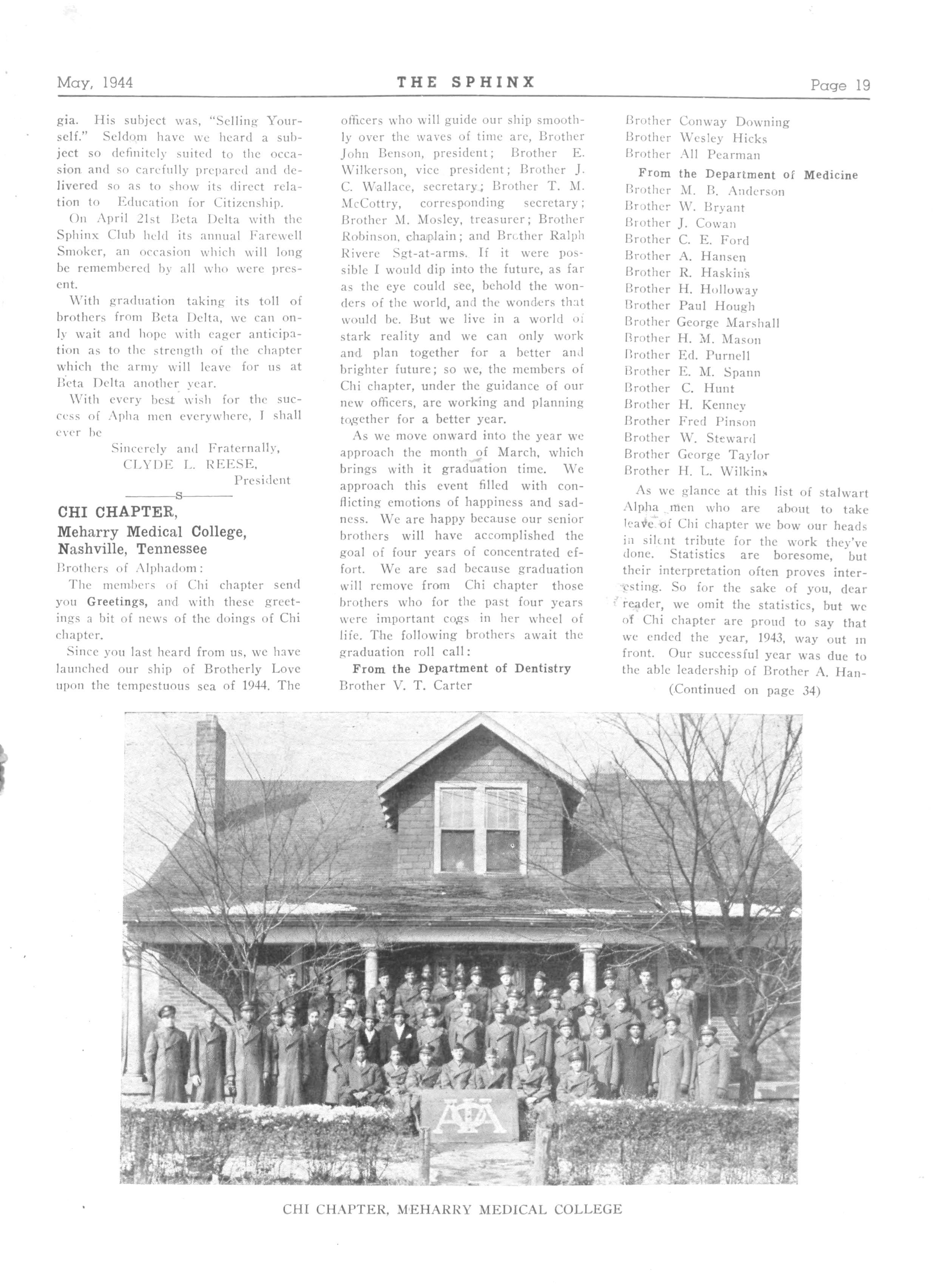 21 CHI—Meharry Medical College, Nashville, Tenn.: president, Axel Hanson, Jr.; Cor. Secretary, Edward L. Wllkerson, Meharry Medical College