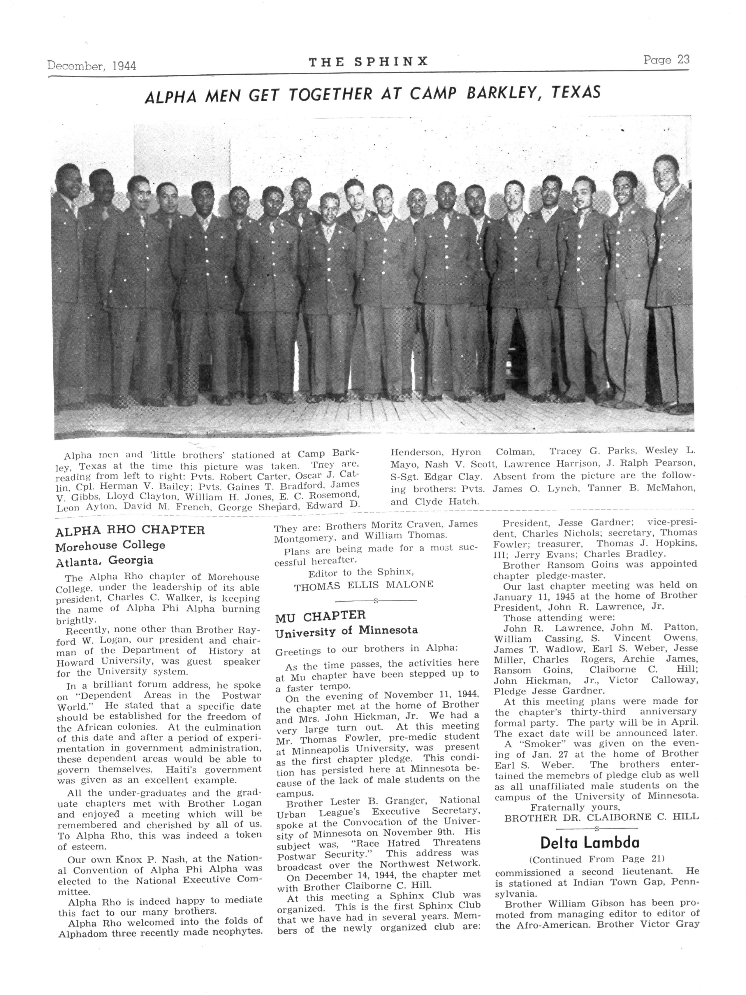 38 ALPHA RHO—Morehouse College, Atlanta Ga.; President, Wm S Gandy: Secretary, Charles C Walker, Morehouse College, Atlanta, Ga