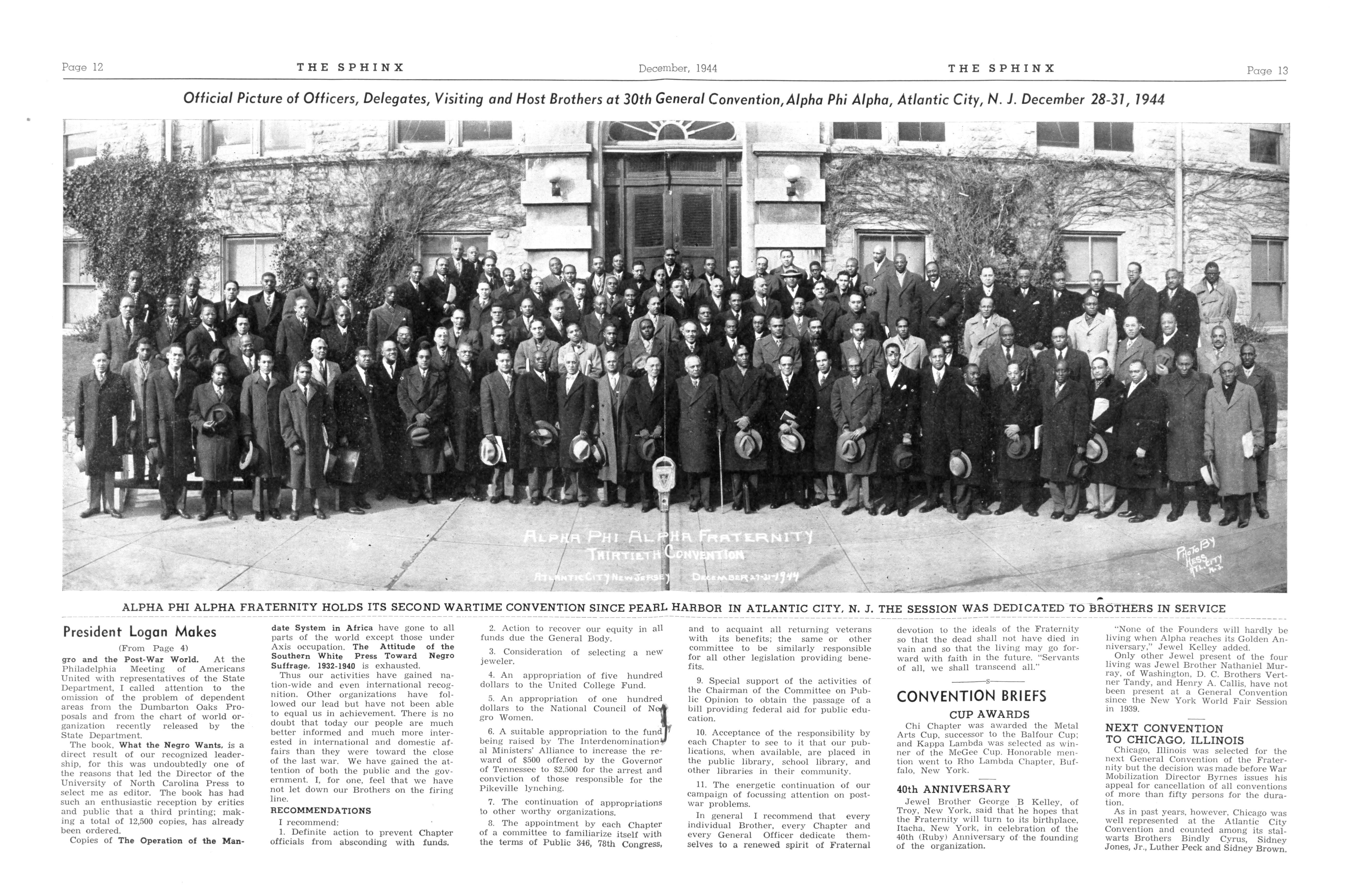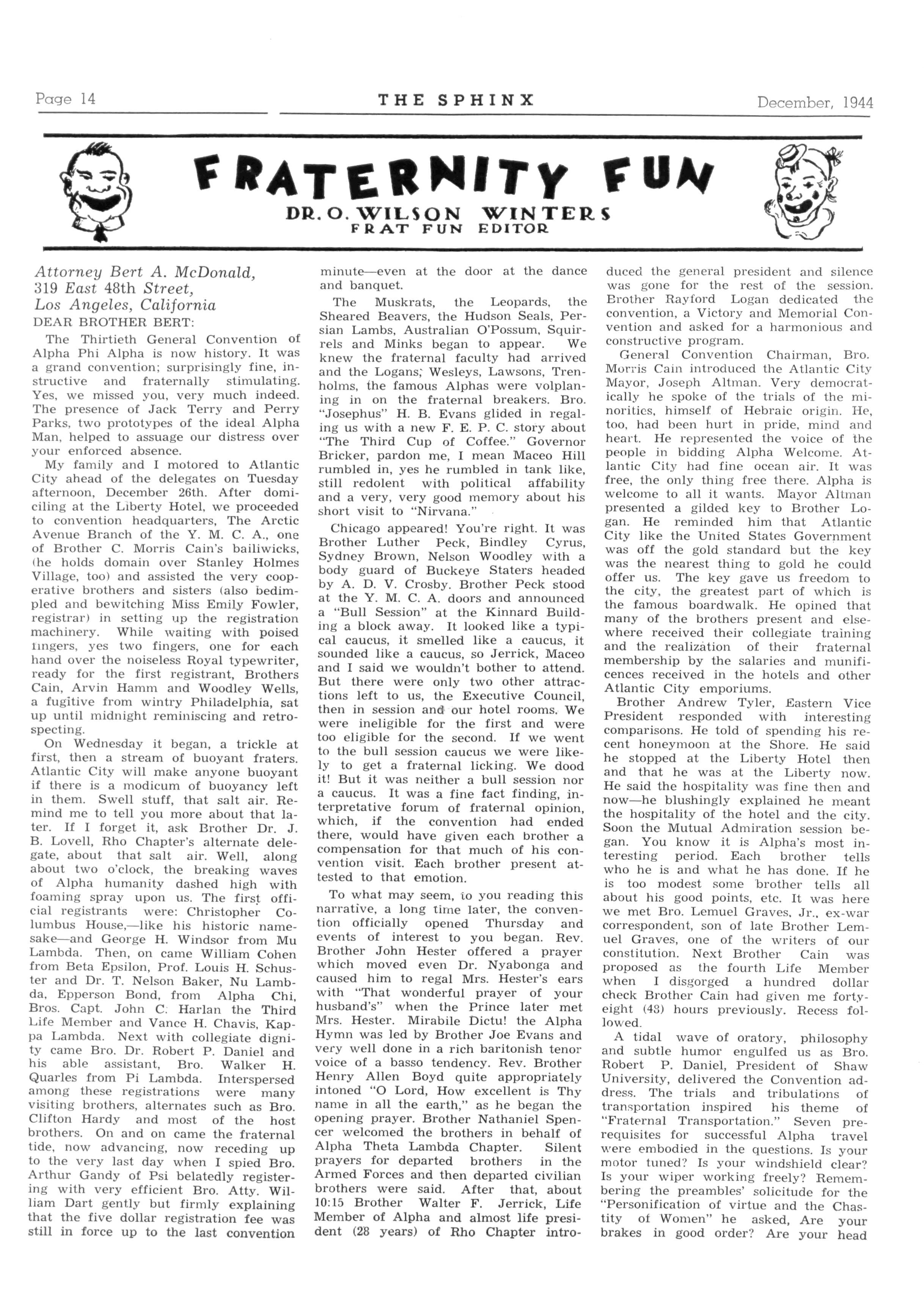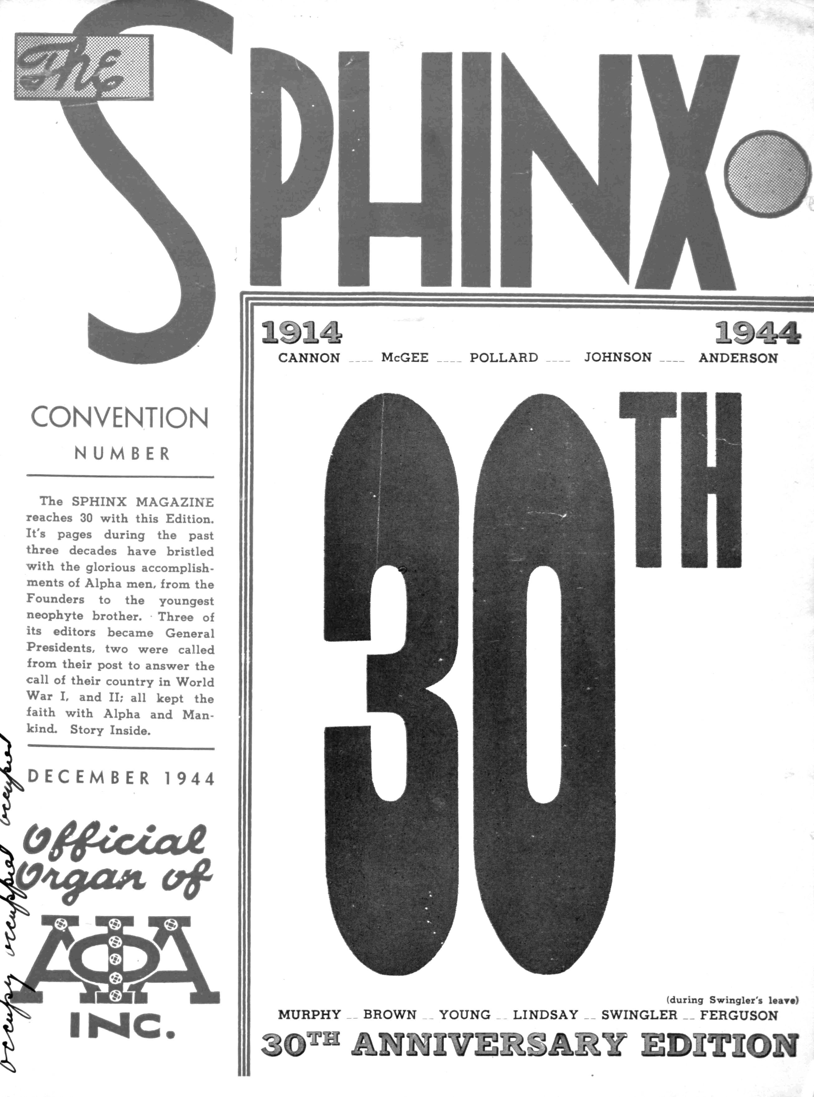 The SPHINX MAGAZINE reaches 30 with this Edition. It's pages during the past three decades have bristled with the glorious accomplishments of Alpha men, from the Founders to the youngest neophyte brother. Three of its editors became General Presidents, two were called from their post to answer the call of their country in World War I, and II; all kept the faith with Alpha and Mankind. Story Inside.