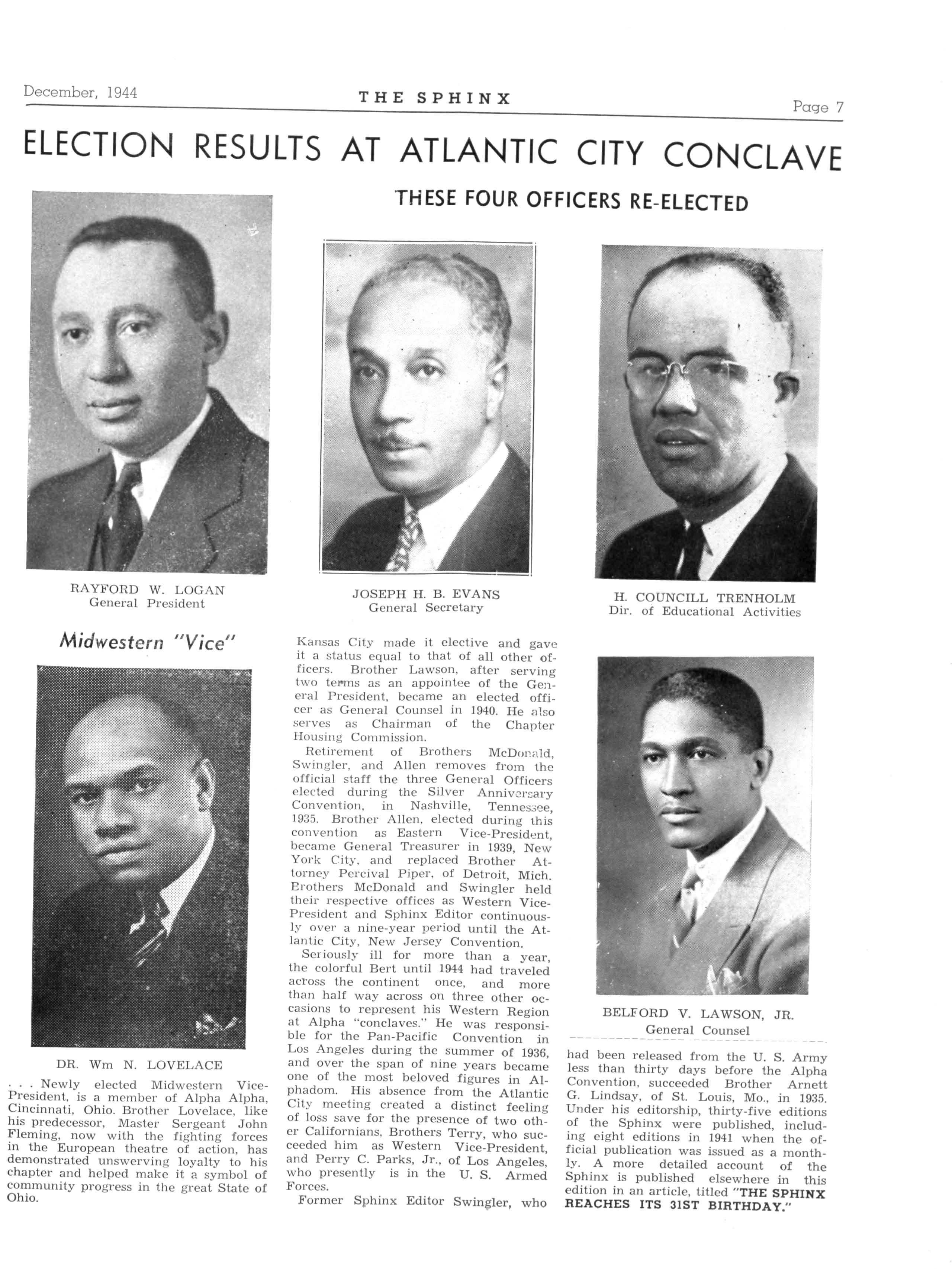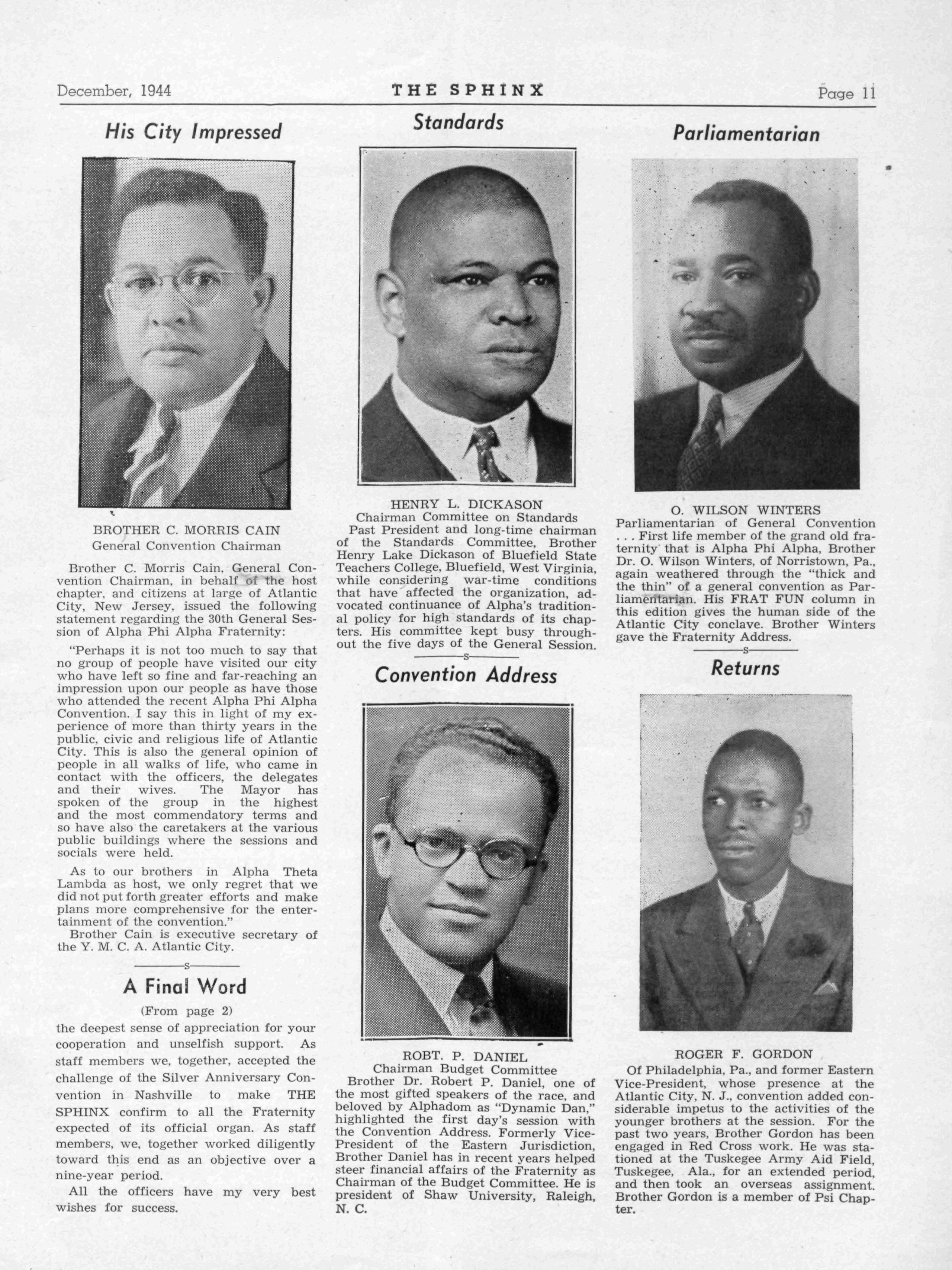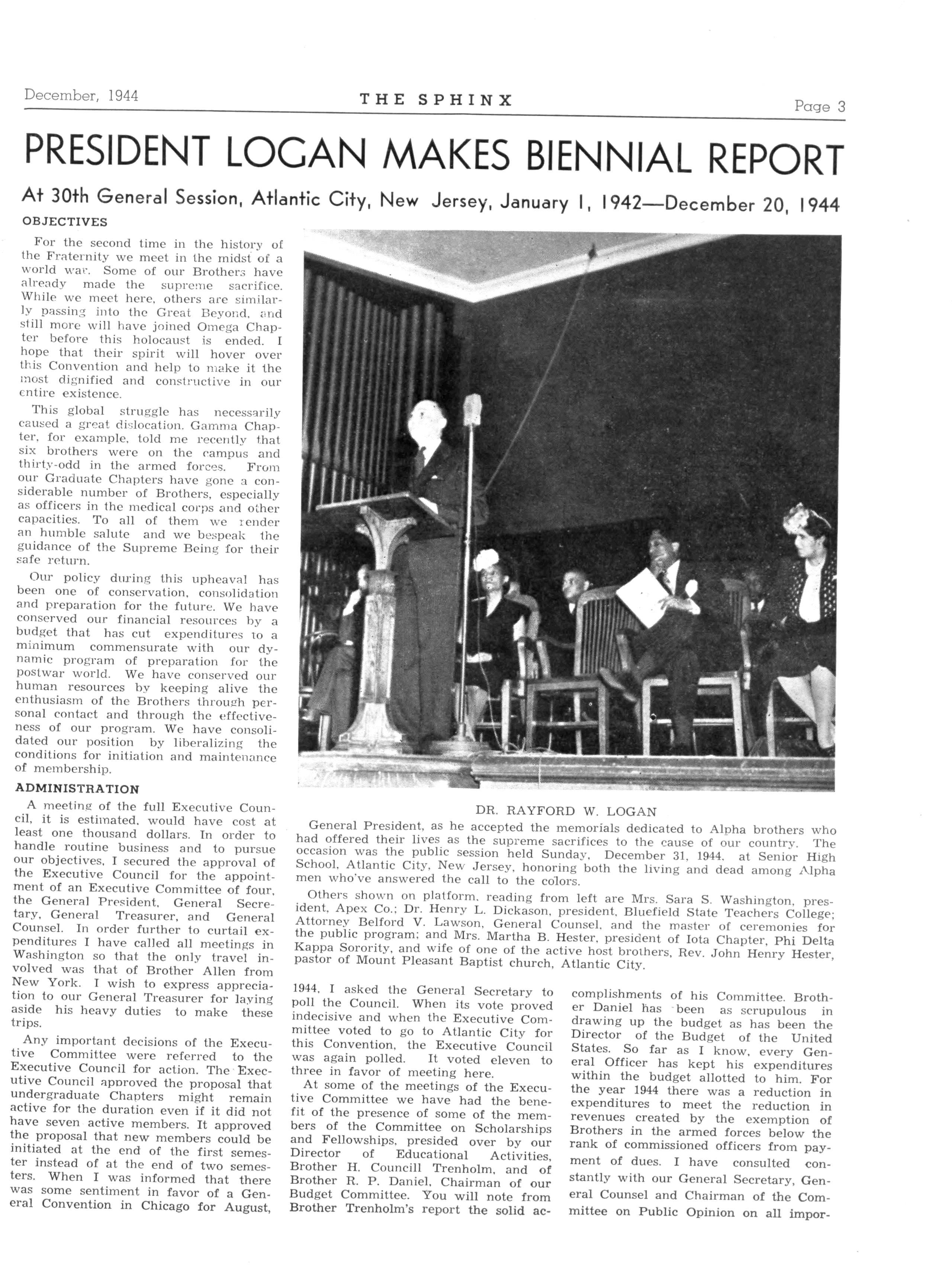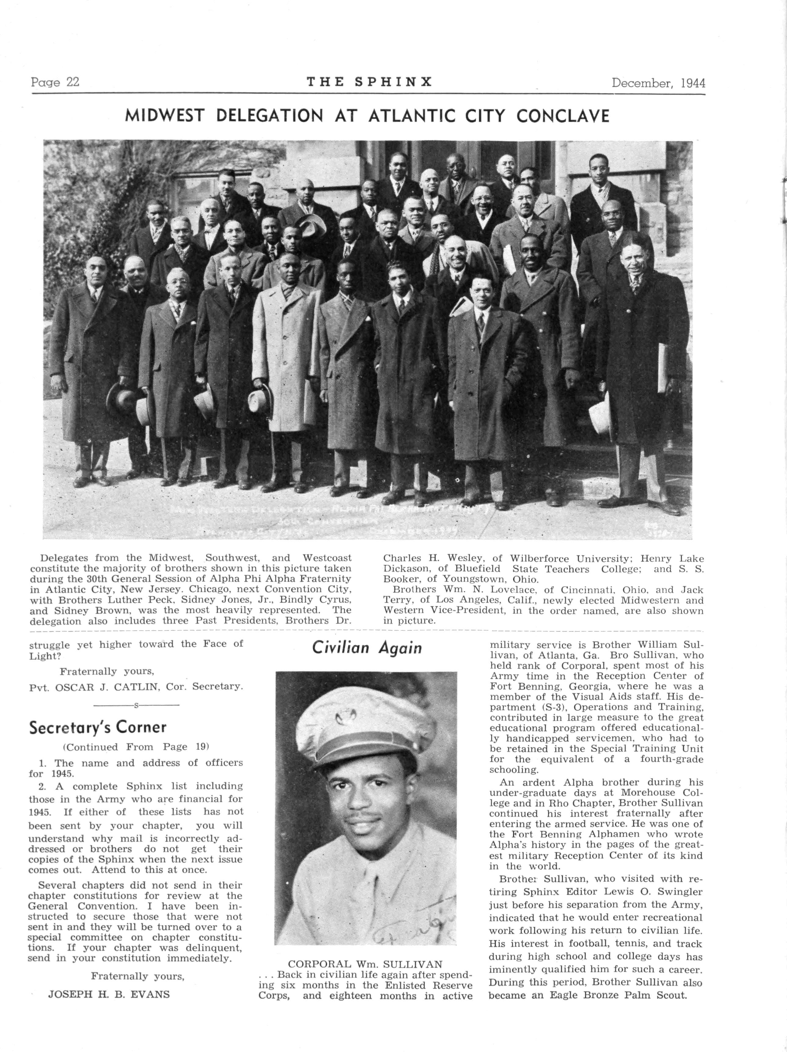 The SPHINX MAGAZINE reaches 30 with this Edition. It's pages during the past three decades have bristled with the glorious accomplishments of Alpha men, from the Founders to the youngest neophyte brother. Three of its editors became General Presidents, two were called from their post to answer the call of their country in World War I, and II; all kept the faith with Alpha and Mankind. Story Inside.