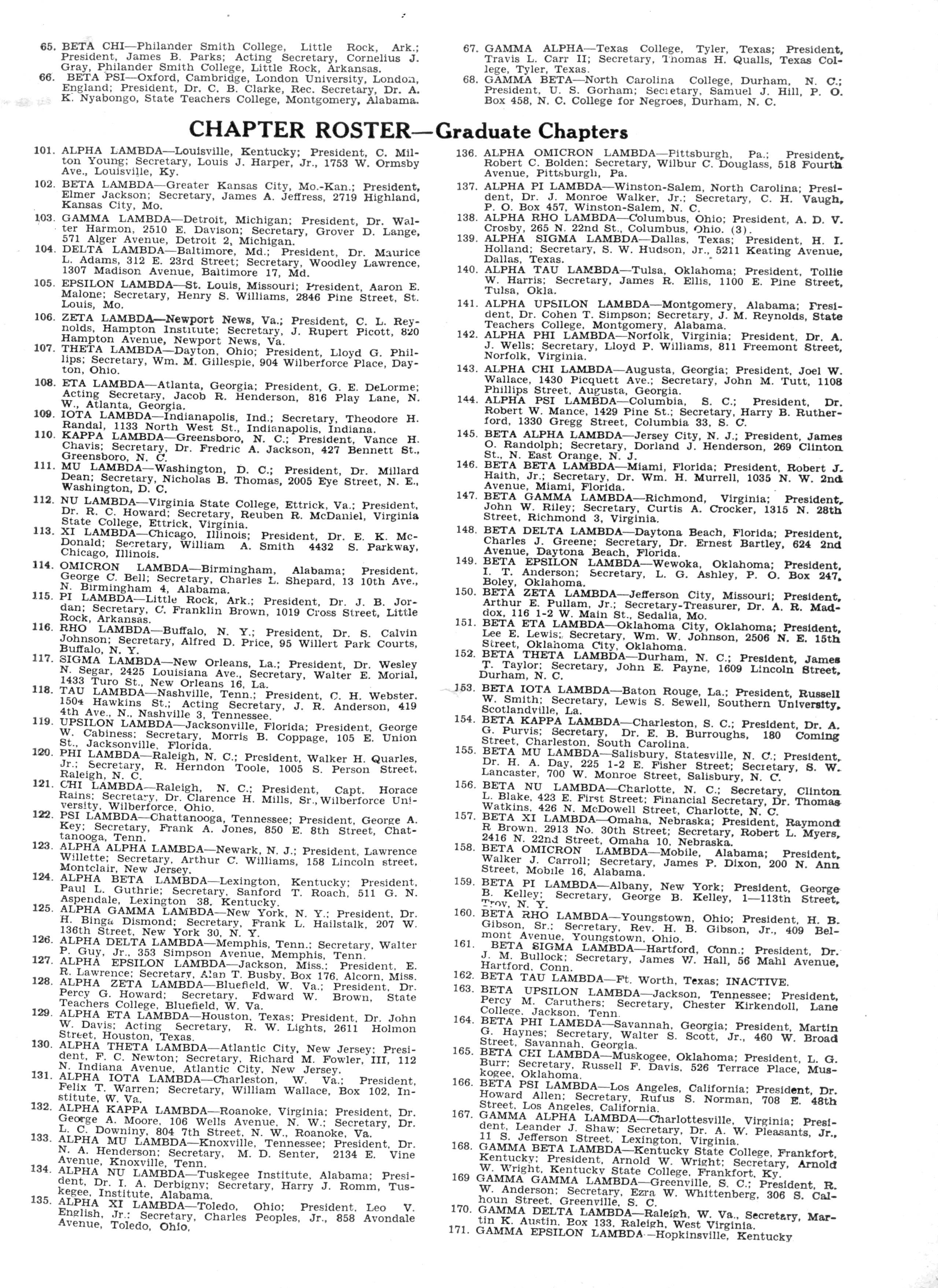 BETA LAMBDA—Greater Kansas City, Mo.-Kan.; President, Elmer Jackson; Secretary, James A Jeffress, 2719 Highland, Kansas City, Mo