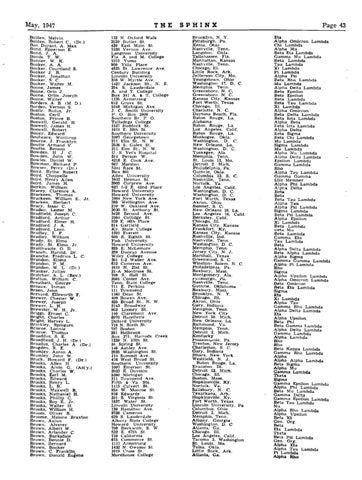 SPHINX B r o o k l y n , N . Y. Pittsburgh. Pa. X e n i a . Ohio Nashville, Tenn. L a n g s t o n . Okla. Tallahassee, Fla. Manhattan, Kansas Nashville, Tenn. Chicago, 111. L i t t l e Rock, A r k . J e f f e r s o n City. Mo. Y o u n g s t o w n , Ohio W a s h i n g t o n 17, D. C. Memphis, Tenn. G r e e n s b o r o , N . C. G r e e n s b o r o . N . C. K a n s a s City, K a n s a s Fort Worth, Texas Chicago. 111. C h a r l o t t e , N . C. D a y t o n a B e a c h . Fla. Baton Rouge, La. Alabama Baton Rouge, La. Los A n g e l e s . Calif. B a t o n Rouge, L a . M u s k o g e e . Okla. W a s h i n g t o n . D. C. New Orleans. La. W a s h i n g t o n , D . C. T u s k e g e e . Ala. Memphis, Tenn. St. L o u i s 13, Mo. D e t r o i t 2, Mich. Philadelphia, Pa. G u t h r i e , Okla. C o l u m b i a 13. S. C. Nashville. Tenn. Norfolk. Va. Los Angeles. Calif. W a s h i n g t o n , D. C. W a s h i n g t o n , D . C. Fort Worth, Texas A k r o n , Ohio S u m t e r , S. C. N e w O r l e a n s 19. La. Los A n g e l e s 16. Calif. B e r k e l e y . Calif. Chicago, 111. K a n s a s City. K a n s a s Frankfort. Ky. K a n s a s City. K a n s a s Rushville, Ind. Nashville. Tenn. W a s h i n g t o n . D. C. Memphis, Tenn. J e r s e y City. N. J . Marshall, T e x a s G r e e n w o o d , S. C. W i n s t o n - S a l e m . N. C. Philadelphia. Pa. R o x b u r y , Mass. M o n t g o m e r y . Ala. *-iasourgh. Pa. Nashville. Tenn. Guthrie, Oklahoma R o x b u r y . Mass. B r o o k l y n , N . Y. Chicago, 111. A k r o n , Ohio Gary. Indiana Memphis, Tenn. N e w York Citv D e t r o i t 10. Mich. N e w O r l e a n s . La. R i c h m o n d , Va. Memphis, Tenn. Detroit 2, Mich. Kentucky Pniiaaeipnia, Pa. Trenton, New Jersey C h a r l e s t o n , S. C. Gary. Indiana Ithaca. New York Westfield. N . J . Baton Rouge. La. E v a n s t o n , 111. D e t r o i t 12, Mich. Chicago, 111. B o s t o n , Mass. H o p k i n s v i l l e , Ky. Norfolk. Va. S a l i s b u r y , N . C. Texarkana. Ark. Hopkinsville. K y . Fort Worth. Texas Lincoln U n i v e r s i t y , P a C o l u m b u s , Ohio D e t r o i t 2, Mich. Memphis, Tenn. Albany. Georgia Washington. D. C A t l a n t a . Ga. Chicago, III. Los Angeles, Calif. T a c o m a 2. W a s h i n g t o n St. Louis, Mo. Tulsa, O k l a . L i t t l e Rock. A r k . Atlanta, Ga.
