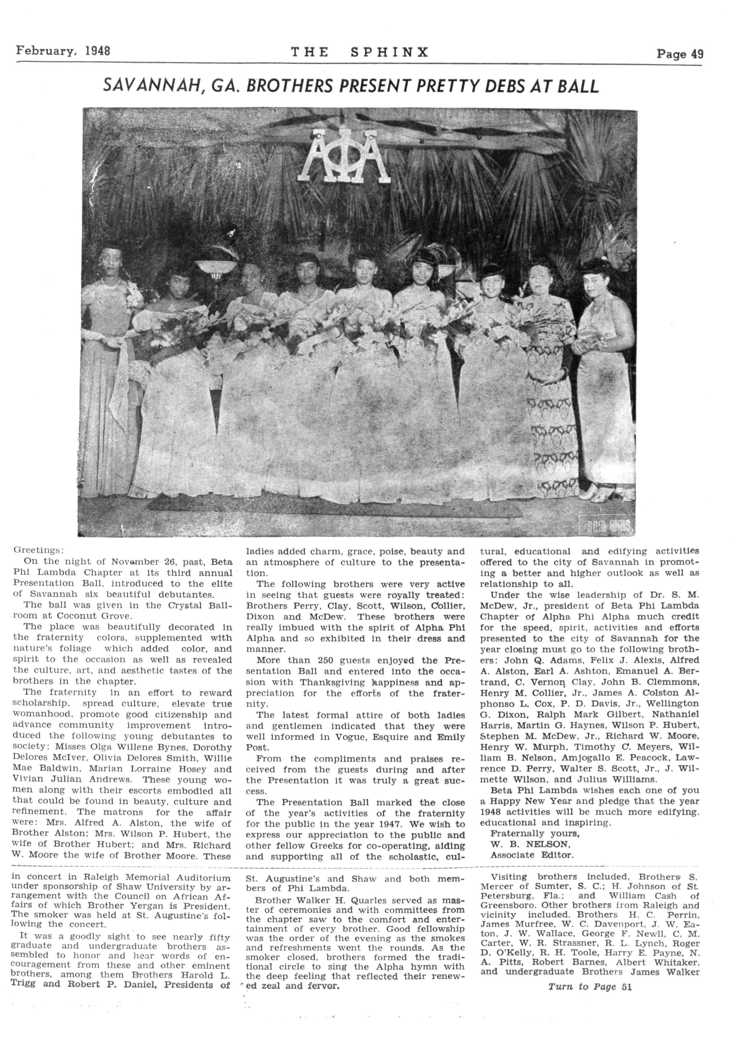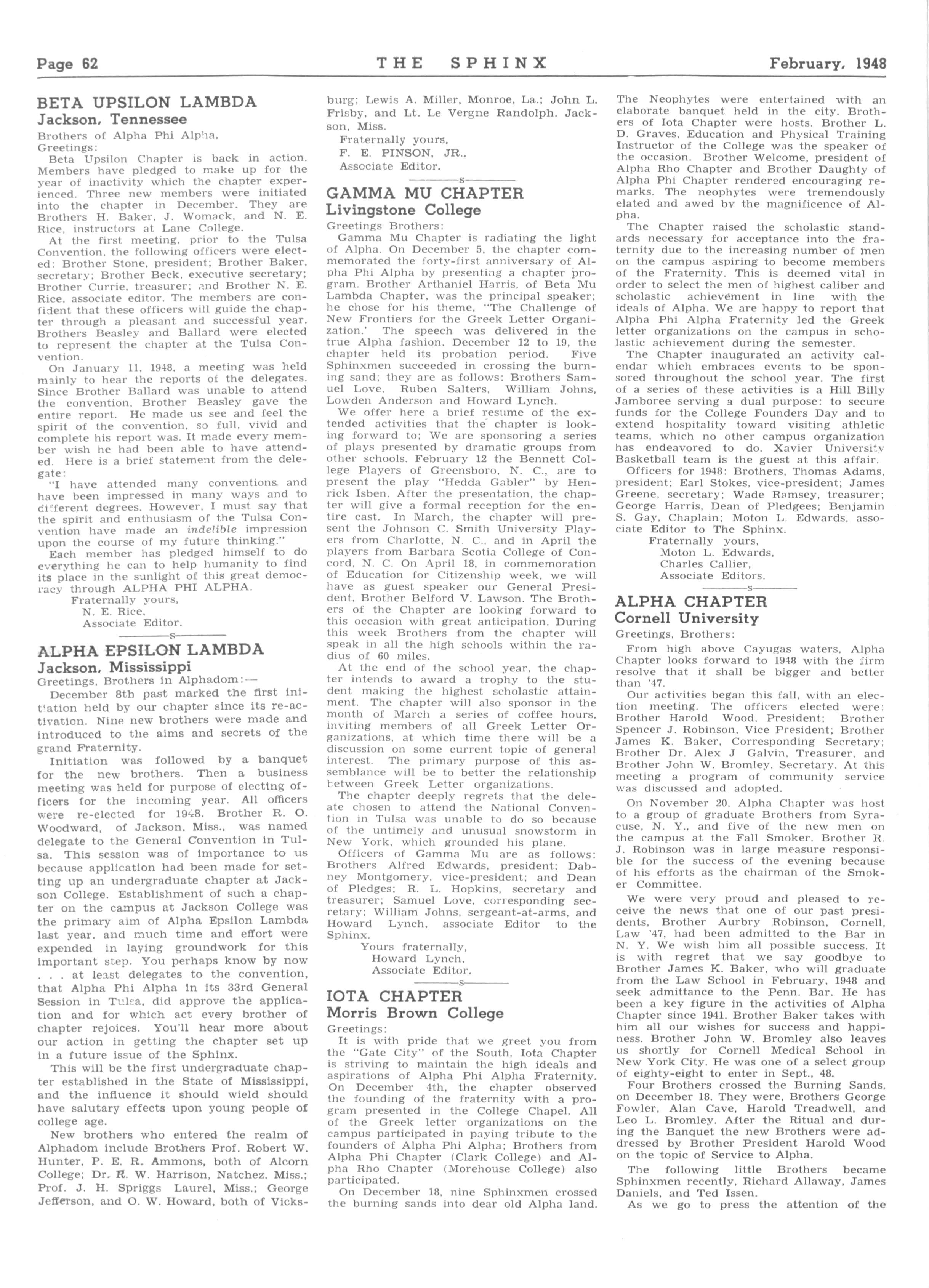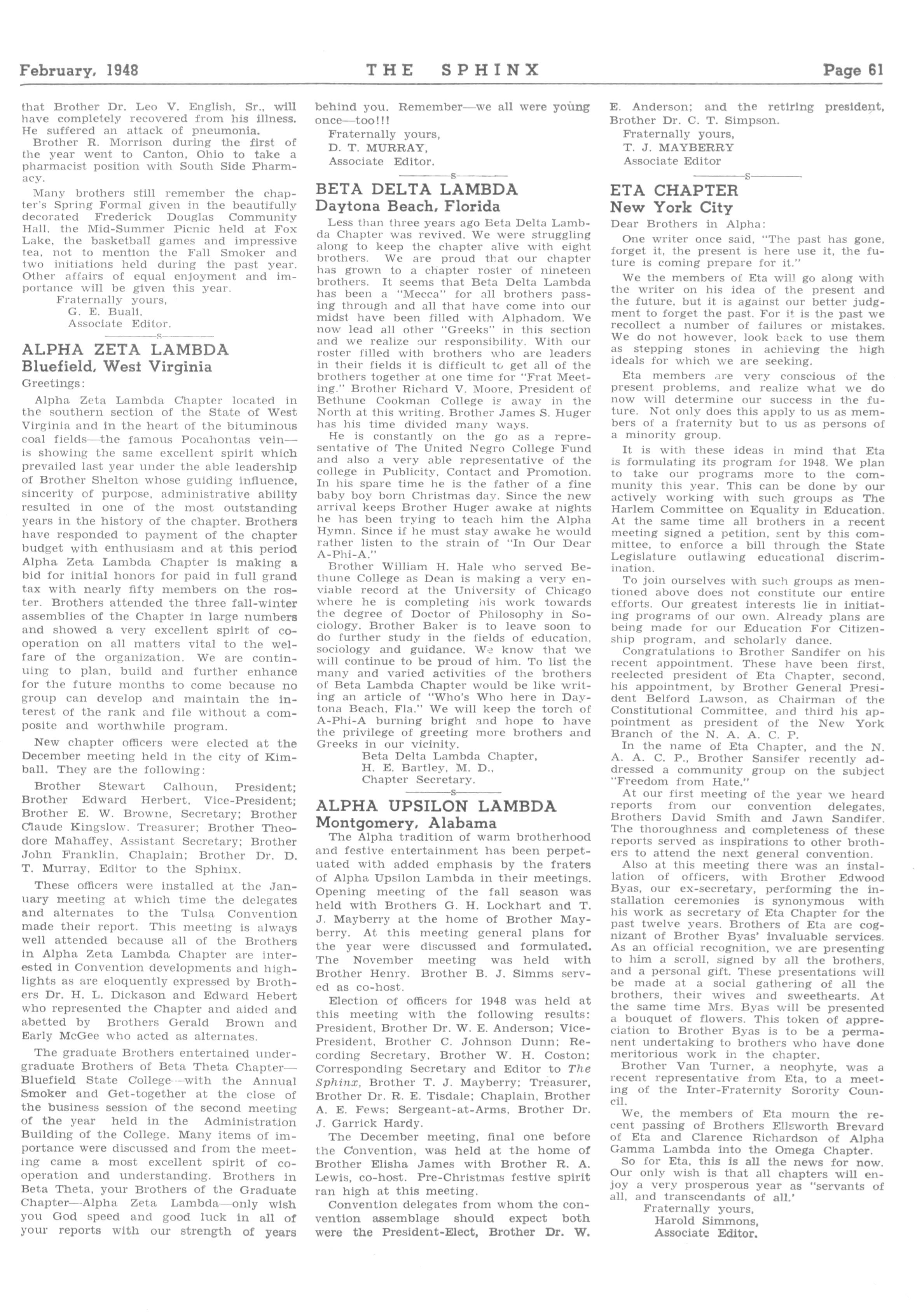 ALPHA BETA—Talladega College Talladega Ala.; President, Robert Lofton, Talladega College Talladega, Ala• Secretary William Johnson, Talladega, Ala