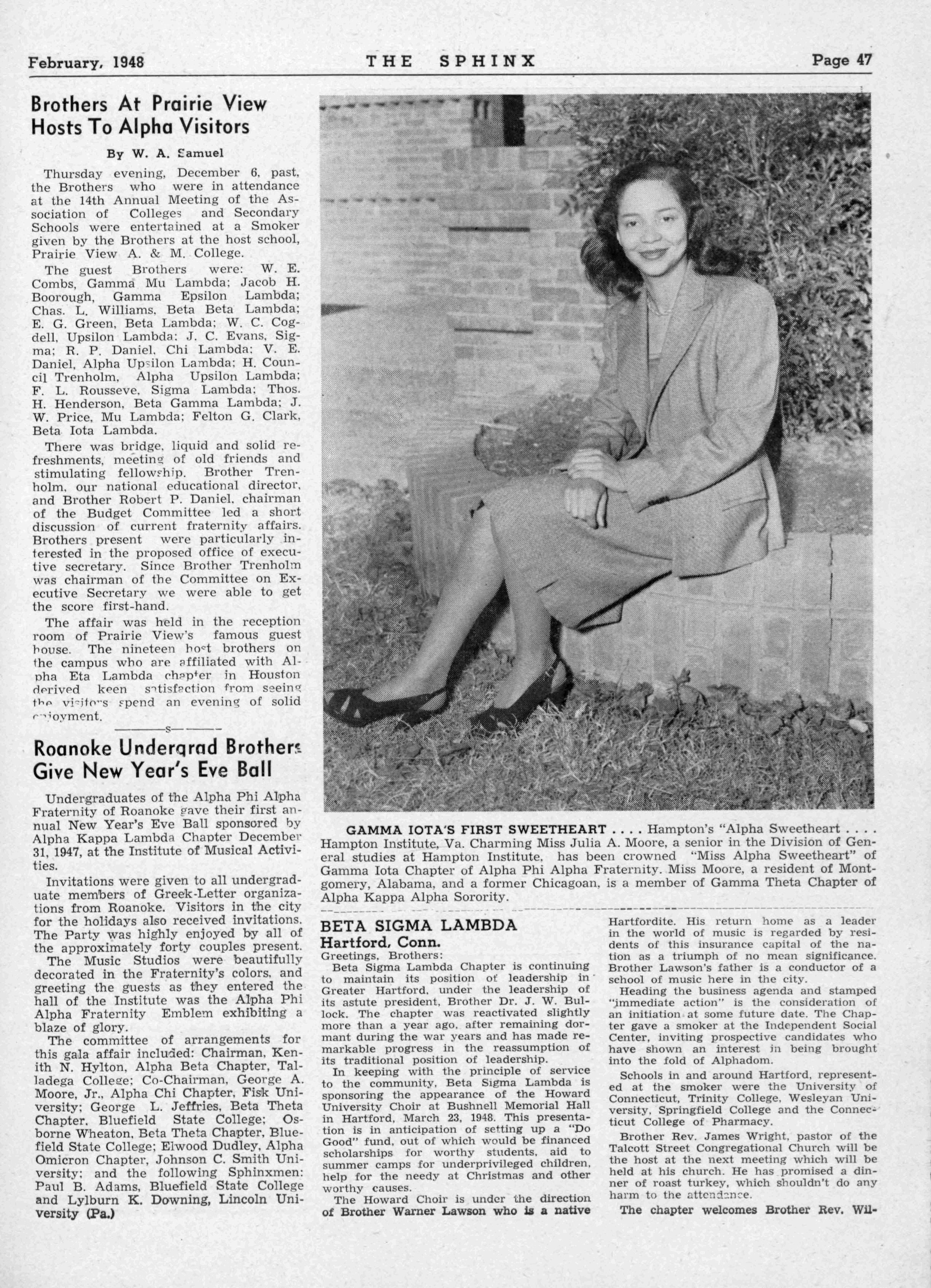 kn 147 BETA GAMMA LAMBDA—Richmond, Va.; President George Peterson 305 1-2 E Leigh St. Richmond Va.; Secretary, Spingarn D Brinkley, 710 N Sixth St. Richmond 19 Va