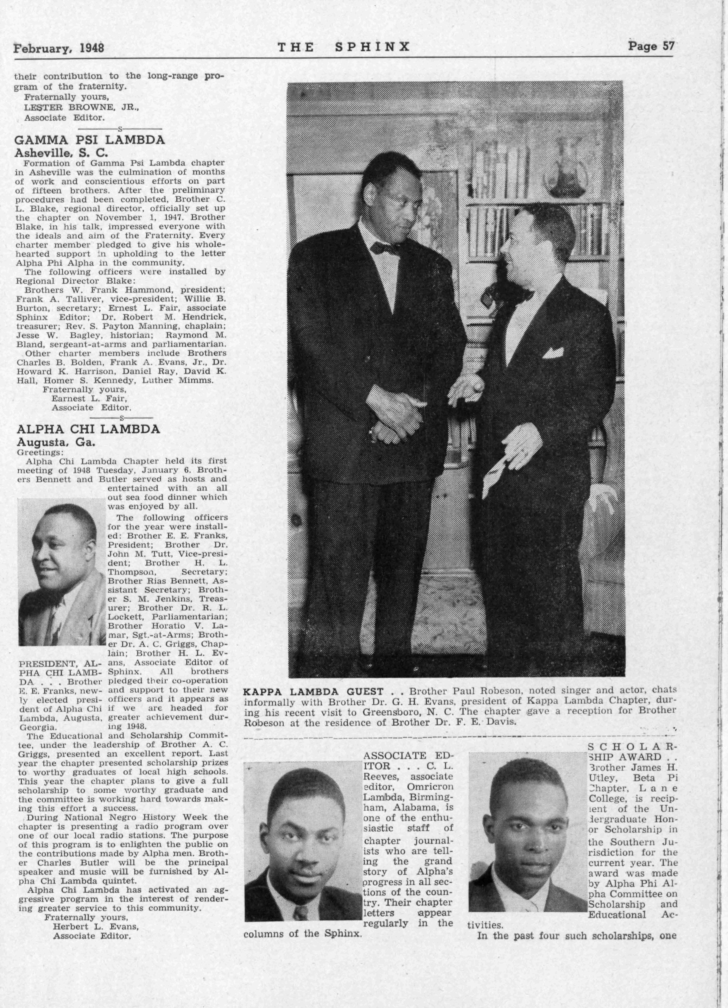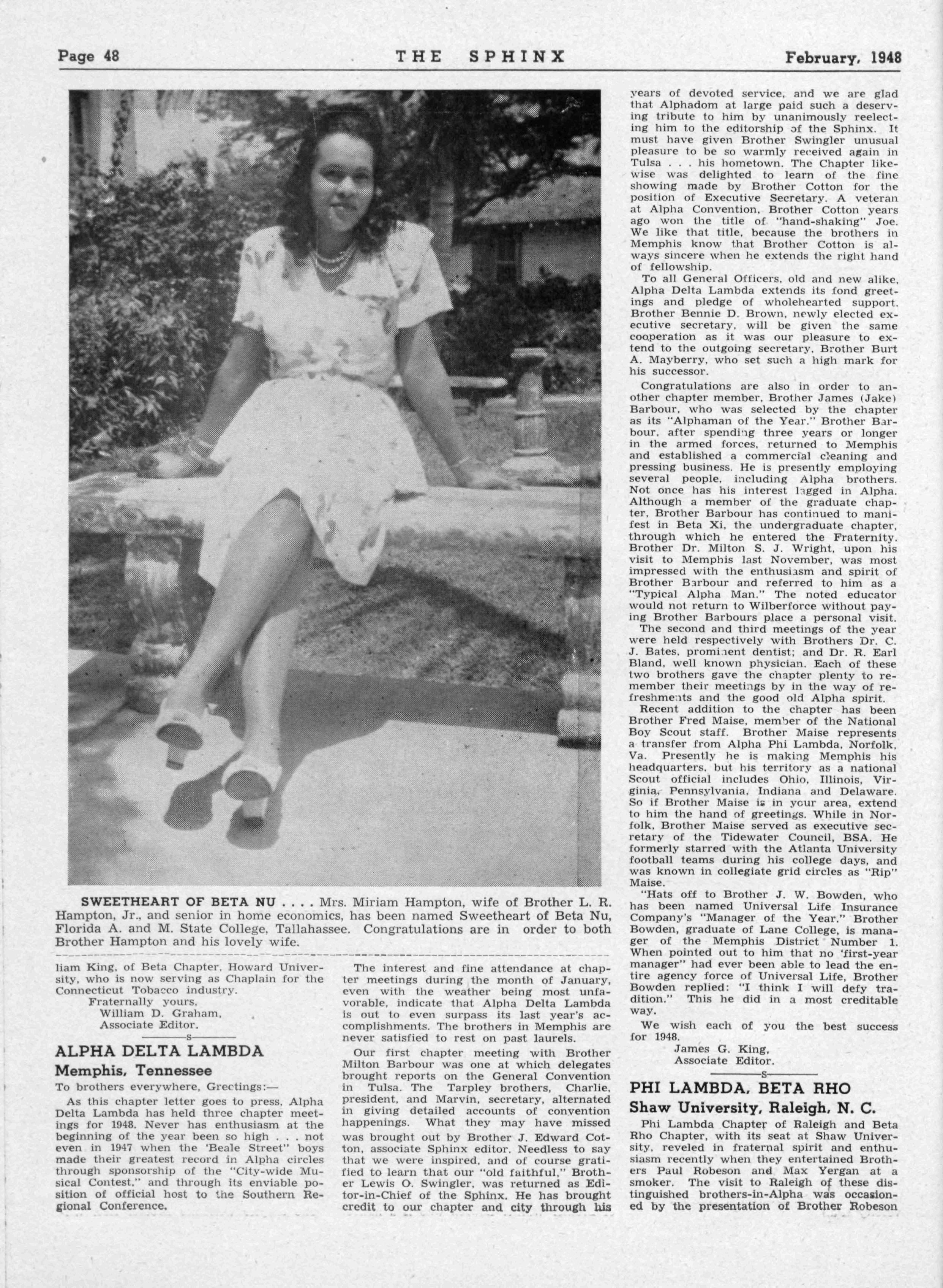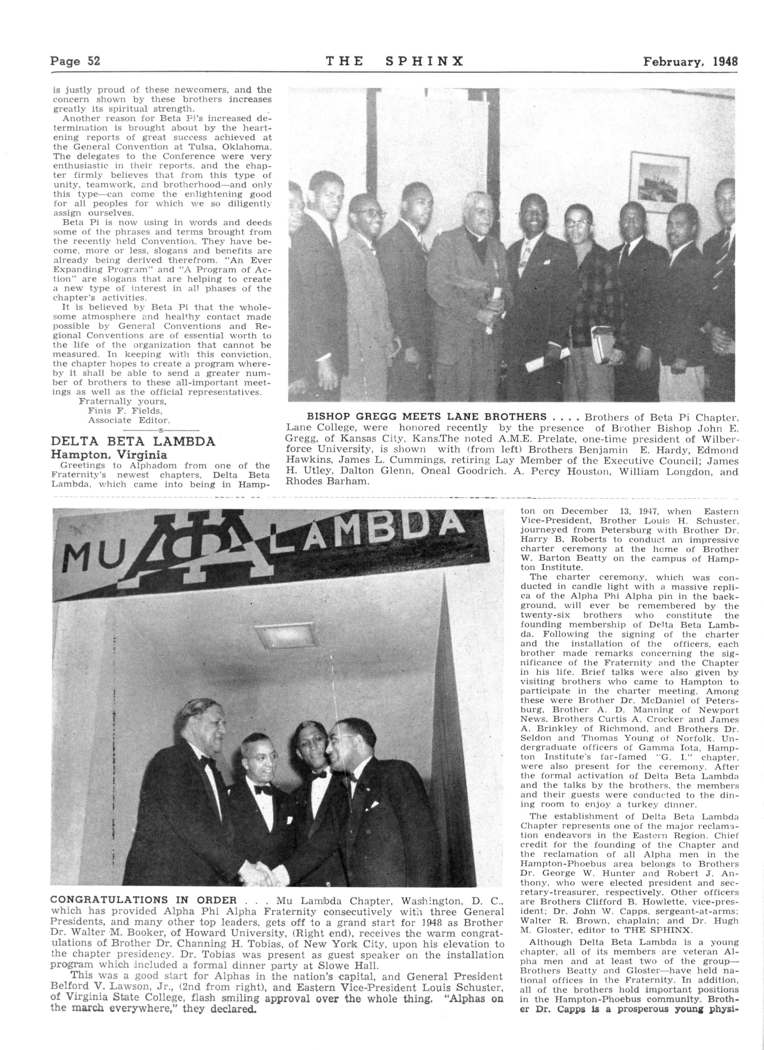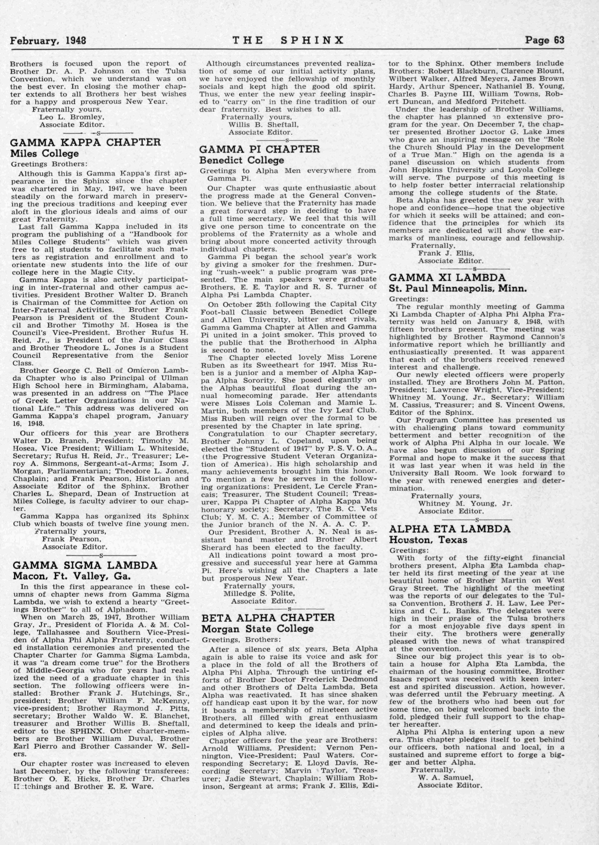 BETA IOTA LAMBDA—Baton Rouge, La.; President, John G Lewis Jr. Box 72 Scotlandville, La.; Secretary Martin L Harvey, Southern Branch P O., Baton Rouge, La