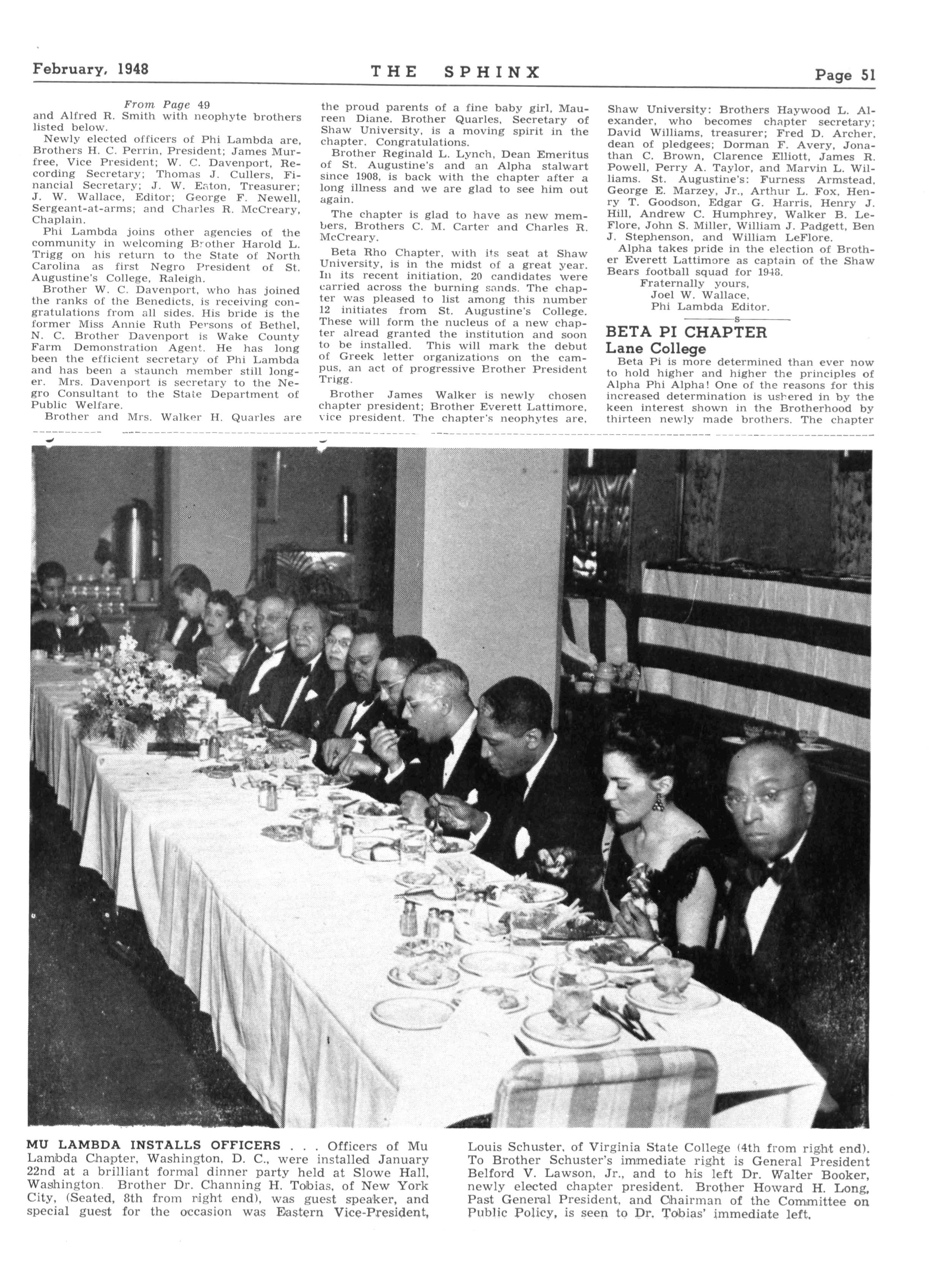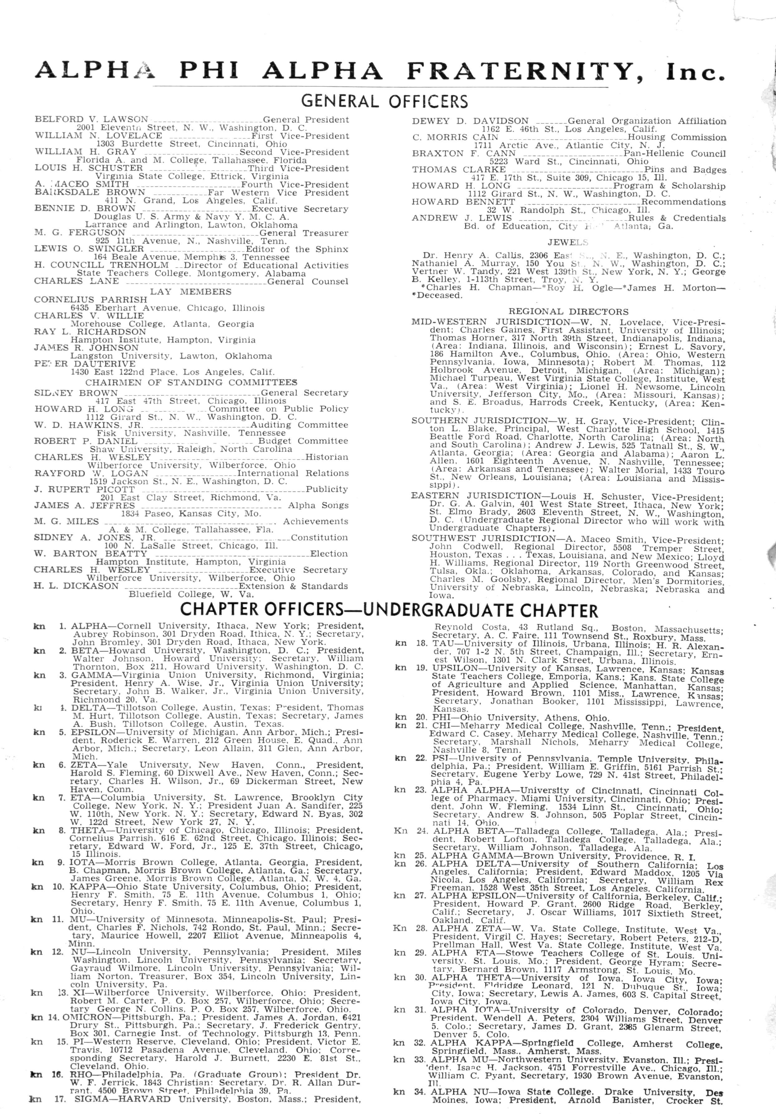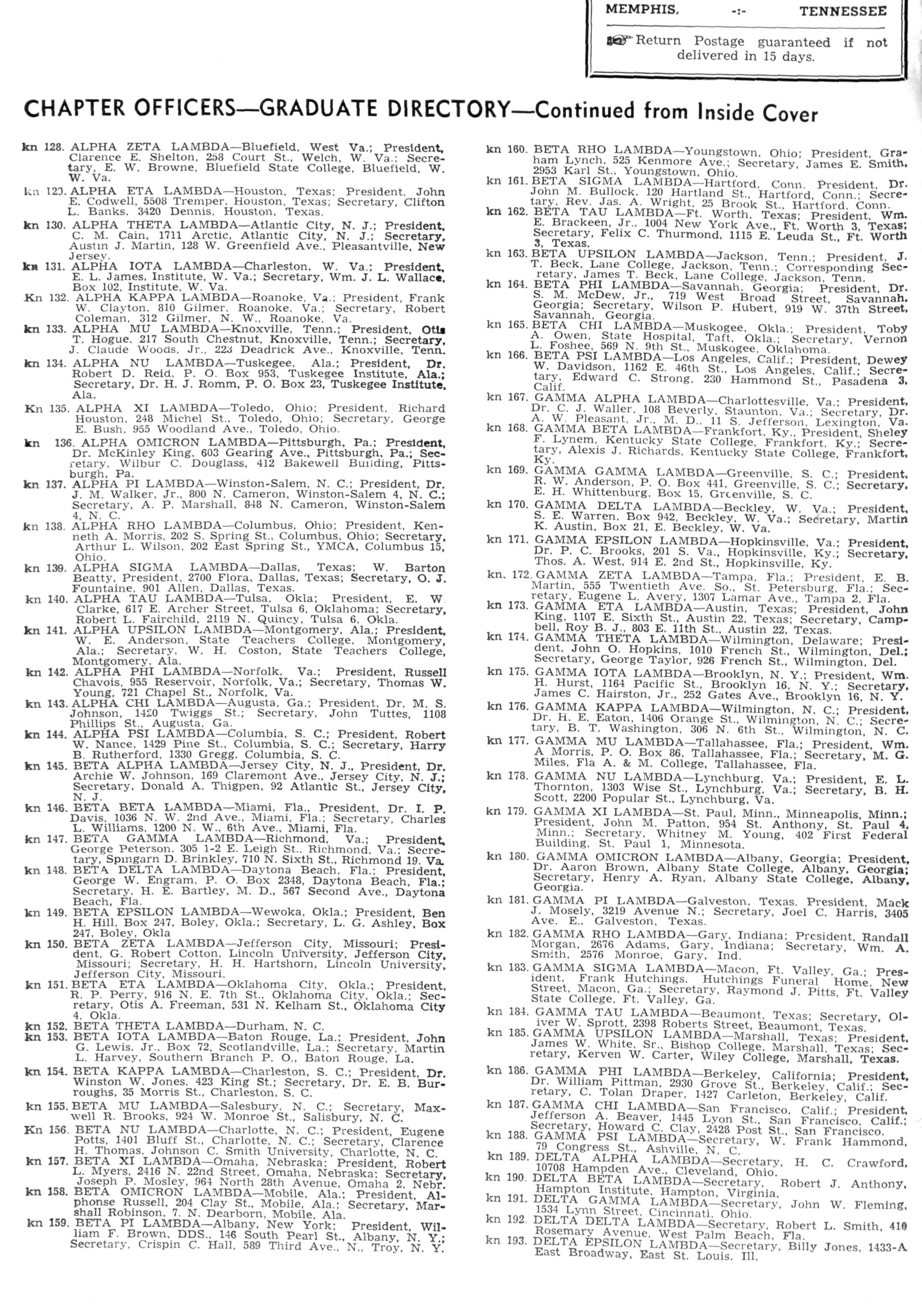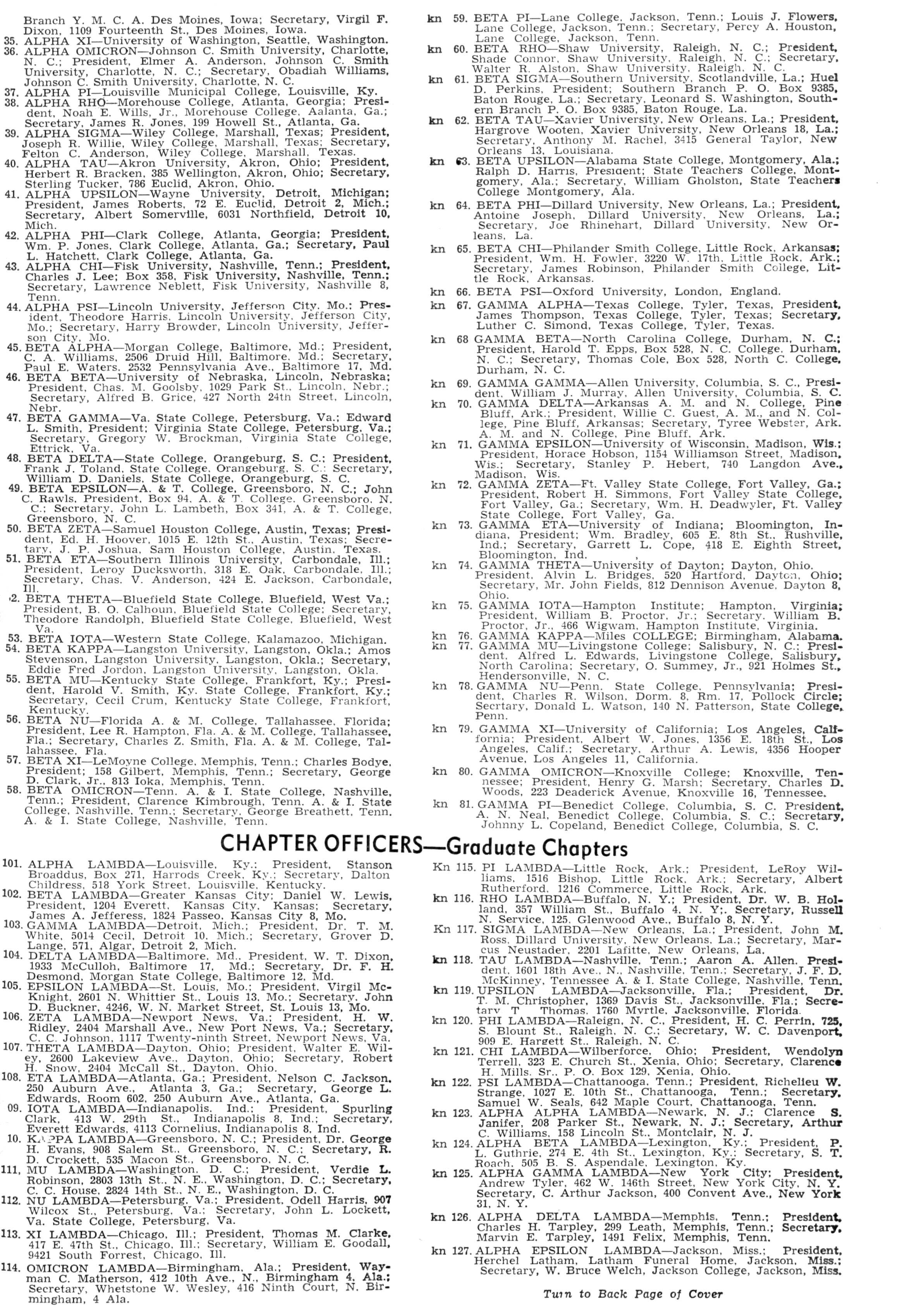 BETA ZETA LAMBDA—Jefferson City, Missouri; President, G Robert Cotton Lincoln University, Jefferson City, Missouri; Secretary, H H Hartshorn, Lincoln University, Jefferson City, Missouri