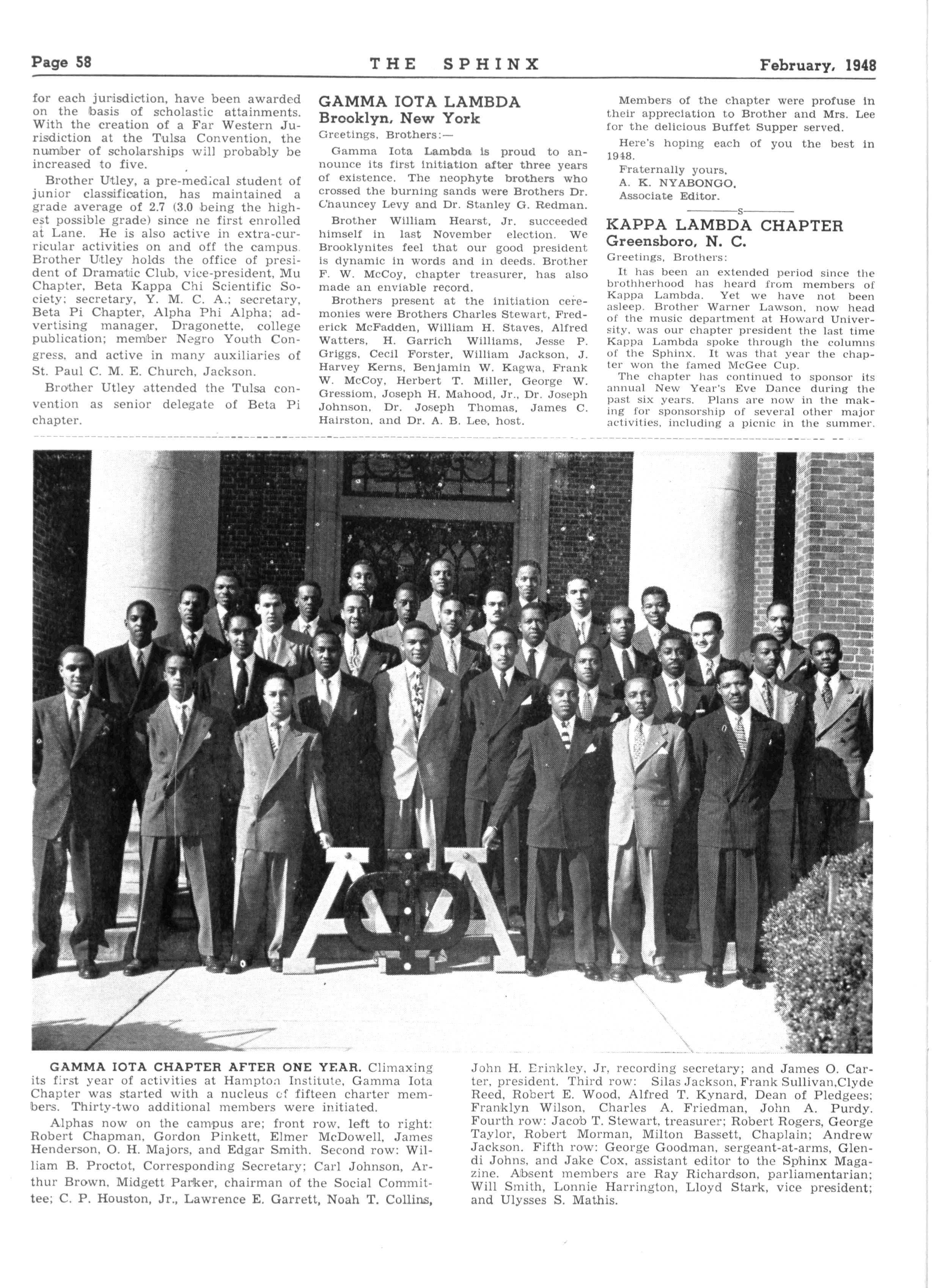 GAMMA IOTA LAMBDA—Brooklyn, N Y.; President, Wm H Hurst, 1164 Pacific St., Brooklyn 16, N Y.; Secretary, James C Hairston, Jr., 252Gates Ave., Brooklyn 16, N Y