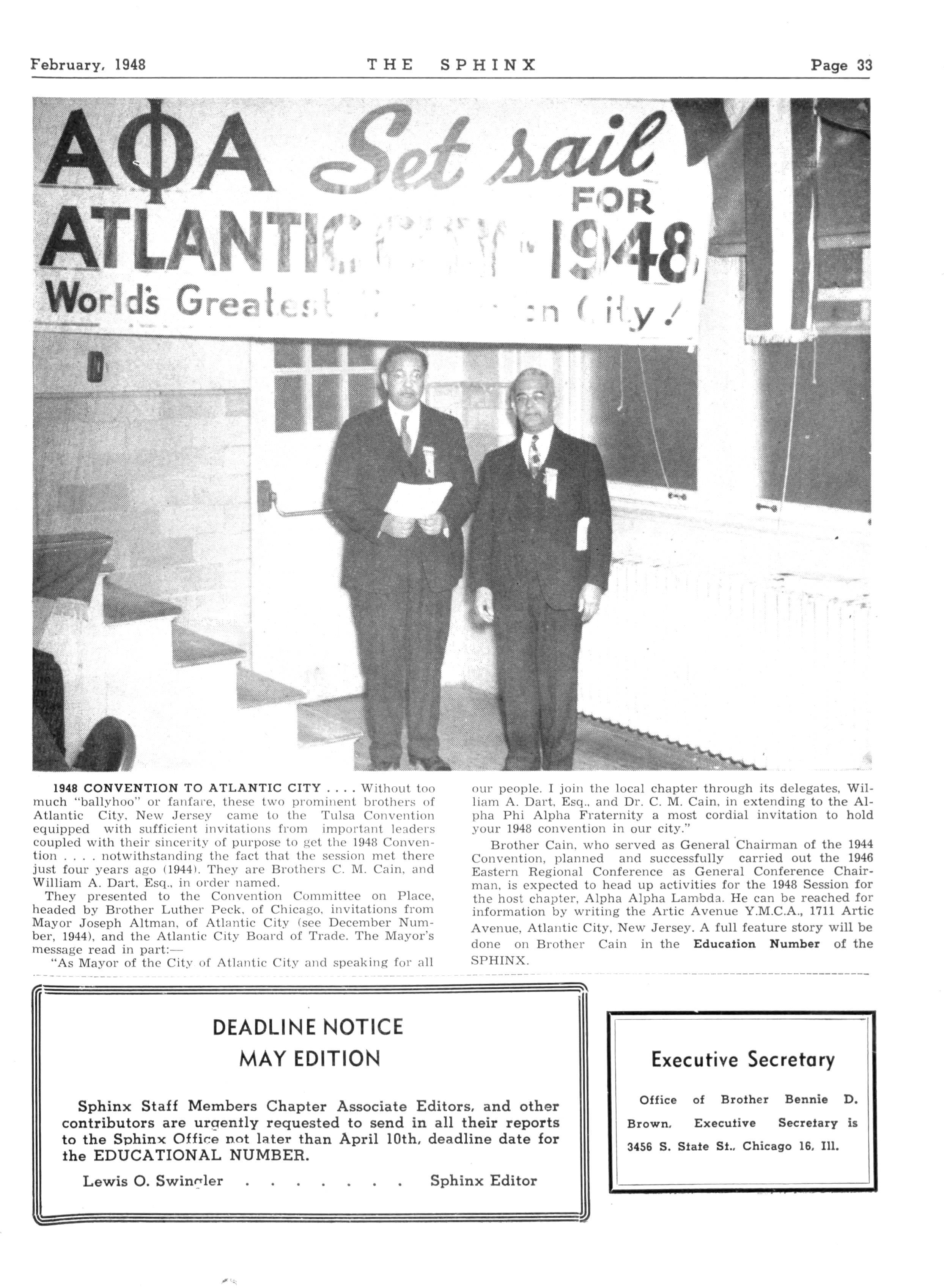 ALPHA THETA LAMBDA—Atlantic City, N J.; President C M Cain, 1711 Arctic Atlantic City, N J.; Secretary Austin J Martin, 128 W Greenfield Ave., Pleasantville, New Jersev
