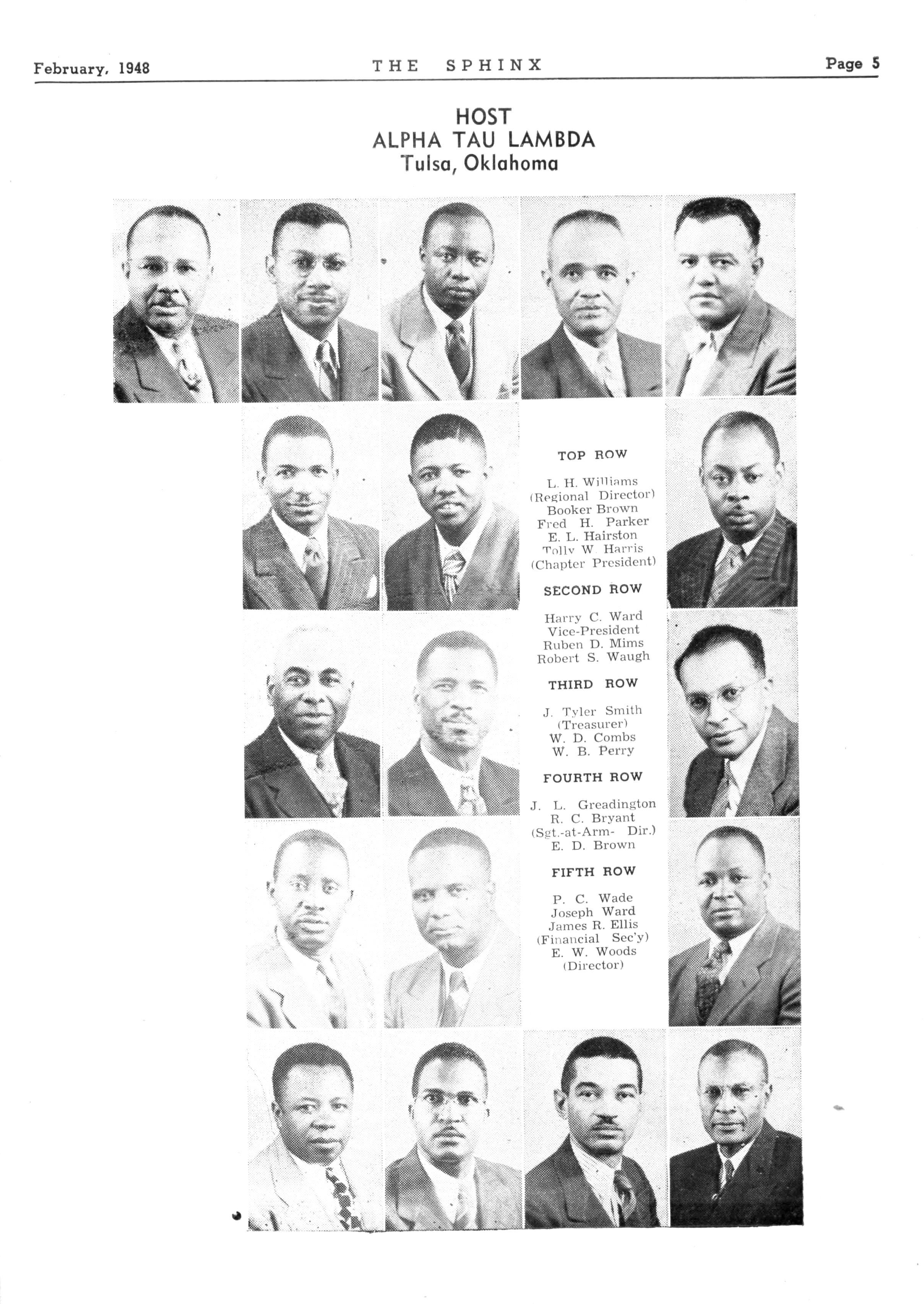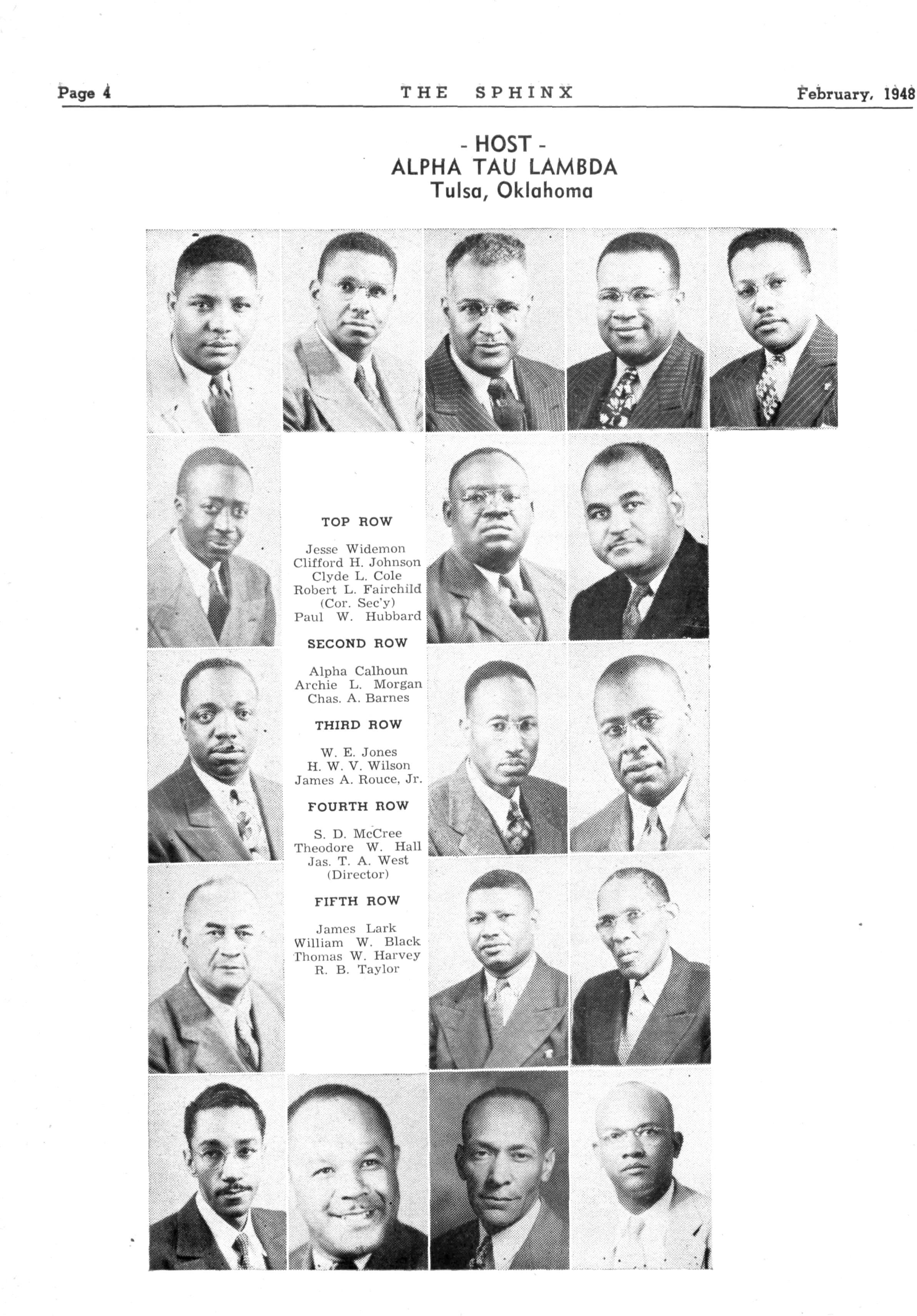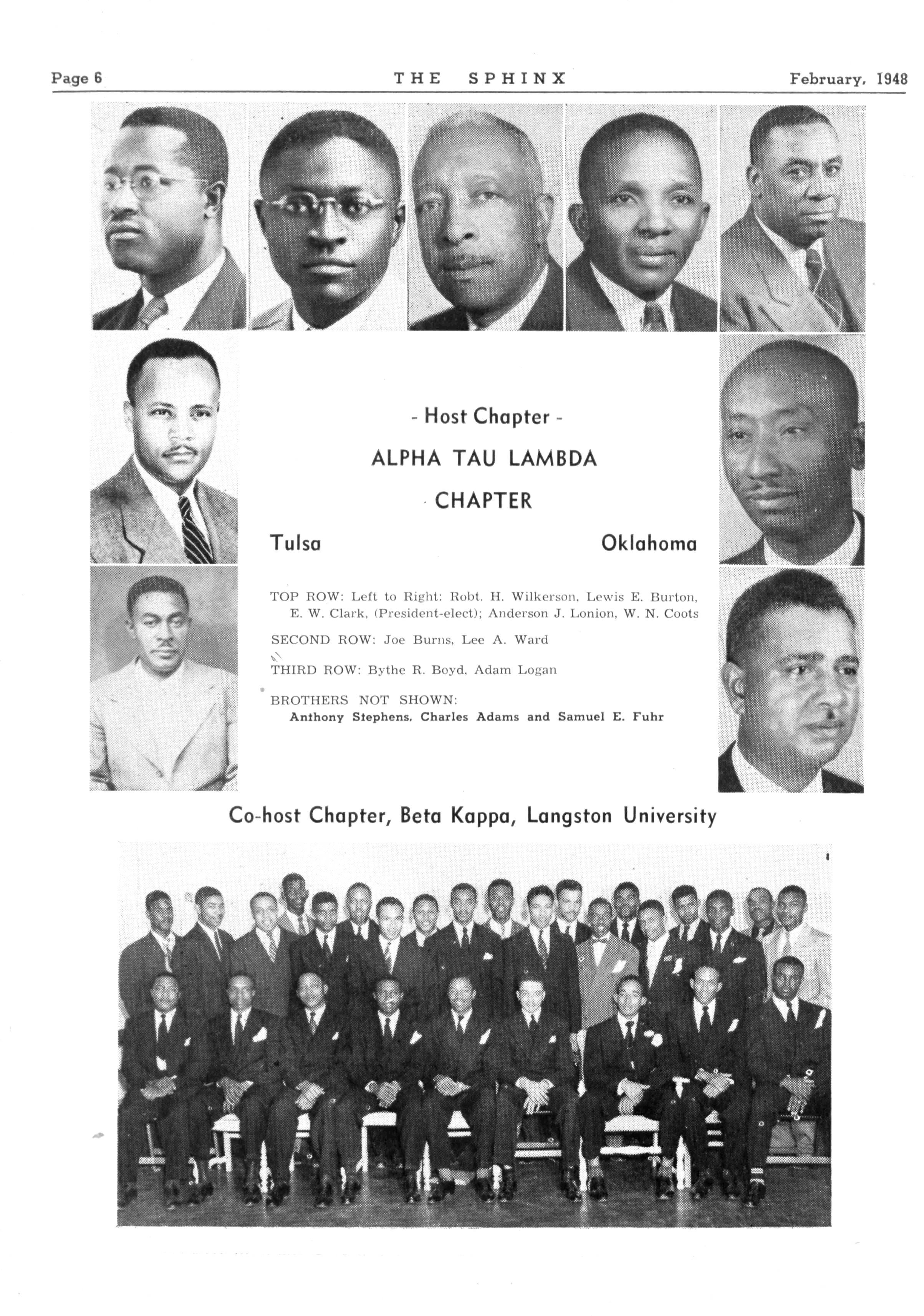 ALPHA TAU LAMBDA—Tulsa Okla; President, E W Clarke, 617 E Archer Street, Tulsa 6 Oklahoma; Secretary, Robert L Fairchild, 2119 N Quincy, Tulsa 6, Okla