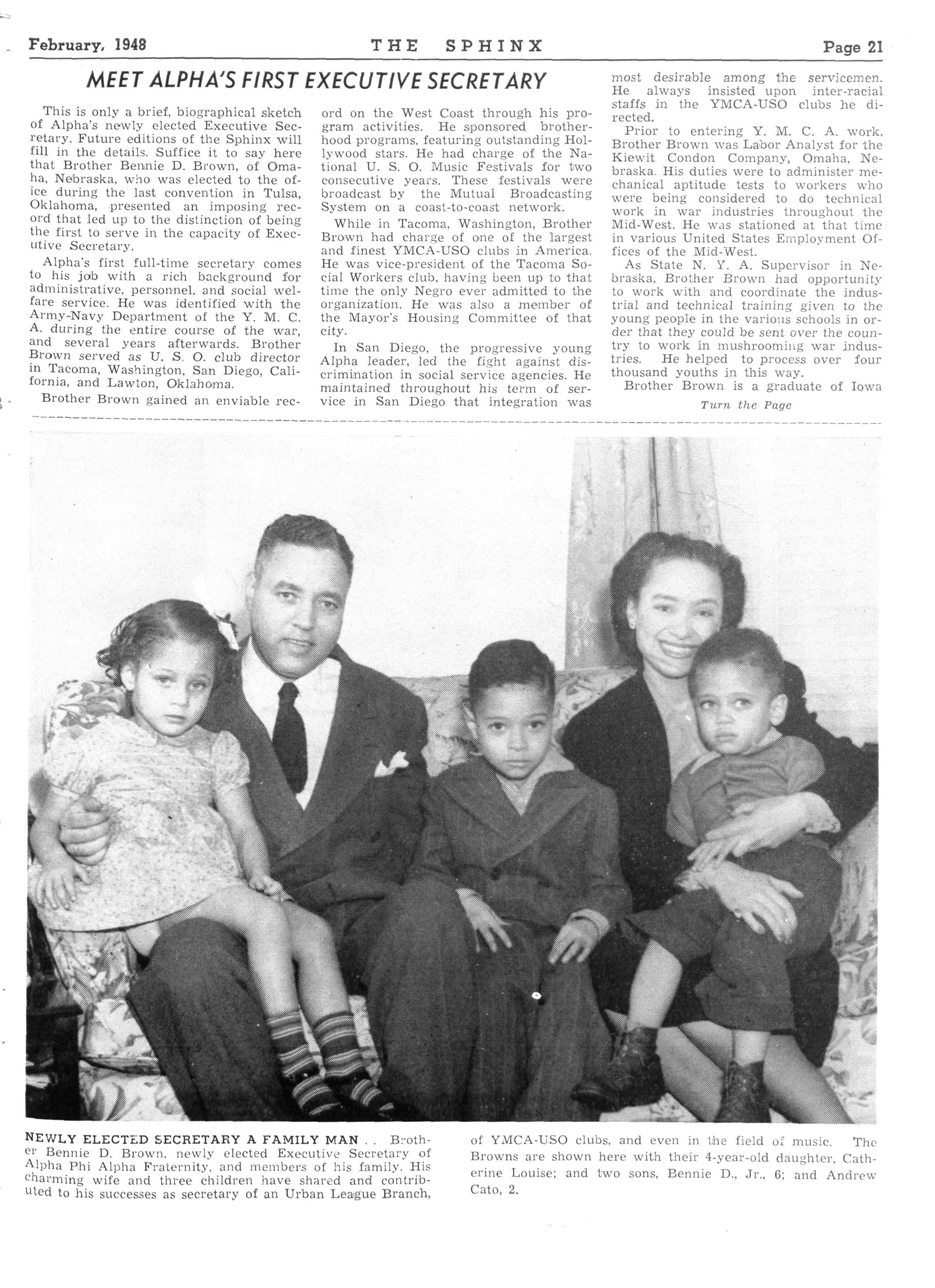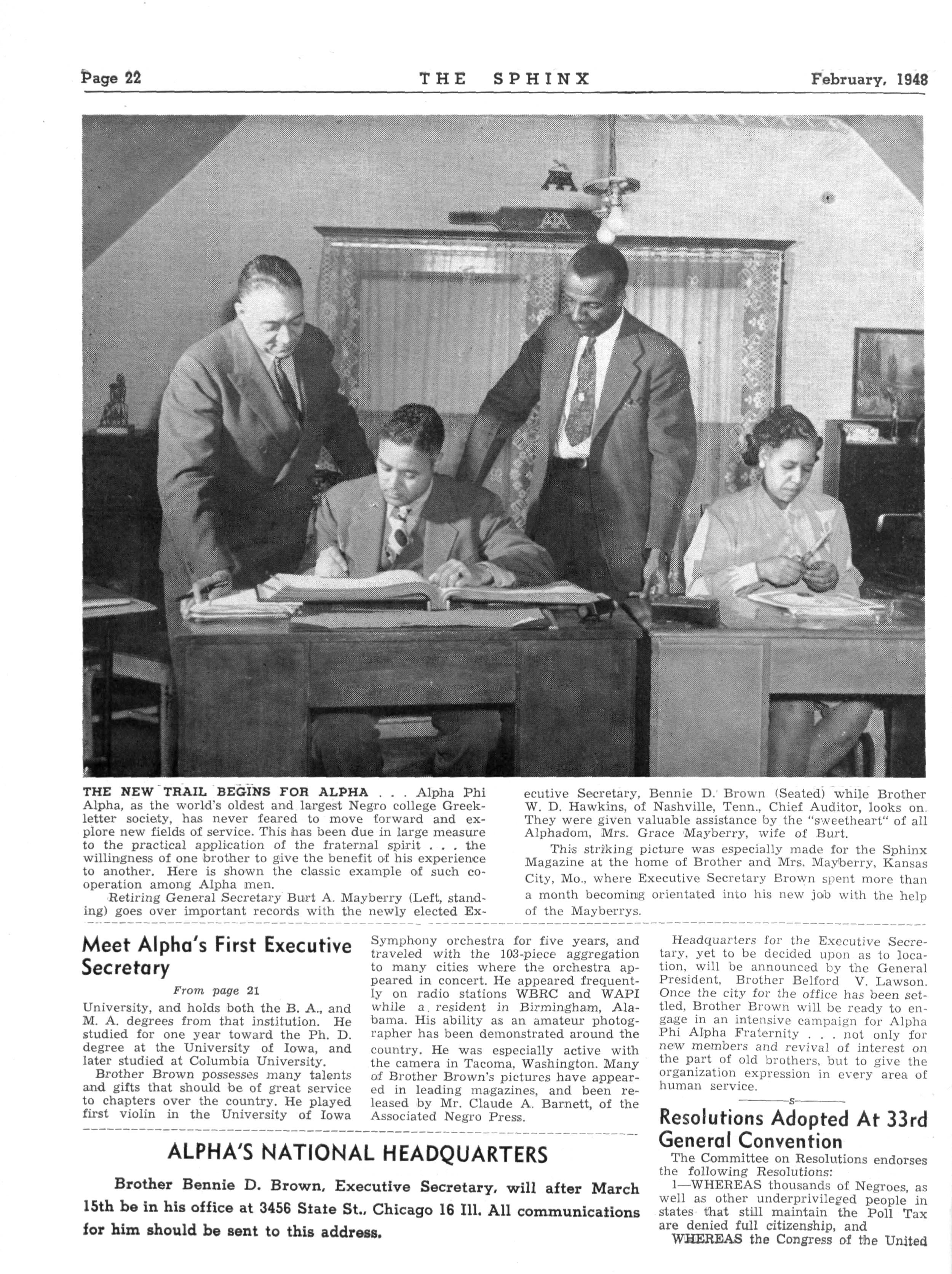 Brother Bennie D Brown, of Omaha, Nebraska, has the distinction of being the first brother elected to this all-important, fulltime position of Executive Secretary. His election stands out among many great accomplishments of the 33rd General Convention at Tulsa, Okla