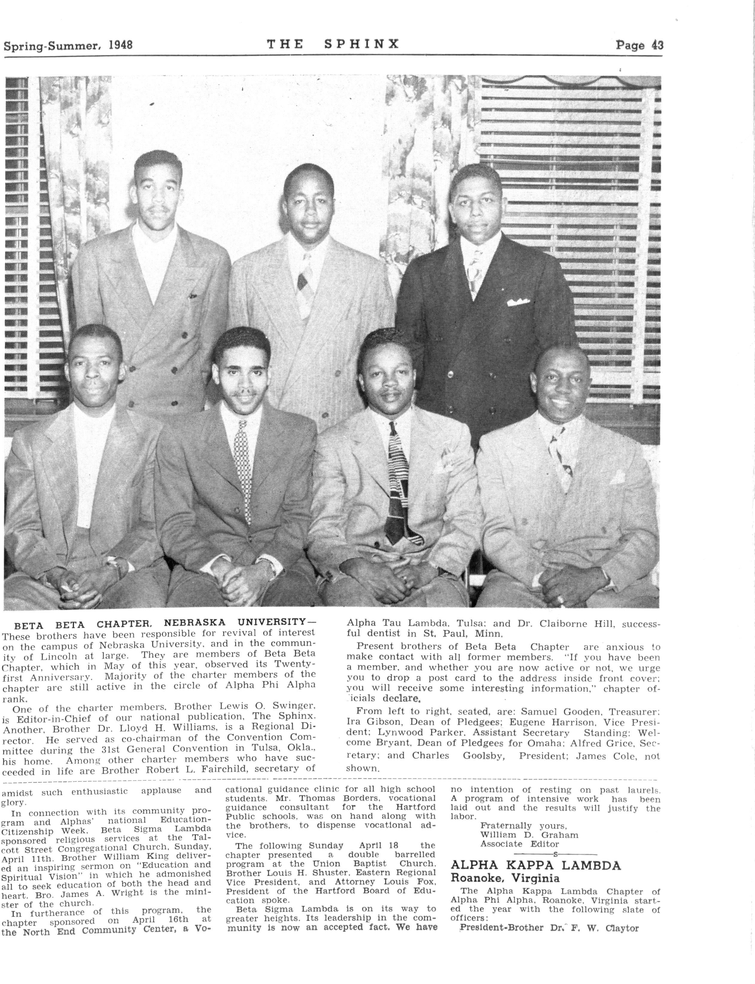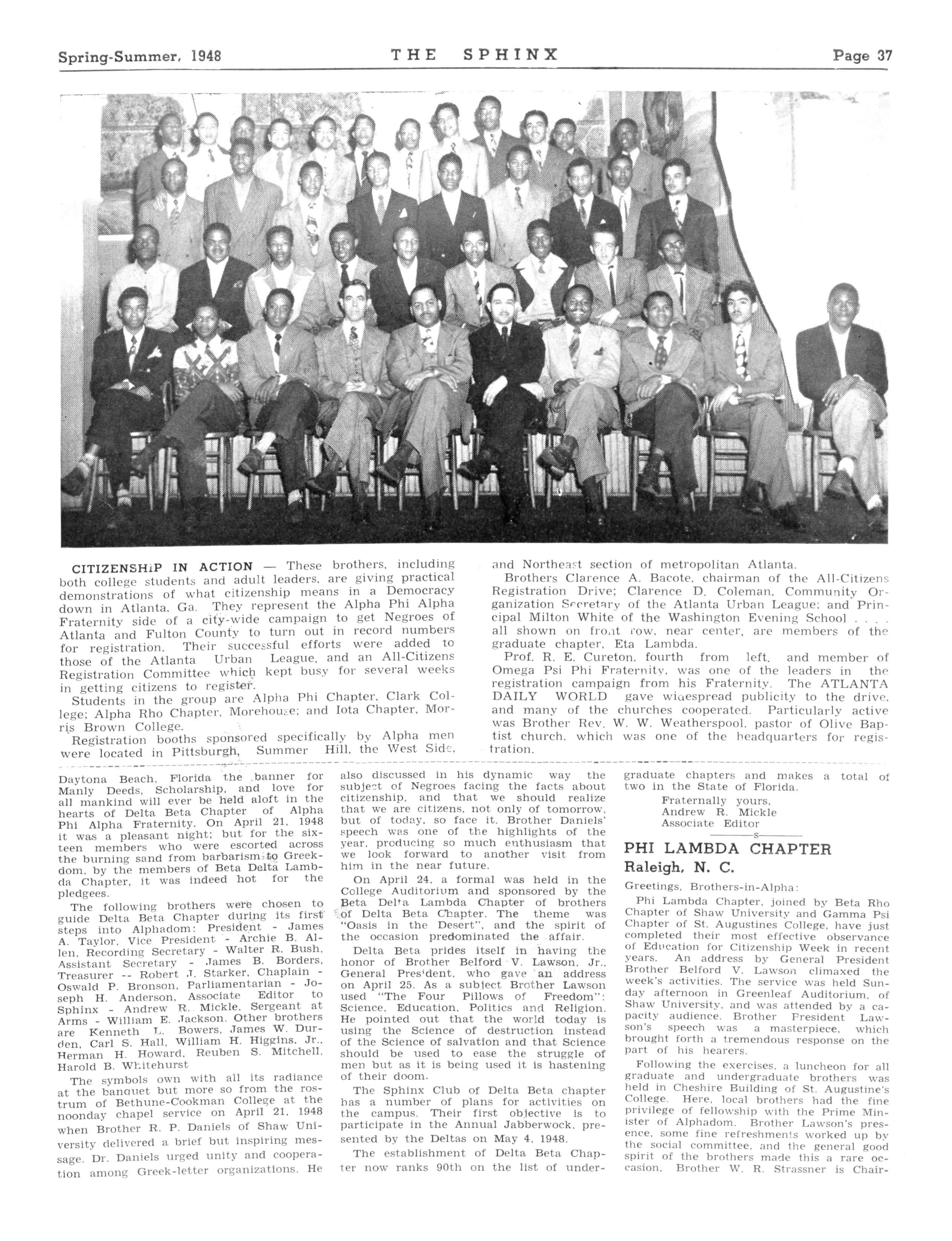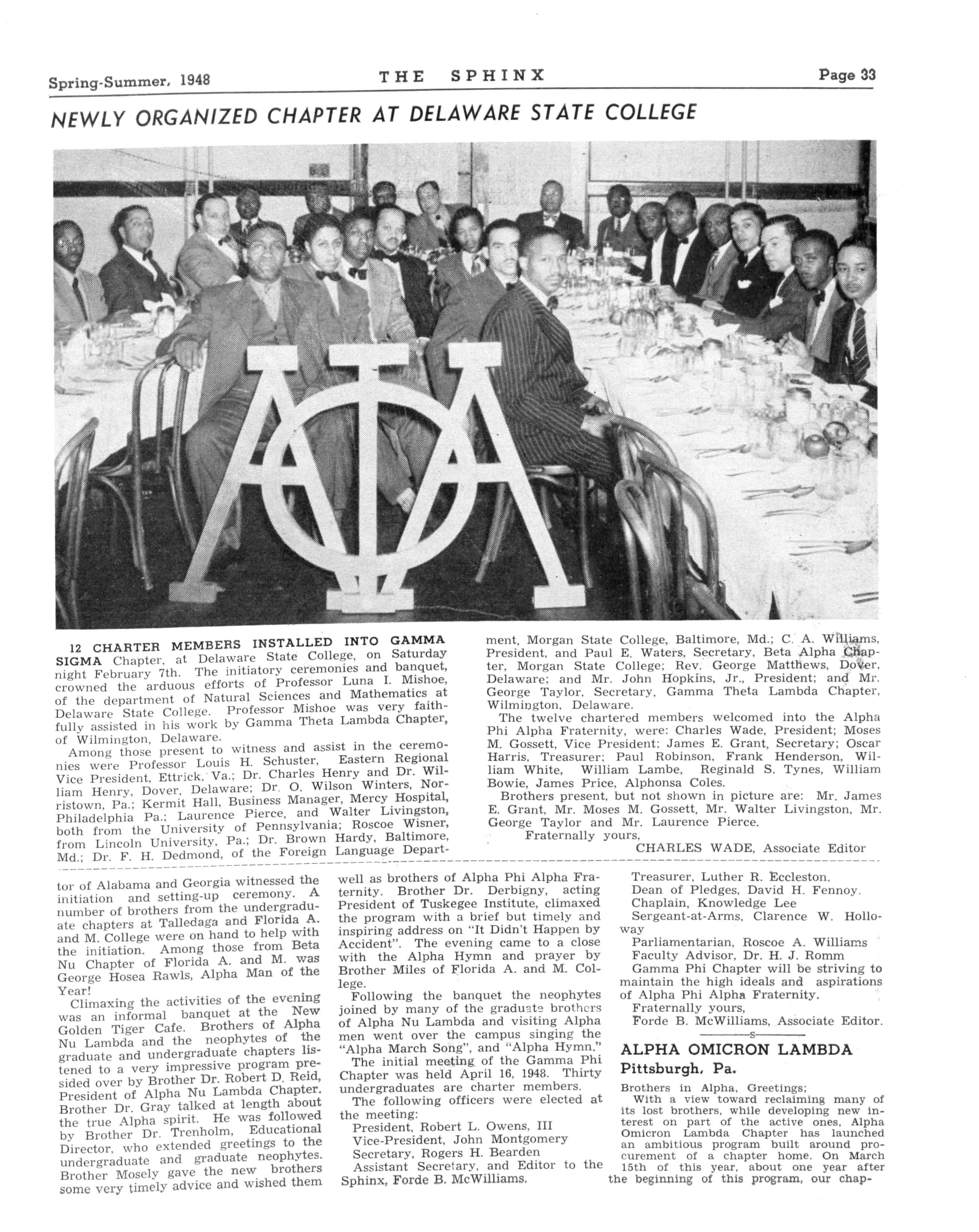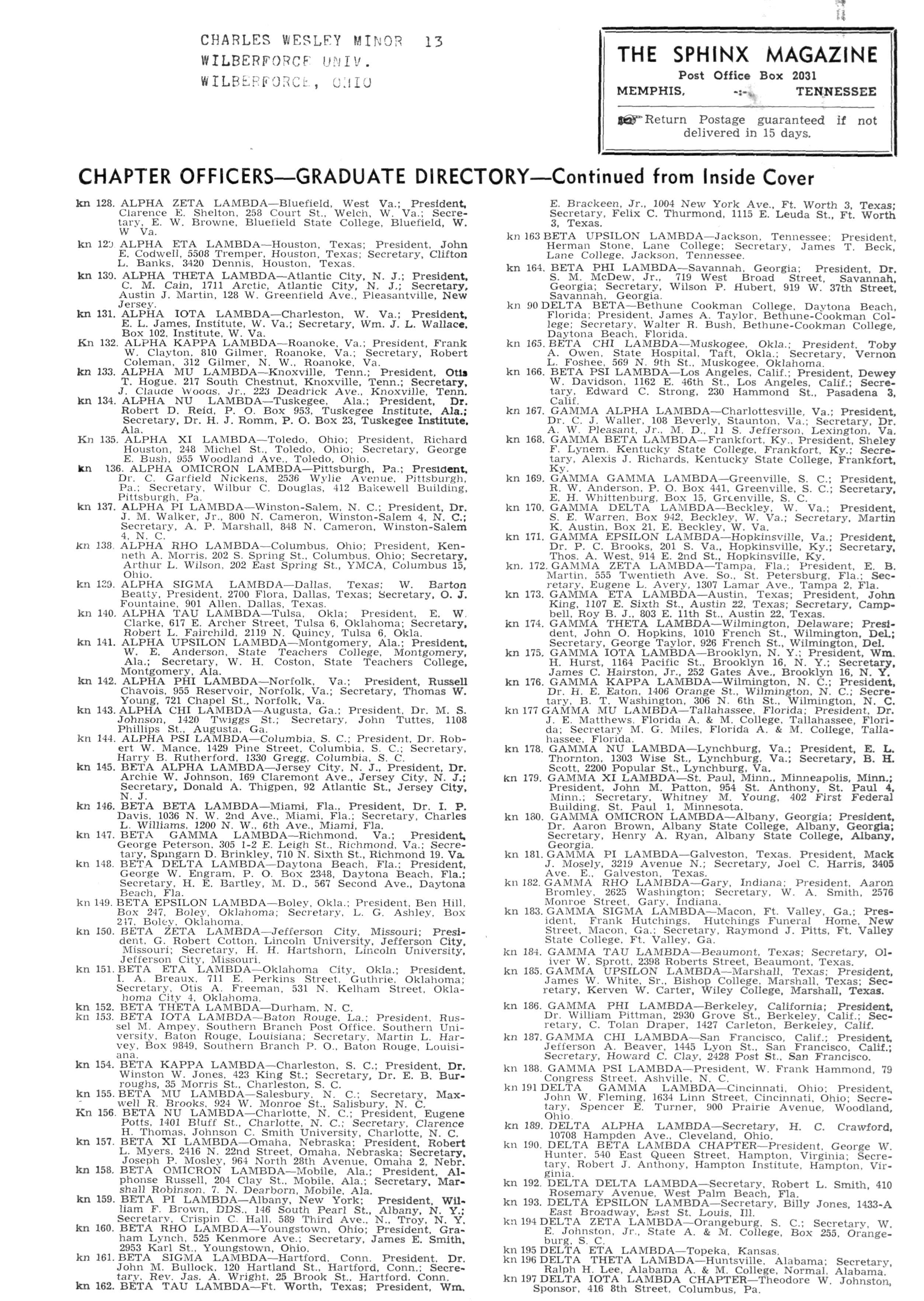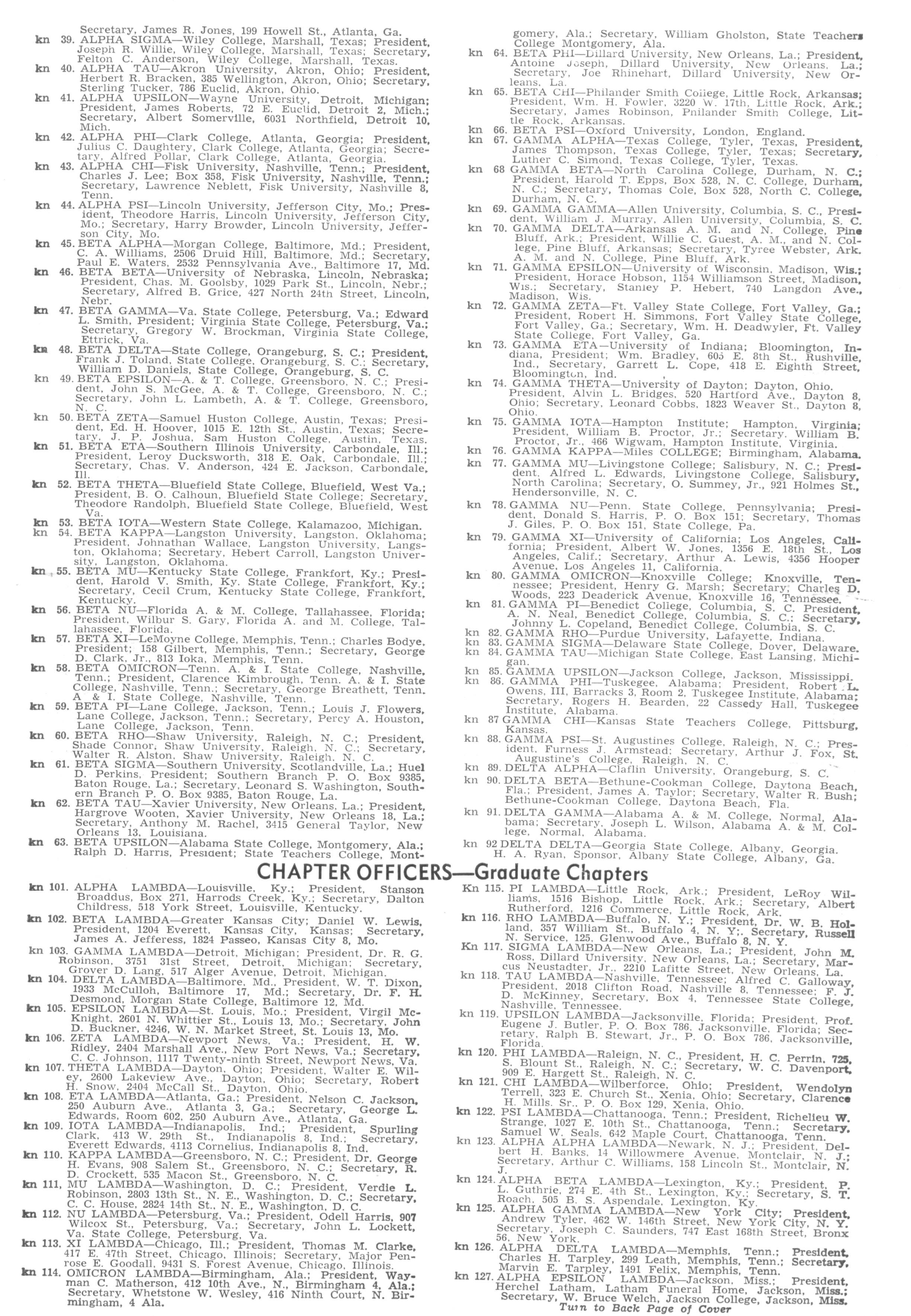 GAMMA THETA LAMBDA—Wilmington, Delaware; President, John O Hopkins, 1010 French St., Wilmington, Del.; Secretary, George Taylor, 926 French St., Wilmington, Del kn 175 GAMMA IOTA LAMBDA—Brooklyn, N Y.; President, Wm H Hurst, 1164 Pacific St., Brooklyn 16, N Y.; Secretary, James C Hairston, Jr., 252 Gates Ave., Brooklyn 16, N Y kn 176 GAMMA KAPPA LAMBDA—Wilmington, N C; President, Dr ft. E Eaton, 1406 Orange St., Wilmington N C; Secretary, B T Washington, 306 N 6th St., Wilmington, N C kn 177GAMMA MU LAMBDA—Tallahassee Florida; President, Dr J E Matthews Florida A & M College Tallahassee, Florida; Secretary M G Miles Florida A & M College, Tallahassee Florida kn 178 GAMMA NU LAMBDA—Lynchburg, Va.; President E L Thornton 1303 Wise St., Lynchburg, Va.; Secretary, B H Scott, 2200 Popular St., Lynchburg, Va kn 179 GAMMA XI LAMBDA—St Paul, Minn. Minneapolis, Minn.; President John M Patton, 954 St Anthony, St Paul 4, Minn.; Secretary, Whitney M Young, 402 First Federal Building, St Paul 1, Minnesota kn 180 GAMMA OMICRON LAMBDA—Albany, Georgia; President, Dr Aaron Brown, Albany State College, Albany, Georgia; Secretary, Henry A Ryan, Albany State College, Albany, Georgia kn 181 GAMMA PI LAMBDA—Galveston, Texas President, Mack J Mosely, 3219 Avenue N.; Secretary, Joel C Harris, 3405 Ave E., Galveston, Texas
