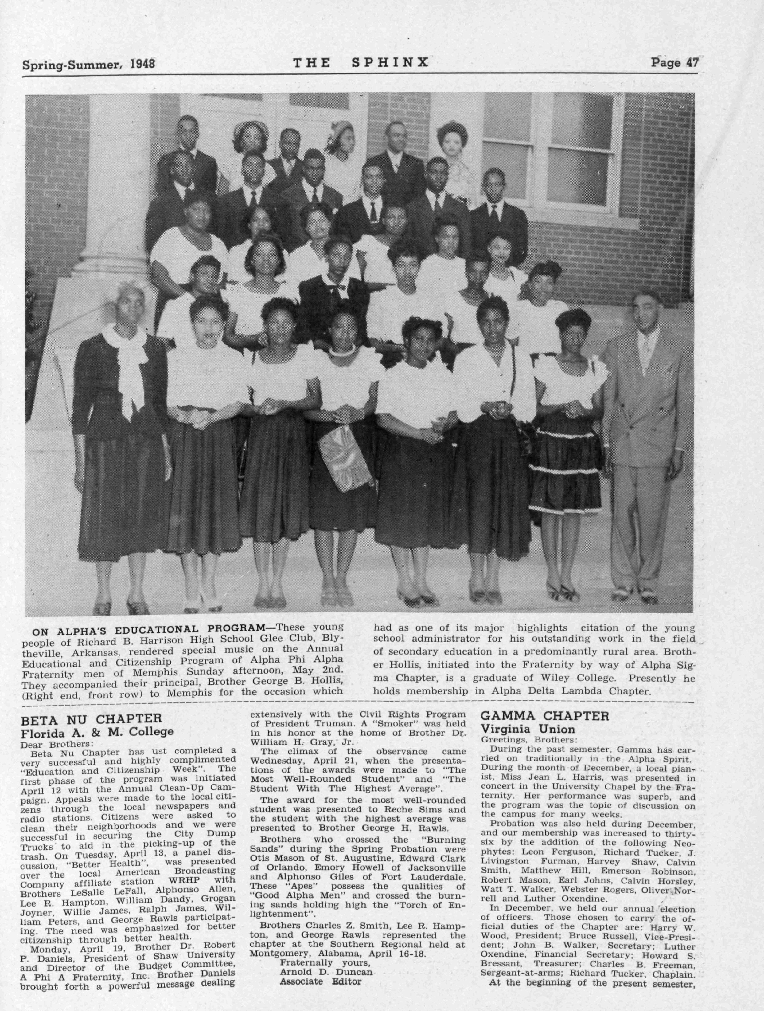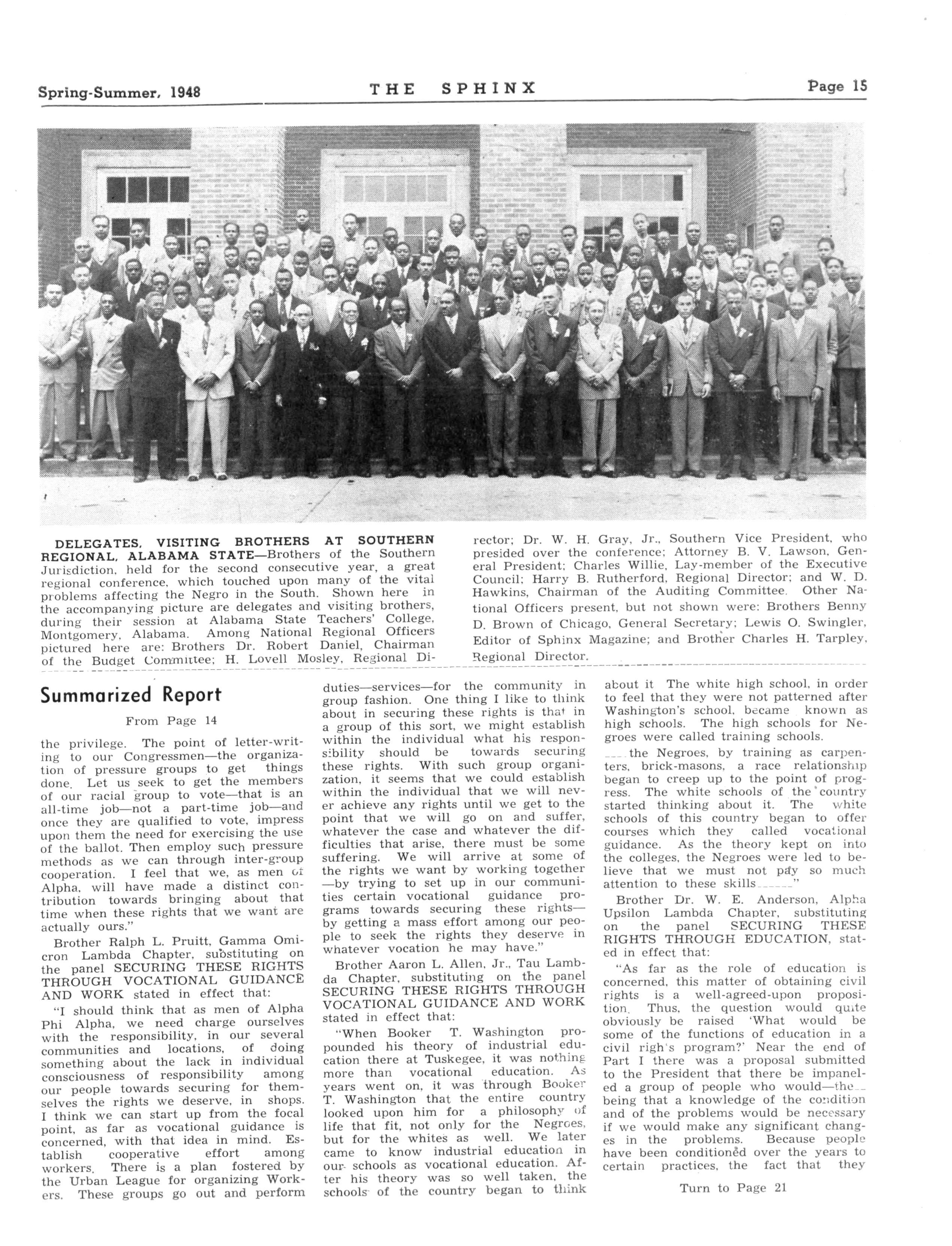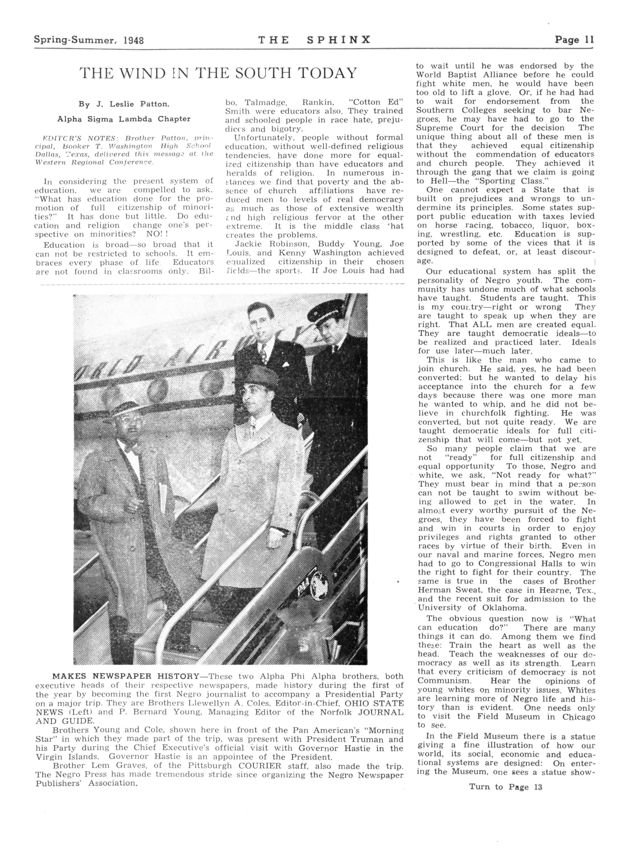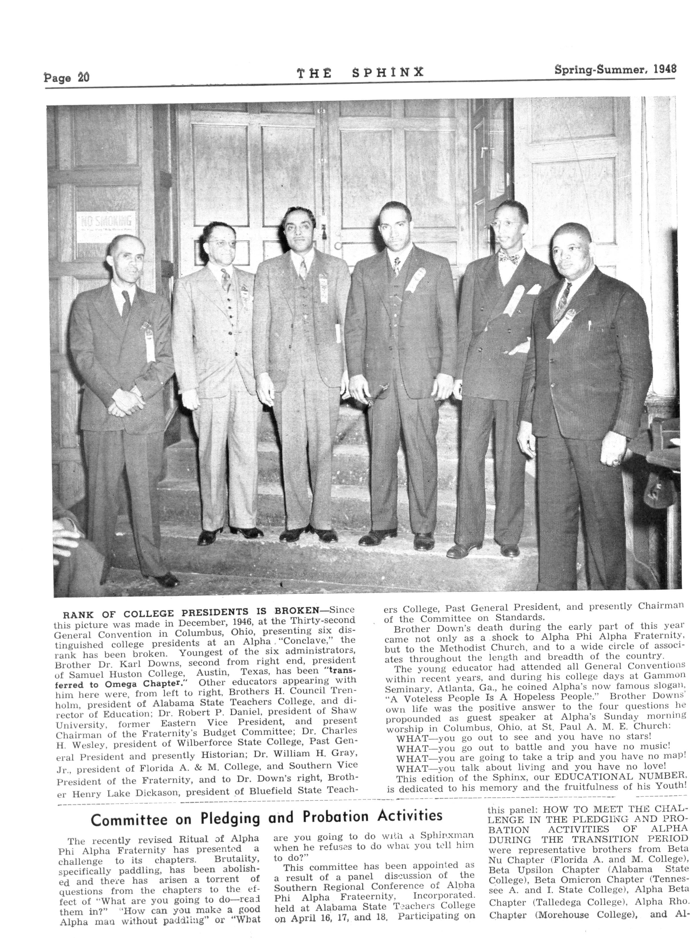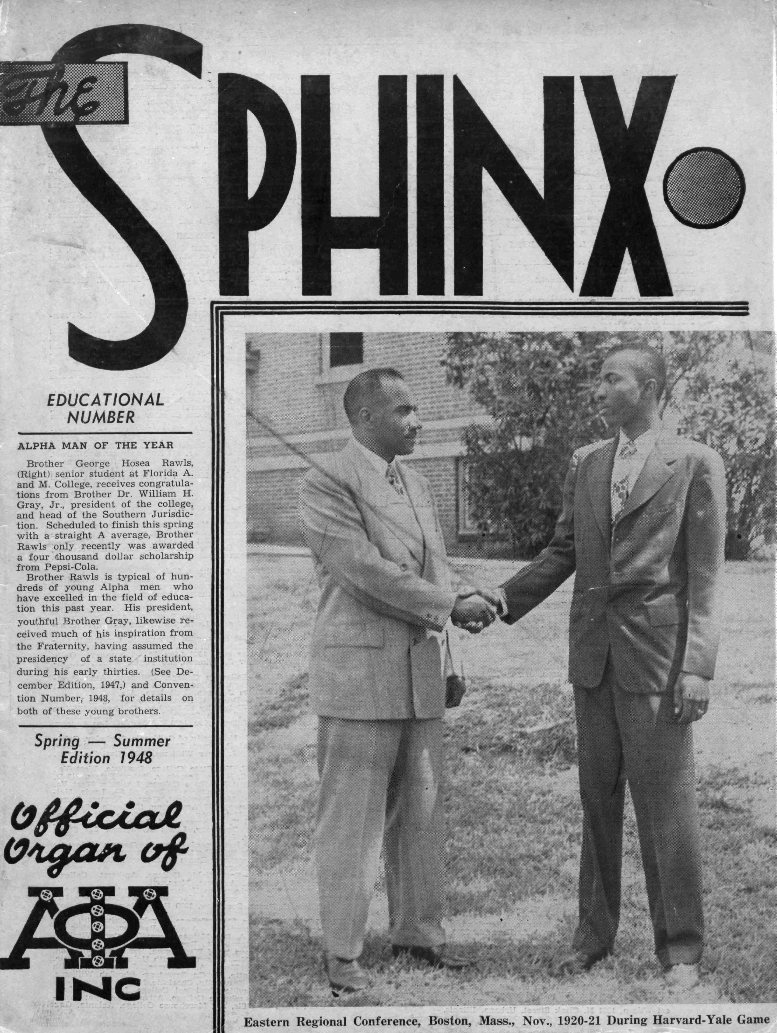 Brother George Hosea Rawls, (Right) senior student at Florida A and M College, receives congratulations from Brother Dr William H Gray, Jr., president of the college, and head of the Southern Jurisdiction Scheduled to finish this spring with a straight A average, Brother Rawls only recently was awarded a four thousand dollar scholarship from Pepsi-Cola Brother Rawls is typical of hundreds of young Alpha men who have excelled in the field of education this past year His president, youthful Brother Gray, likewise received much of his inspiration from the Fraternity, having assumed the presidency of a state institution during his early thirties (See December Edition, 1947,) and Convention Number, 1948, for details on both of these young brothers