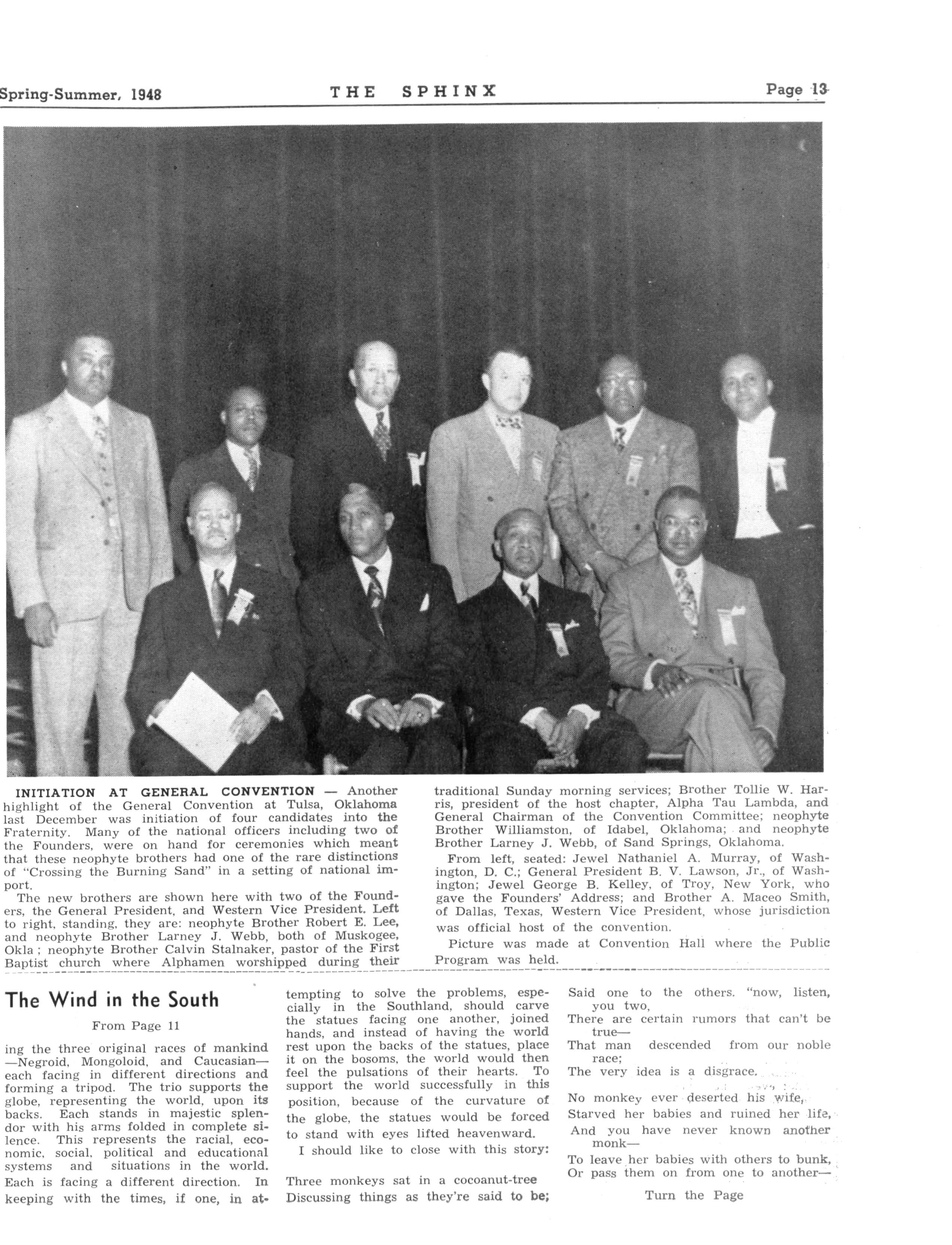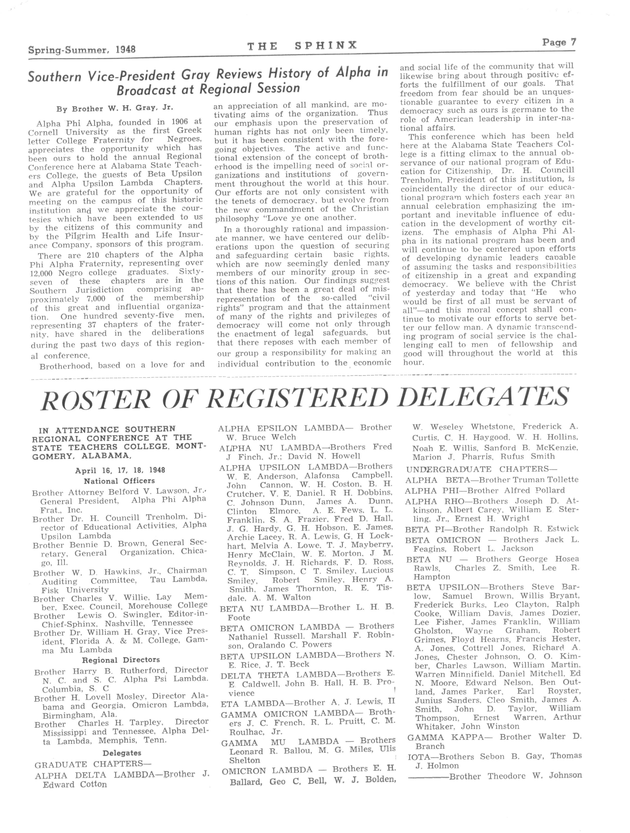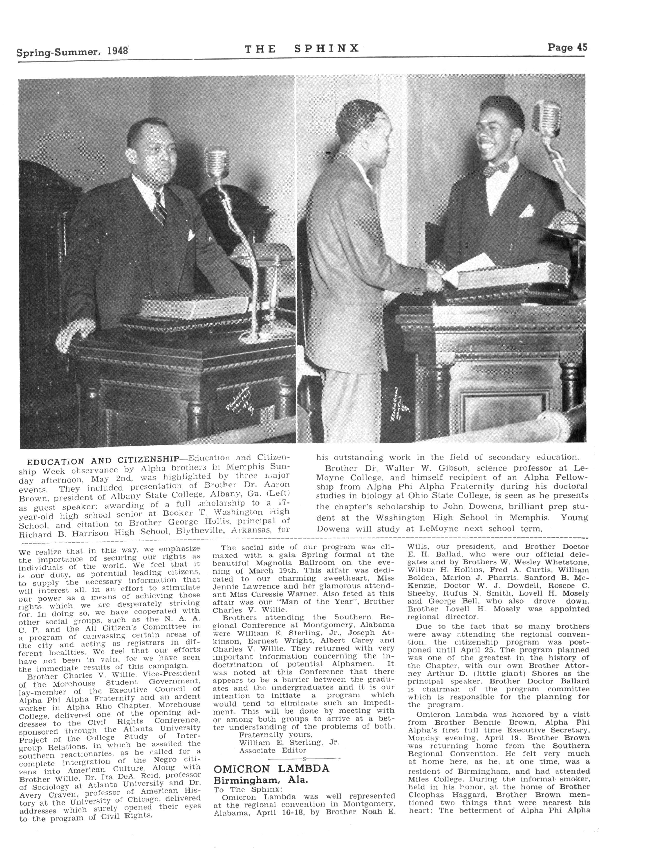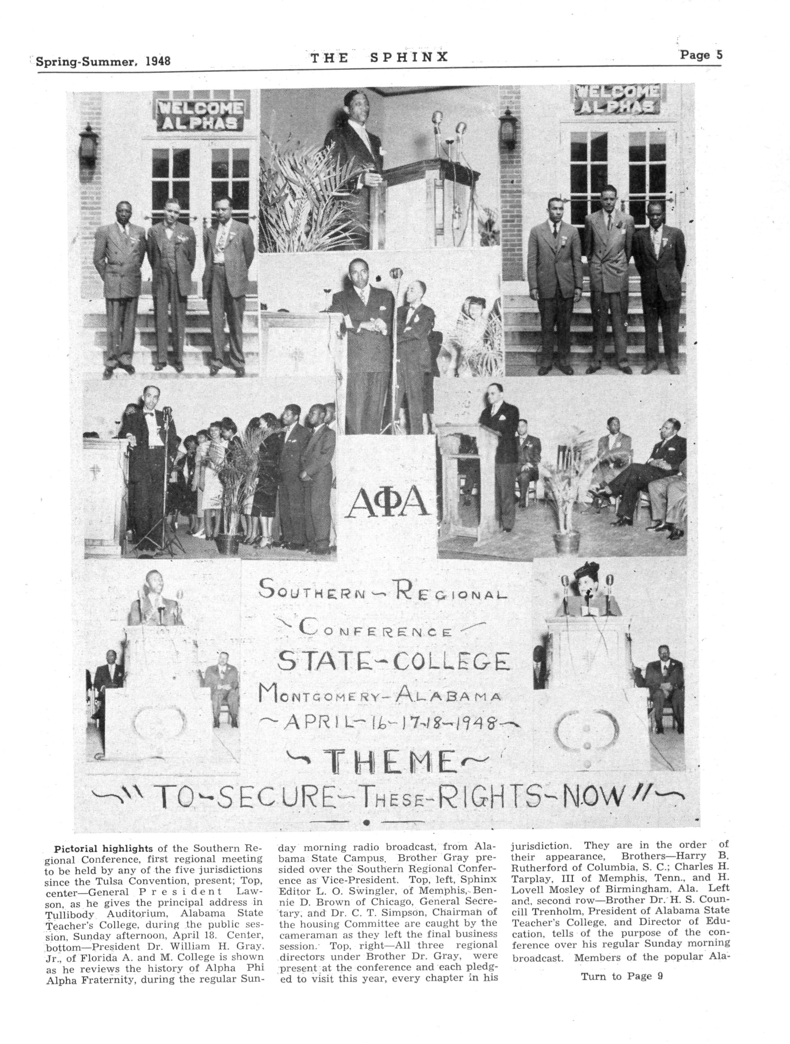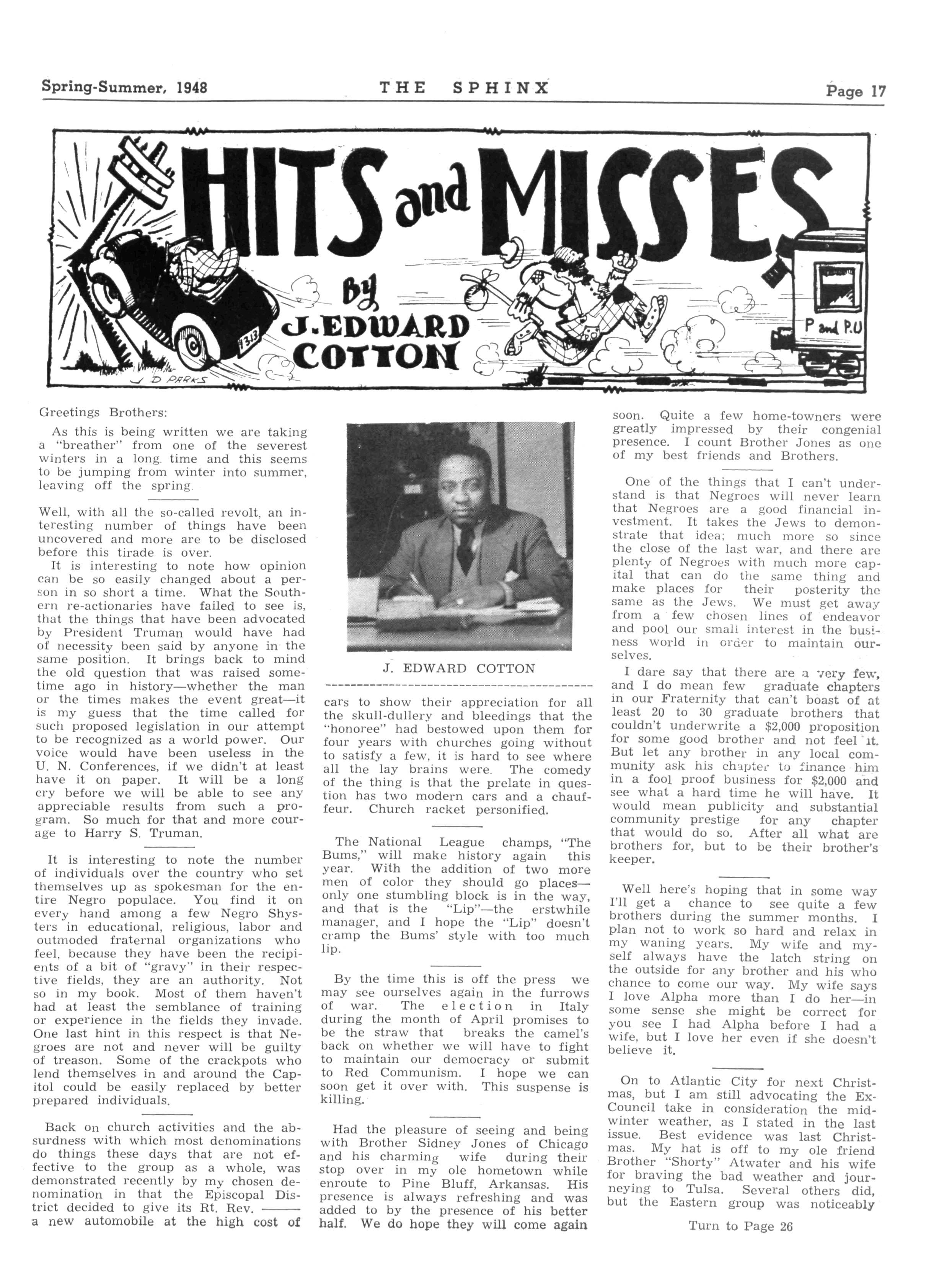 Brother George Hosea Rawls, (Right) senior student at Florida A and M College, receives congratulations from Brother Dr William H Gray, Jr., president of the college, and head of the Southern Jurisdiction Scheduled to finish this spring with a straight A average, Brother Rawls only recently was awarded a four thousand dollar scholarship from Pepsi-Cola Brother Rawls is typical of hundreds of young Alpha men who have excelled in the field of education this past year His president, youthful Brother Gray, likewise received much of his inspiration from the Fraternity, having assumed the presidency of a state institution during his early thirties (See December Edition, 1947,) and Convention Number, 1948, for details on both of these young brothers