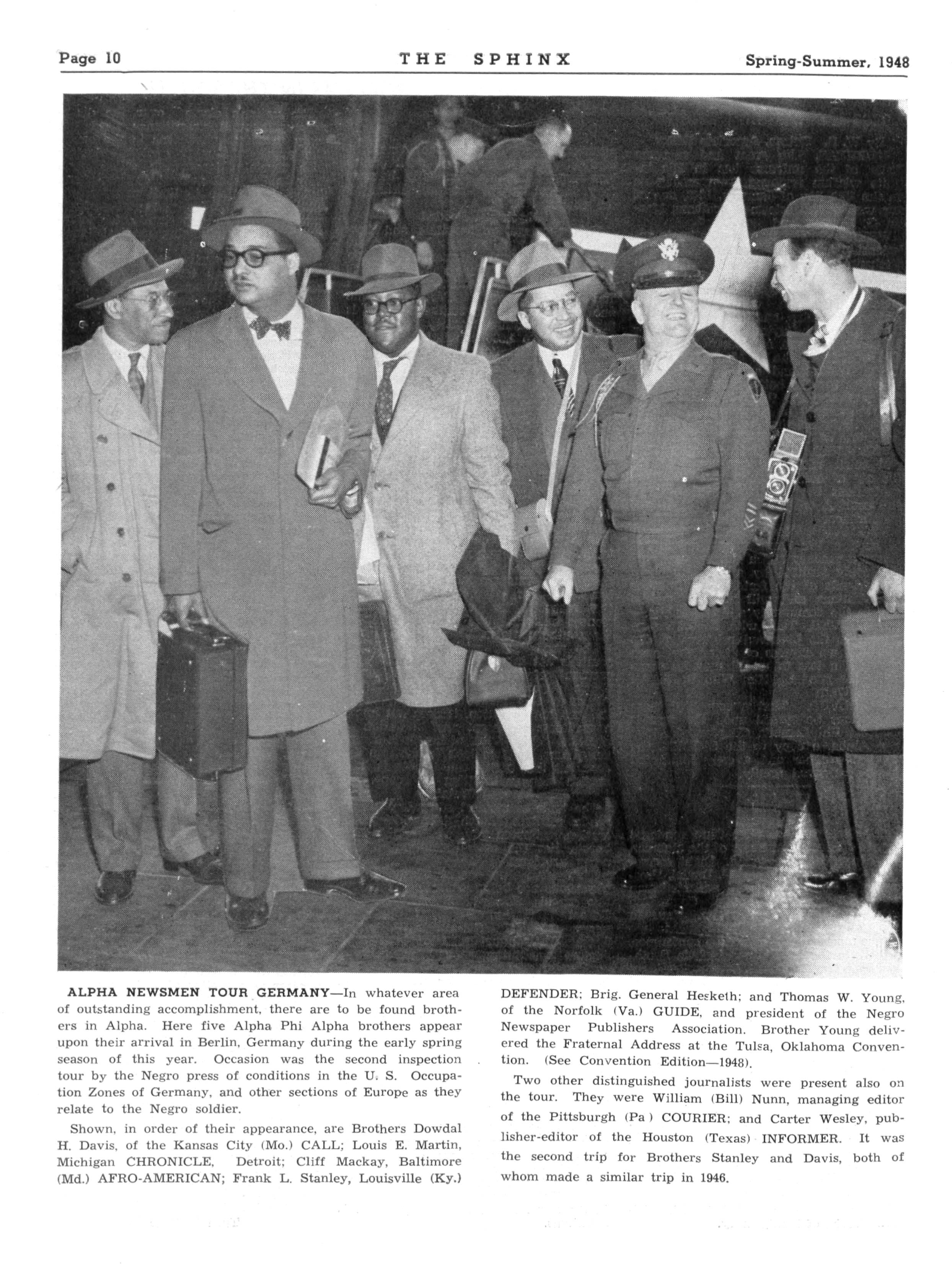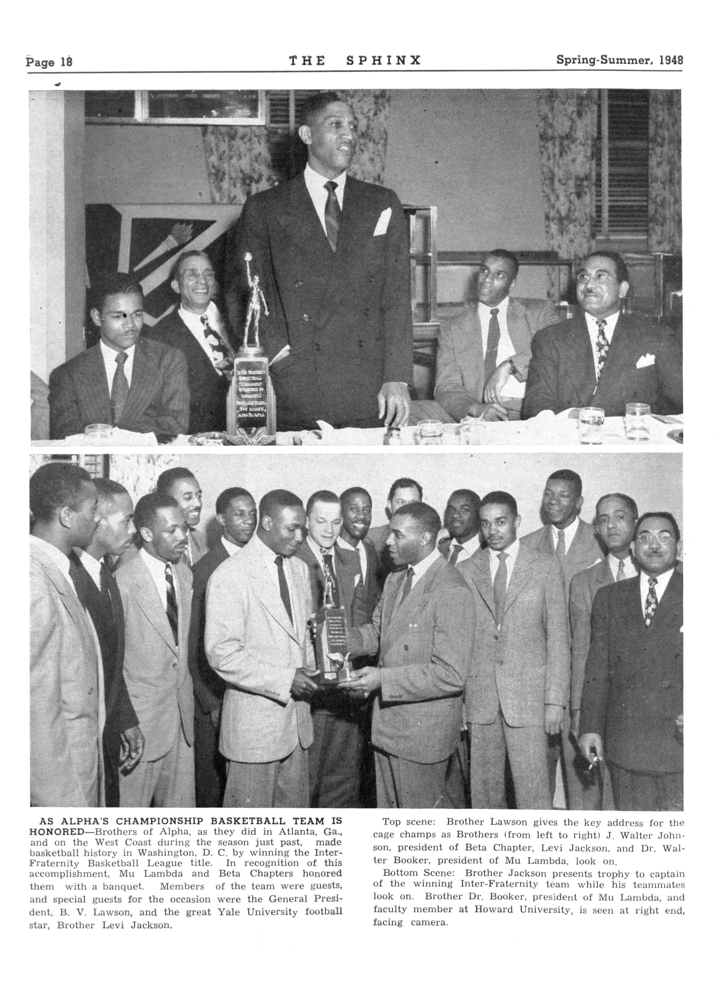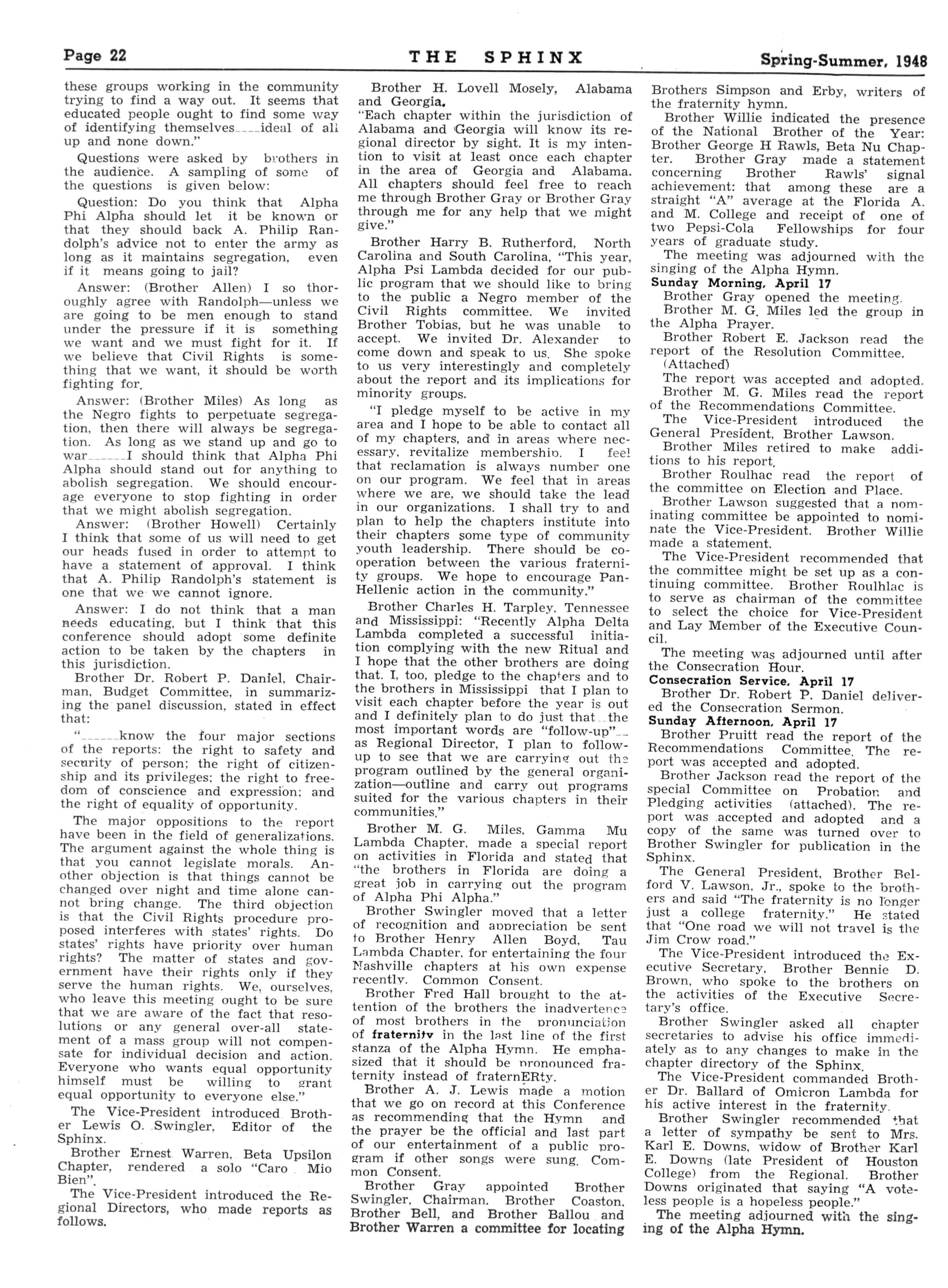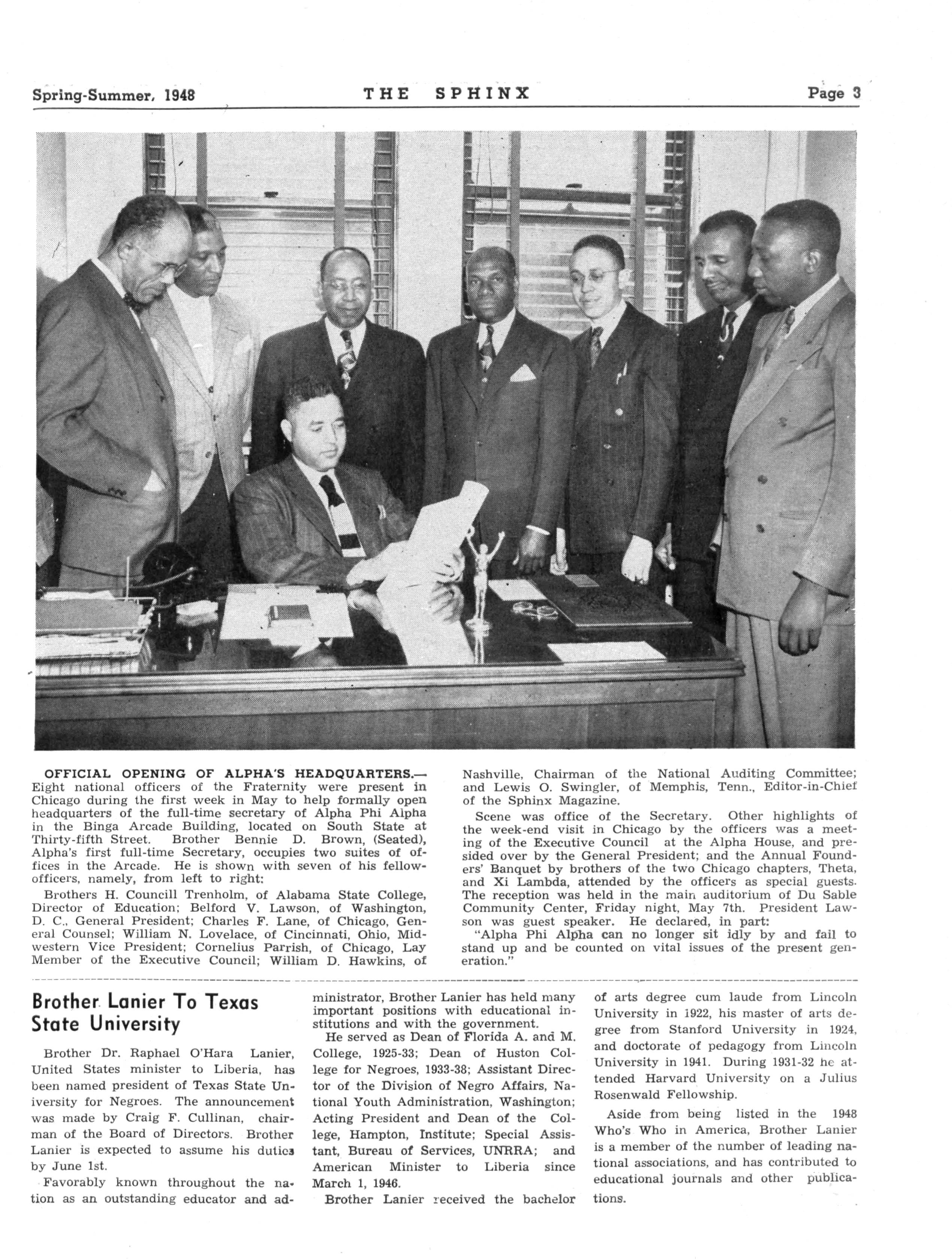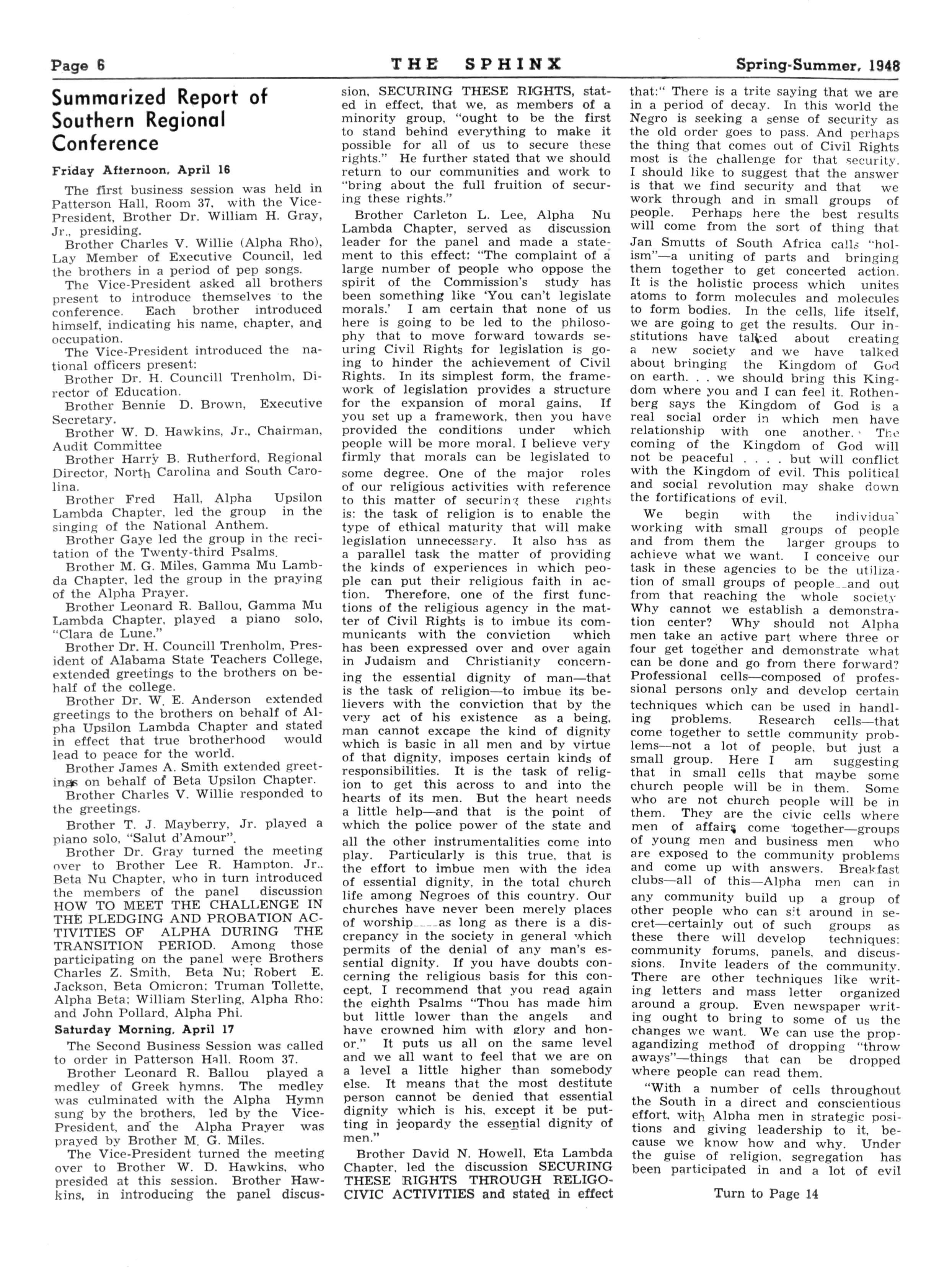 Brother George Hosea Rawls, (Right) senior student at Florida A and M College, receives congratulations from Brother Dr William H Gray, Jr., president of the college, and head of the Southern Jurisdiction Scheduled to finish this spring with a straight A average, Brother Rawls only recently was awarded a four thousand dollar scholarship from Pepsi-Cola Brother Rawls is typical of hundreds of young Alpha men who have excelled in the field of education this past year His president, youthful Brother Gray, likewise received much of his inspiration from the Fraternity, having assumed the presidency of a state institution during his early thirties (See December Edition, 1947,) and Convention Number, 1948, for details on both of these young brothers