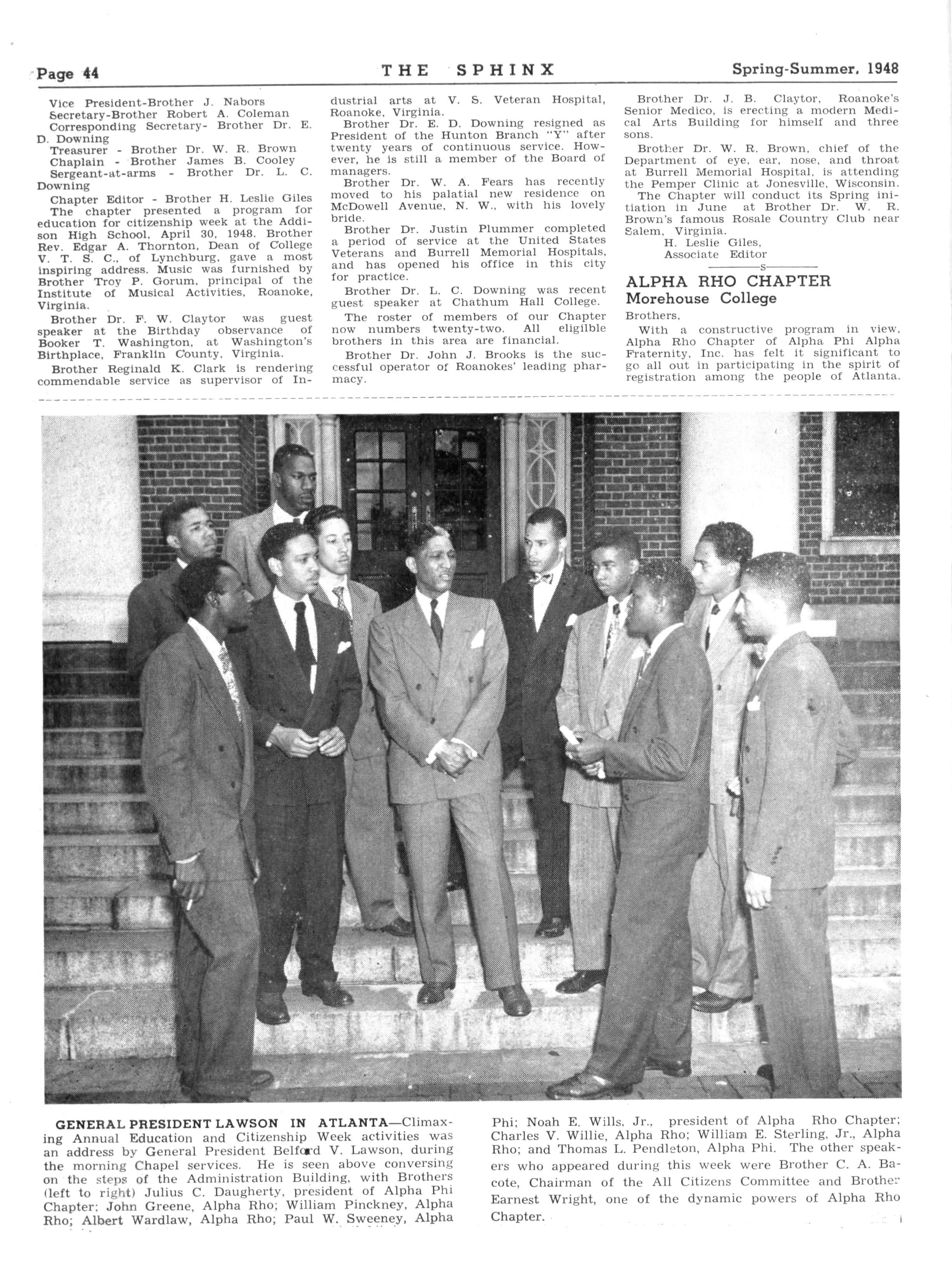 ALPHA RHO—Morehouse College, Atlanta Georgia; President, Noah E Wills, Jr., Morehouse College, Aalanta, Ga.;