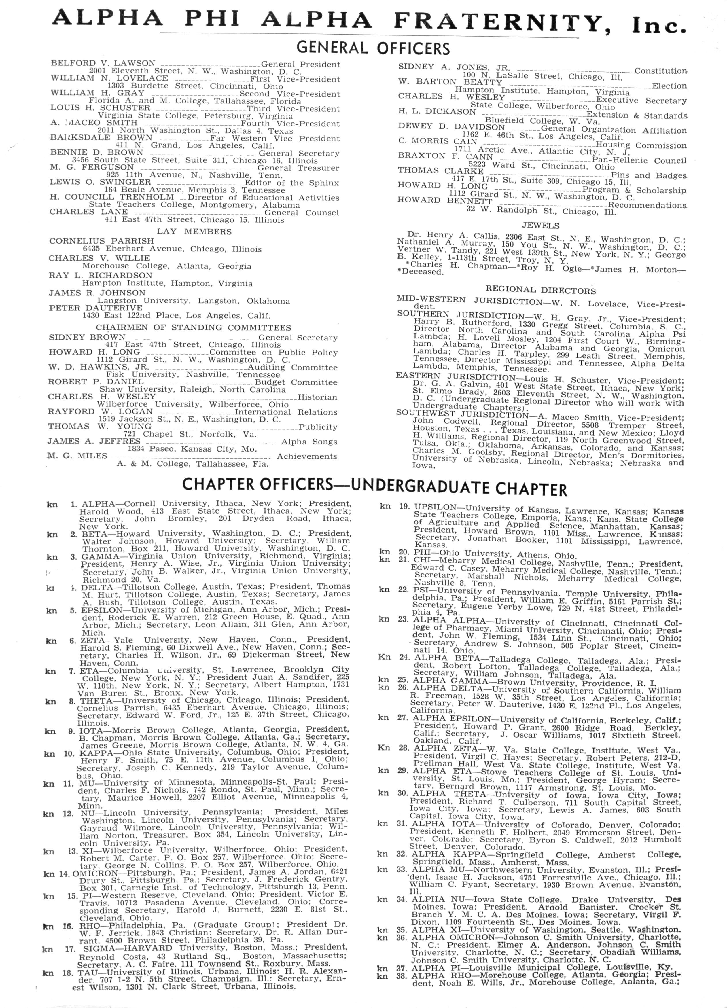 ALPHA MU—Northwestern University Evanston, 111.; President Isaac H Jackson, 4751 Forrestville Ave., Chicago, 111.; William C Pyant, Secretary, 1930 Brown Avenue, Evanston, 111