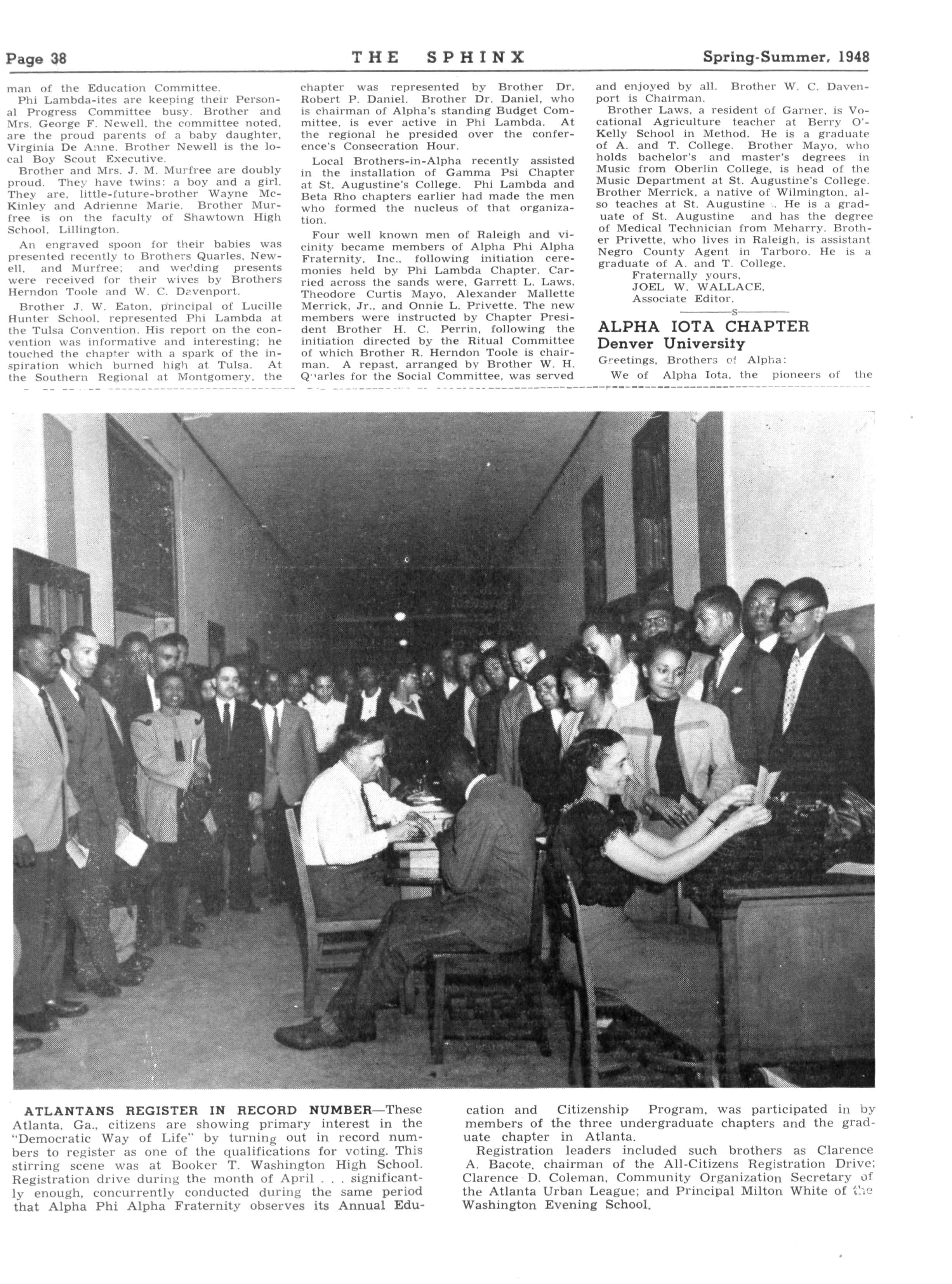 3 GAMMA—Virginia Union University, Richmond, Virginia; President, Henry A Wise, Jr., Virginia Union University; Secretary, John B Walker, Jr., Virginia Union University, Richmond 20, Va