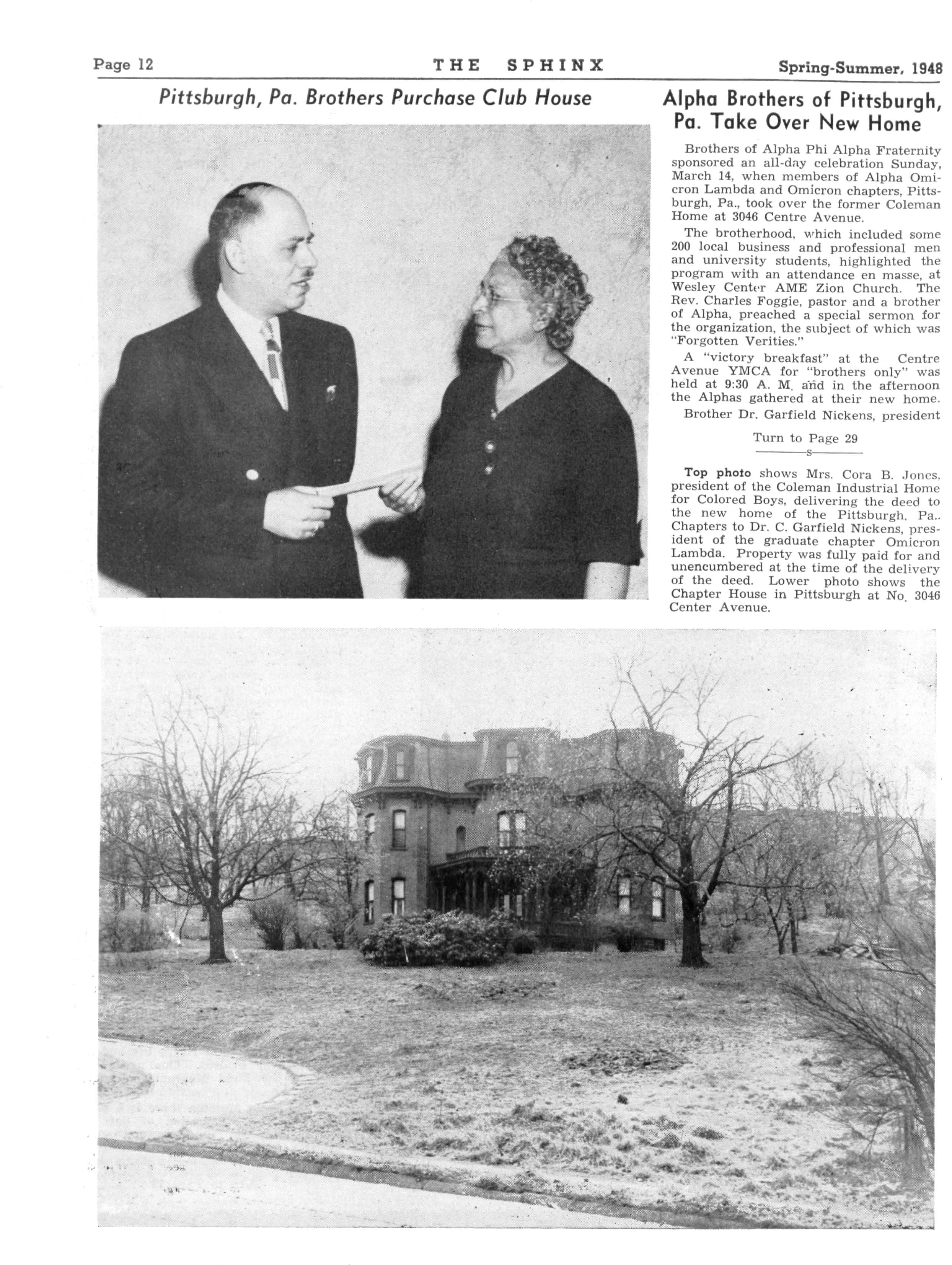 kn 136 ALPHA OMICRON LAMBDA—Pittsburgh, Pa.; President Dr C Garfield Nickens 2536 Wylie Avenue Pittsburgh, Pa.; Secretary, Wilbur C Douglas, 412 Bakewell Building, Pittsburgh, Pa
