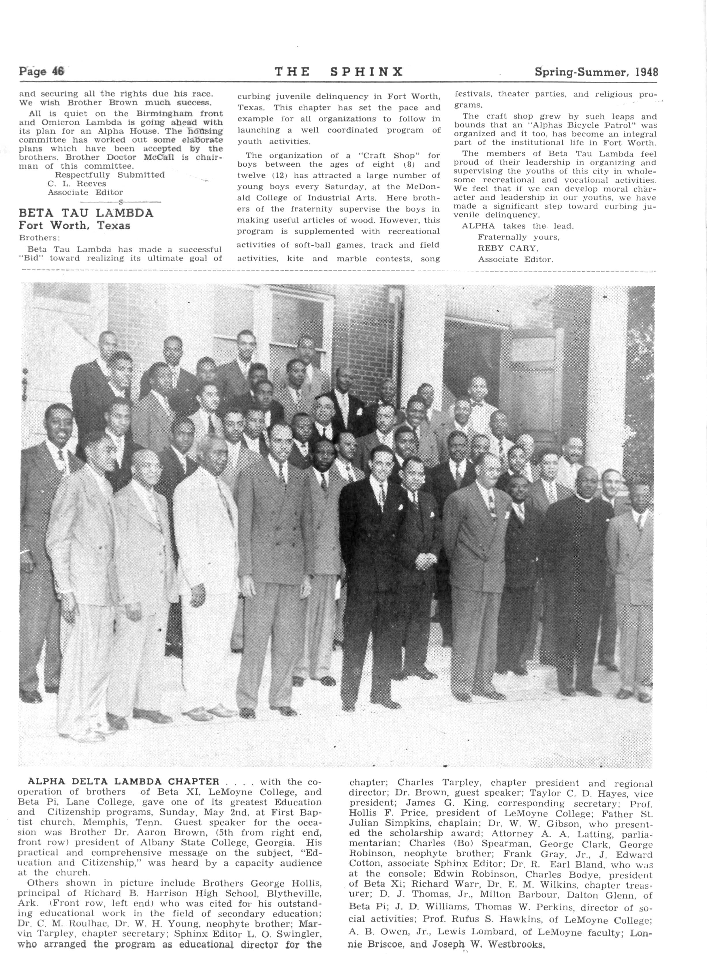 kn 185 GAMMA UPSILON LAMBDA—Marshall Texas; President, James W White Sr„ Bishop College Marshall Texas; Secretary, Kerven W Carter, Wiley College, Marshall, Texas
