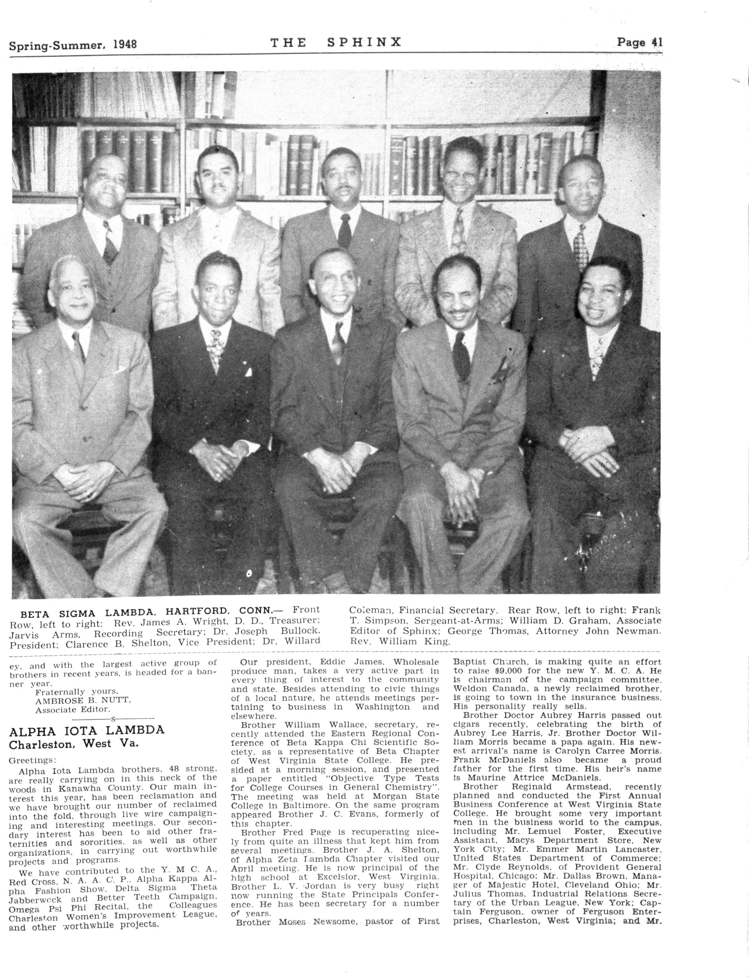 kn 131 ALPHA IOTA LAMBDA—Charleston, W Va.: President E L James, Institute, W Va.; Secretary, Wm J L. Wallace Box 102 Institute, W Va