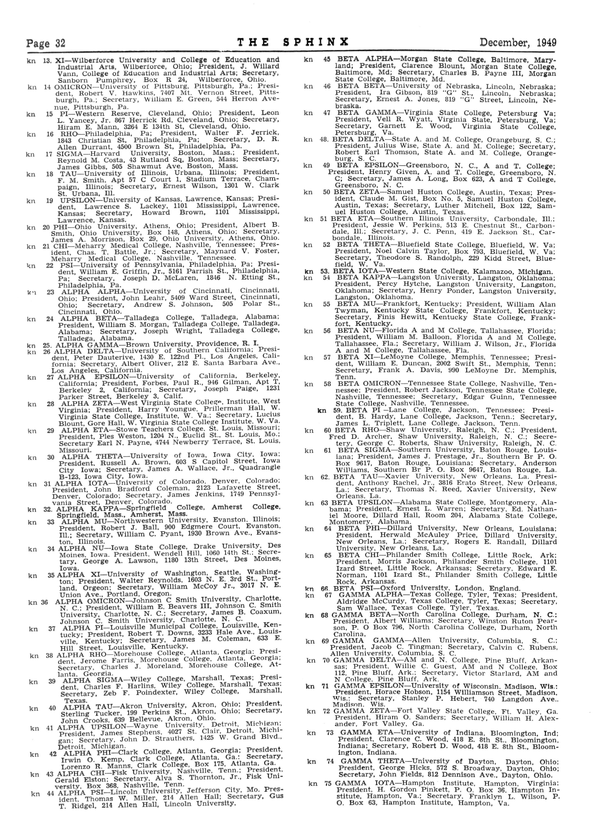 kn 8 THETA—University of Chicago, Chicago, Illinois; President, Lute Smith 5345 S Dearbon St, Chicago, 111; Secretary, William McDonald, 5647 S Wabash Ave Chicago, 111 kn 9 IOTA—Morris Brown College, Atlanta Ga.; President Thomas J Holman; 'Secretary, Lorenzo Curry, Morris Brown College, Atlanta, Georgia