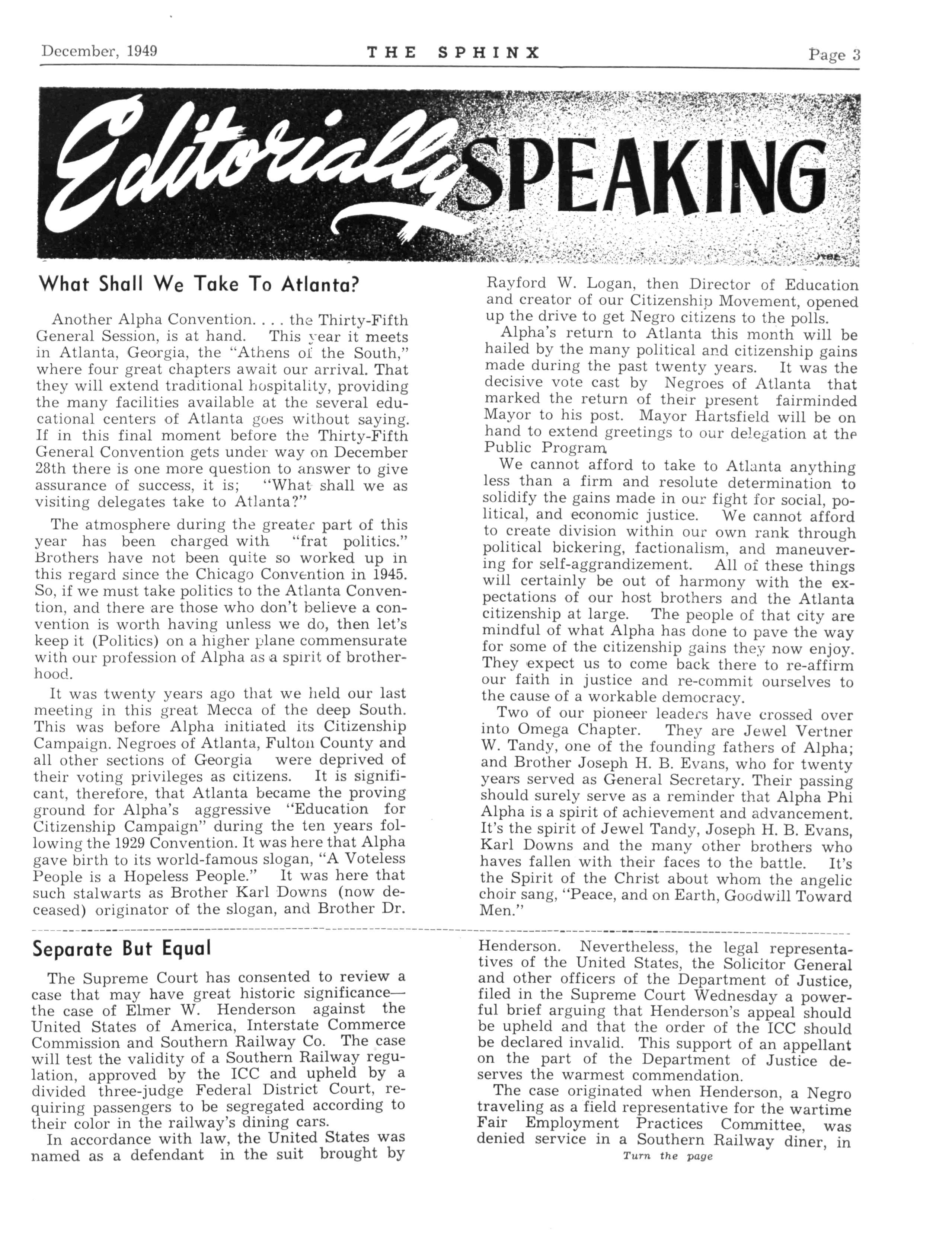 Declaring that his fraternity was translating its program and spirit to Negro progress all over America as part of a great racial crusade, Attorney Belford Lawson, of Washington, D C, general president, addressed a large assemblage of Atlanta graduate and undergraduate fraters as plans were completed for the General Convention, December 28-30