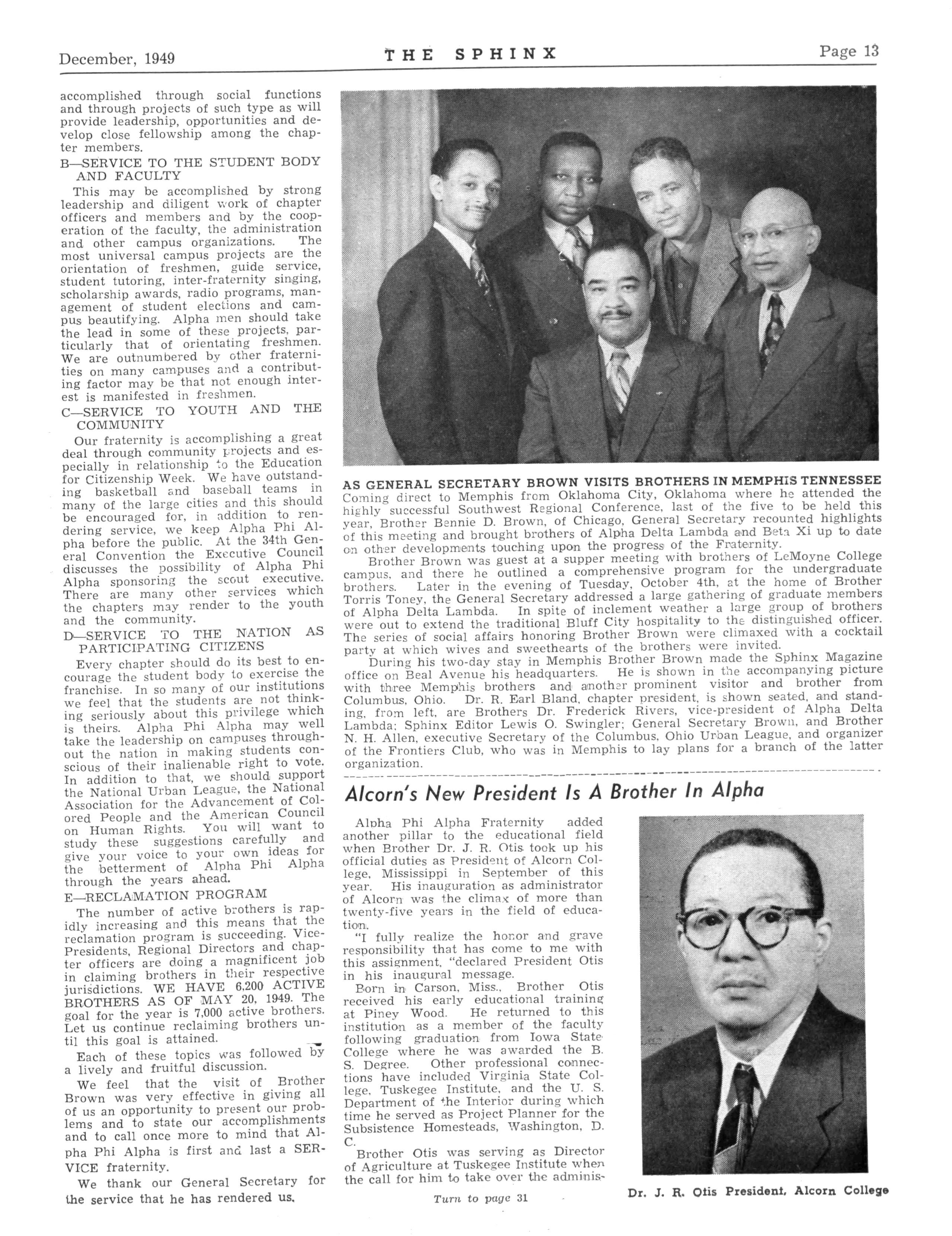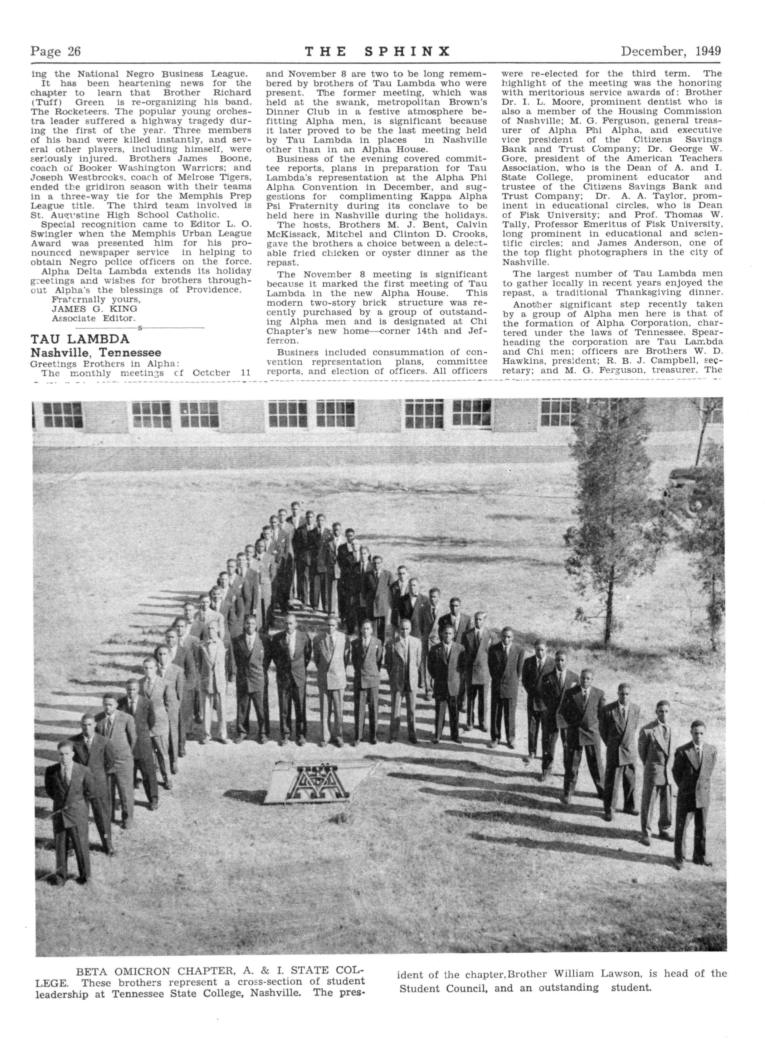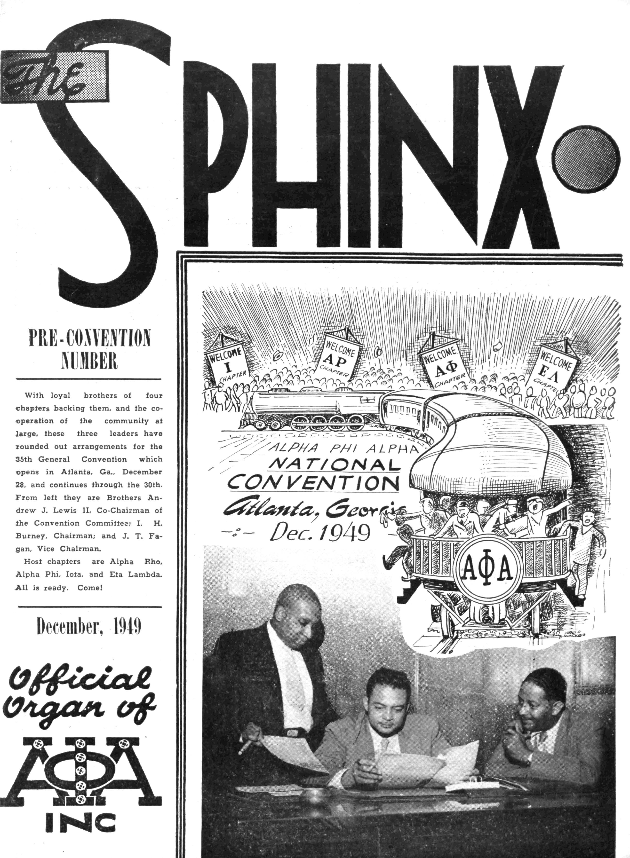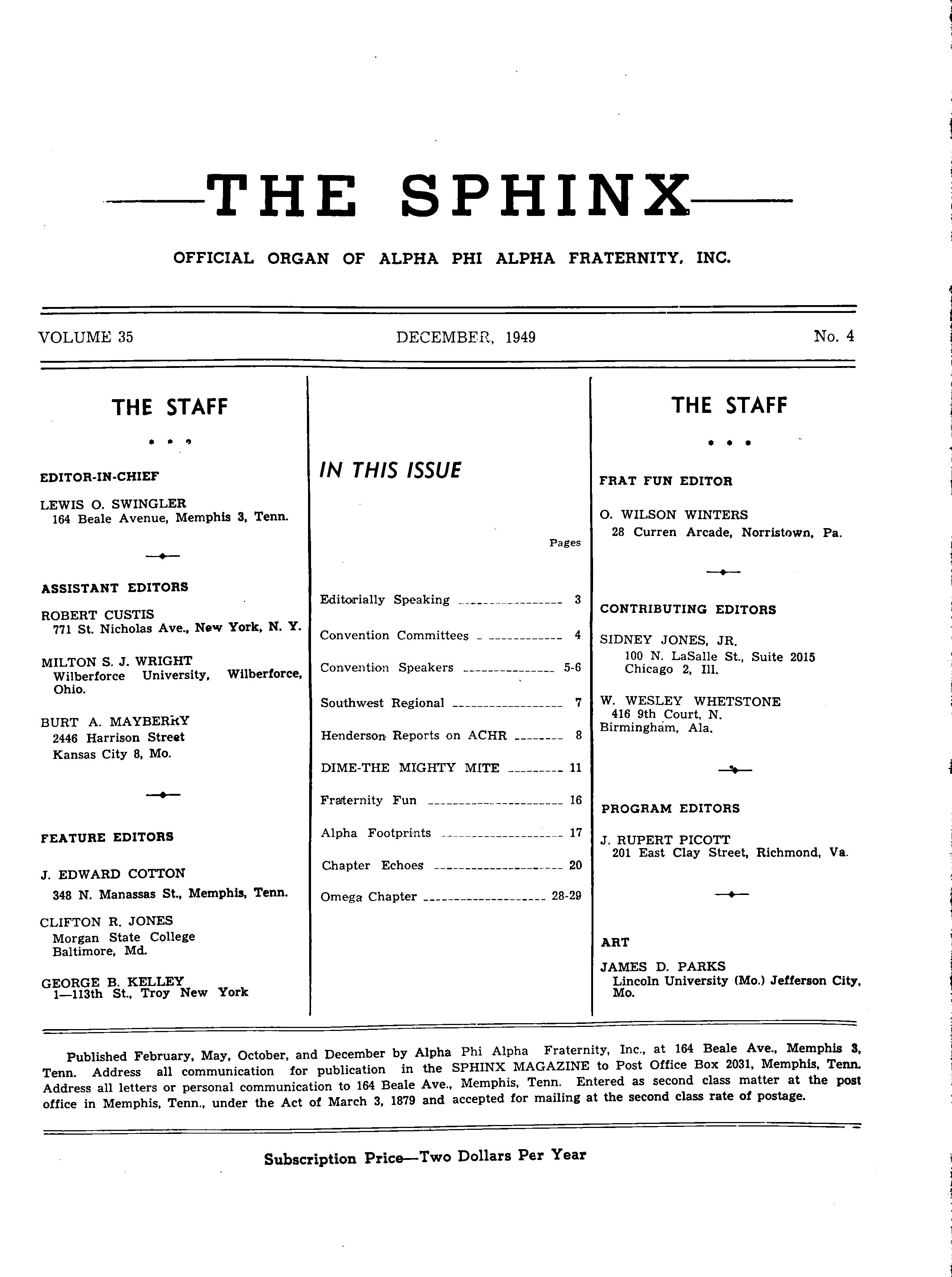 Published February, May, October, and December by Alpha Phi Alpha Fraternity, Inc., at 164 Beale Ave Memphis 3. Tenn. Address all communication for publication in the SPHINX MAGAZINE to Post Office Box 2031, Memphis Tenn. Address all letters or personal communication to 164 Beale Ave., Memphis, Tenn Entered as second class matter at the post office in Memphis, Tenn., under the Act of March 3, 1879 and accepted for mailing at the second class rate of postage.