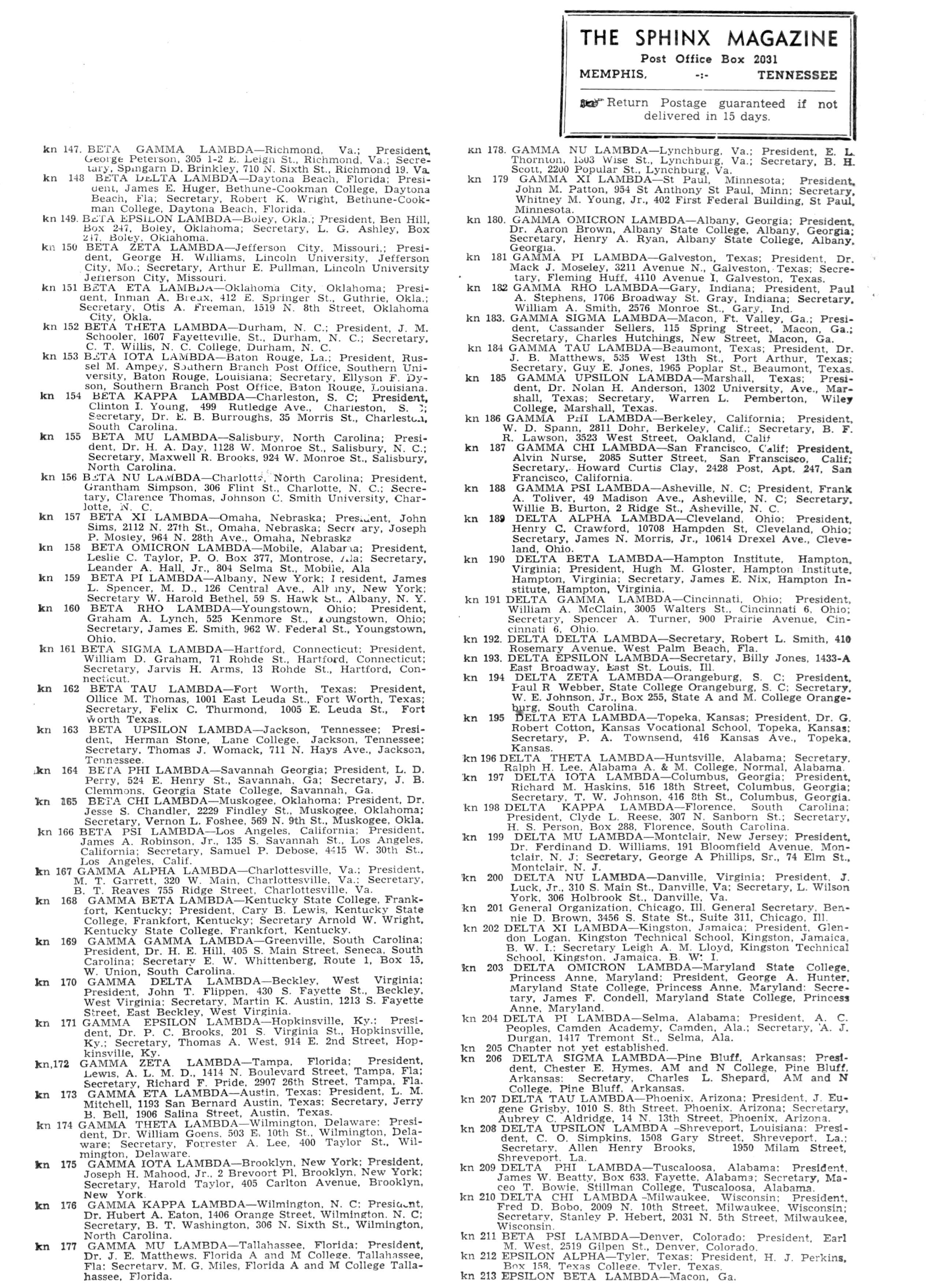 kn 193 DELTA EPSILON LAMBDA—Secretary, Billy Jones 1433-A East Broadway, East St Louis 111 kn 194 DELTA ZETA LAMBDA—Orangeburg, S C; President Paul R Webber, State College Orangeburg, S C; Secretary W E Johnson Jr., Box 255, State A and M College Orange- burg, South Carolina DE kn 195 DELTA ETA LAMBDA—Topeka Kansas; President Dr G Robert Cotton, Kansas Vocational School, Topeka, Kansas: Secretary, P A Townsend, 416 Kansas Ave., Topeka kn 196 DELTA THETA LAMBDA—Huntsville, Alabama; Secretary, Ralph H Lee Alabama A & M College Normal, Alabama