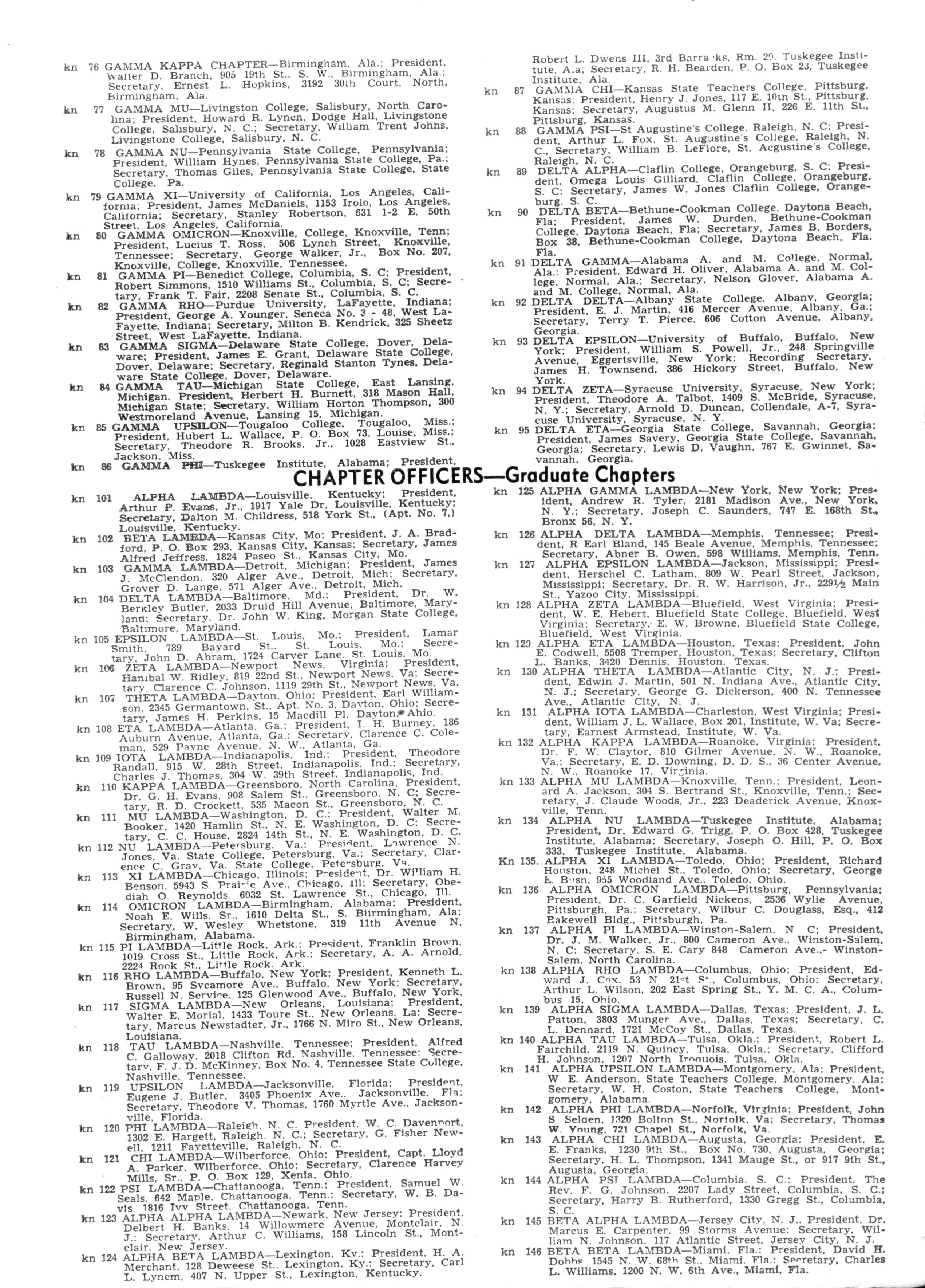 kn 134 ALPHA NU LAMBDA—Tuskegee Institute, Alabama: President, Dr Edward G Trigg P O Box 428, Tuskegee Institute Alabama; Secretary, Joseph O Hill, P O Box 333, Tuskegee Institute Alabama