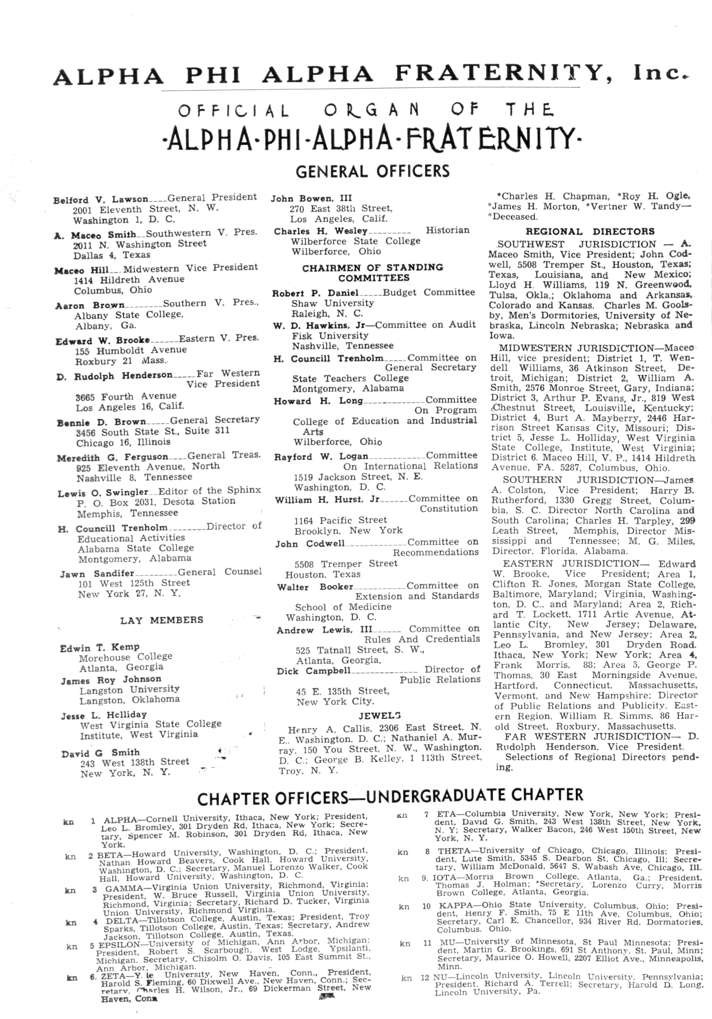 Edward W Brooke, Vice President; Area 1, Clifton R Jones, Morgan State College, Baltimore, Maryland; Virginia, Washington, D C, and Maryland; Area 2, Richard T Lockett, 1711 Artie Avenue, Atlantic City, New Jersey; Delaware, Pennsylvania, and New Jersey; Area 2, Leo L Bromley, 301 Dryden Road Ithaca, New York; New York; Area 4, Frank Morris, 88; Area 5, George P Thomas, 30 East Morningside Avenue, Hartford, Connecticut Massachusetts, Vermont, and New Hampshire; Director of Public Relations and Publicity Eastern Region, William R Simms 86 Harold Street Roxbury, Massachusetts FAR WESTERN JURISDICTION D Rudolph Henderson Vice President Selections of Regional Directors pending