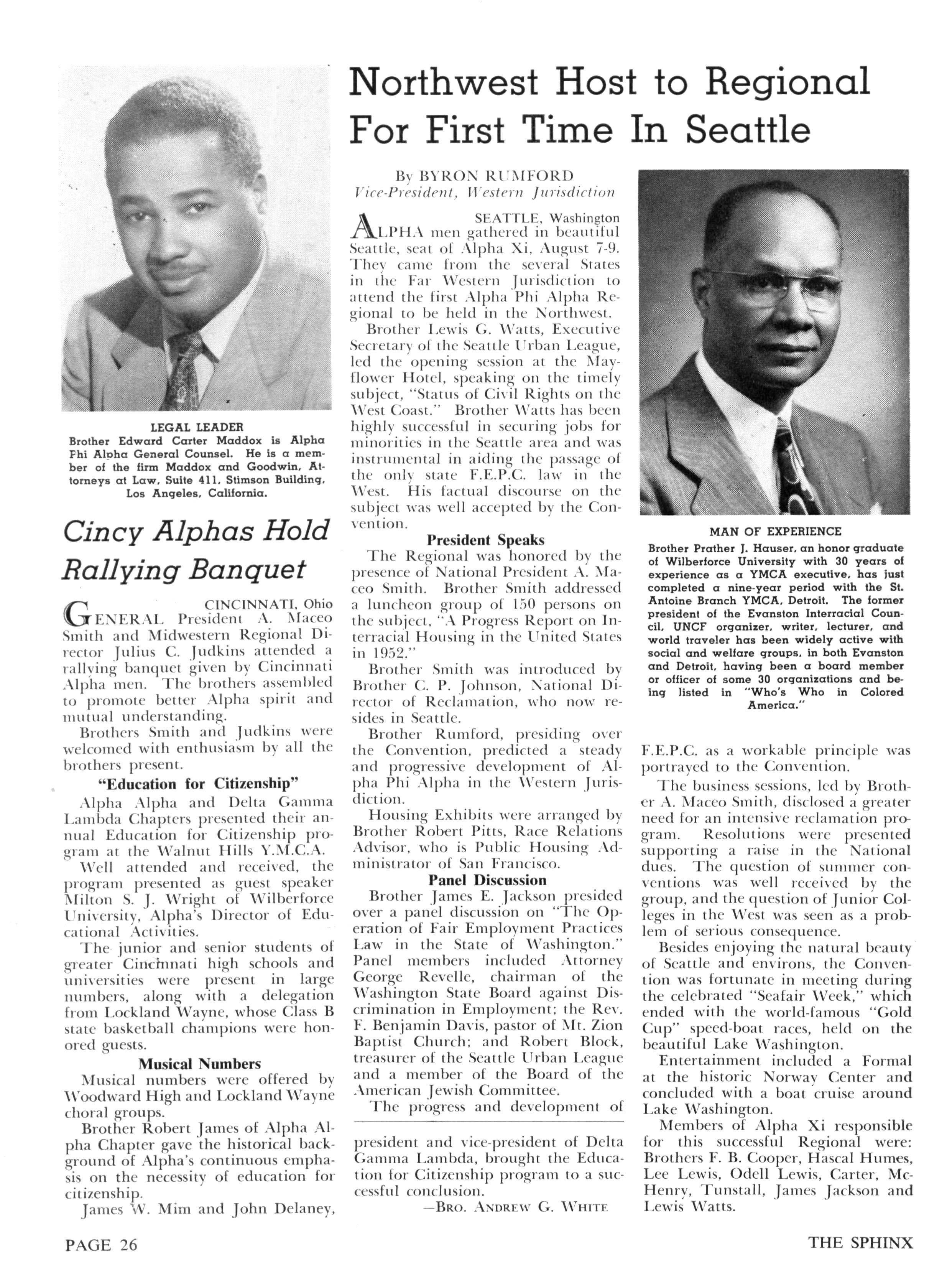 Regional Director M G Miles responded to greetings at the public program, while Walter C. Pinkston gave Pan-Hellenicana, and Brother W C Cogdell, the Rev J B Blacknell, and Mrs Marion Shannon played leading roles Brother David H Dobbs presided.