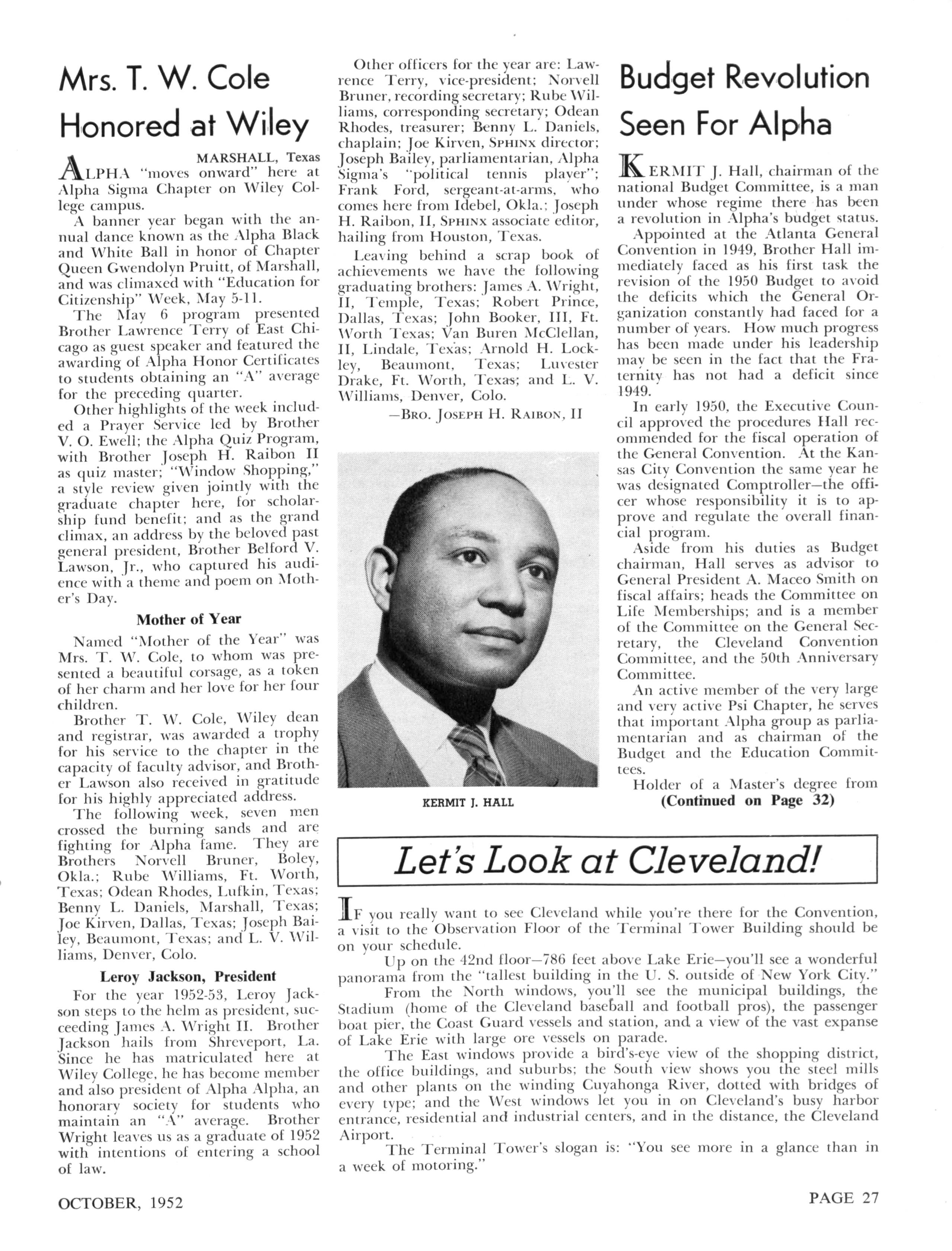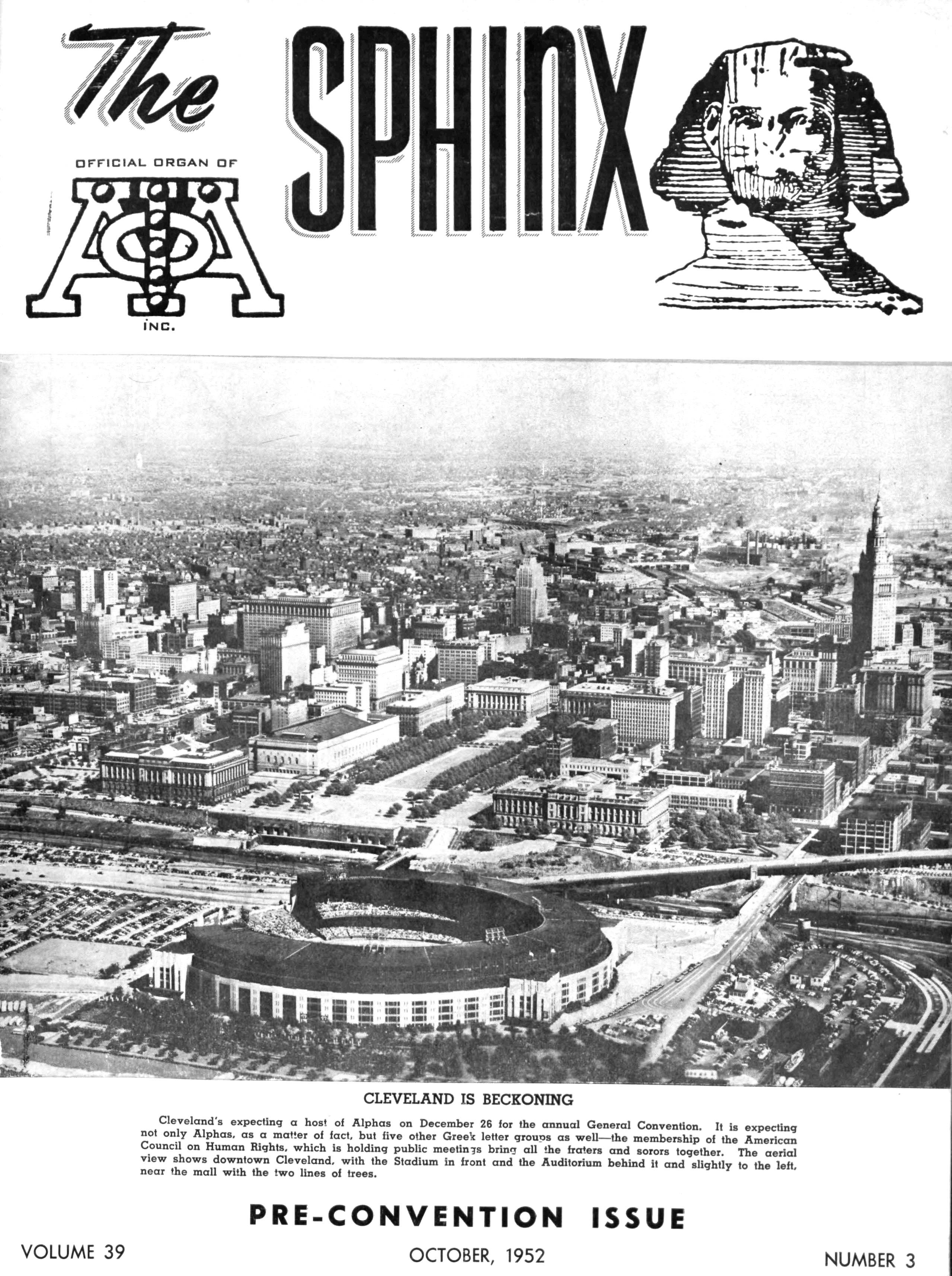 Cleveland's expecting a host of Alphas on December 26 for the annual General Convention. It is expecting not only Alphas, as a matter of fact, but five other Greek letter groups as weU—the membership of the American Council on Human Rights, which is holding public meetin7s bring all the fraters and sorors together The aerial view shows downtown Cleveland, with the Stadium in front and the Auditorium behind it and slightly to the left near the mall with the two lines of trees.