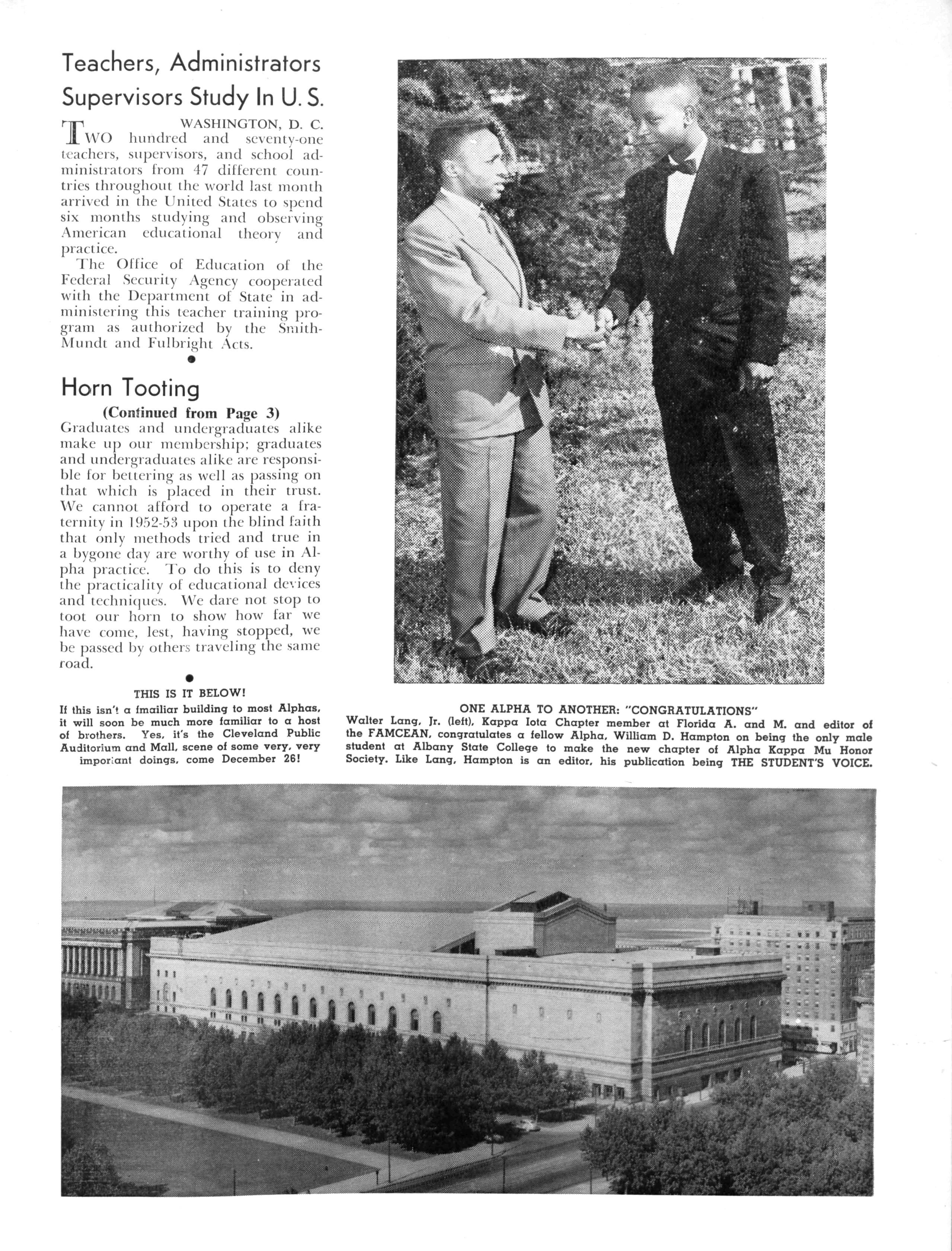 Walter Lang. Jr. (left). Kappa Iota Chapter member at Florida A. and M. and editor of the FAMCEAN, congratulates a fellow Alpha, William D Hampton on being the only male student at Albany State College to make the new chapter of Alpha Kappa Mu Honor Society Like Lang, Hampton is an editor, his publication being THE STUDENT'S VOICE