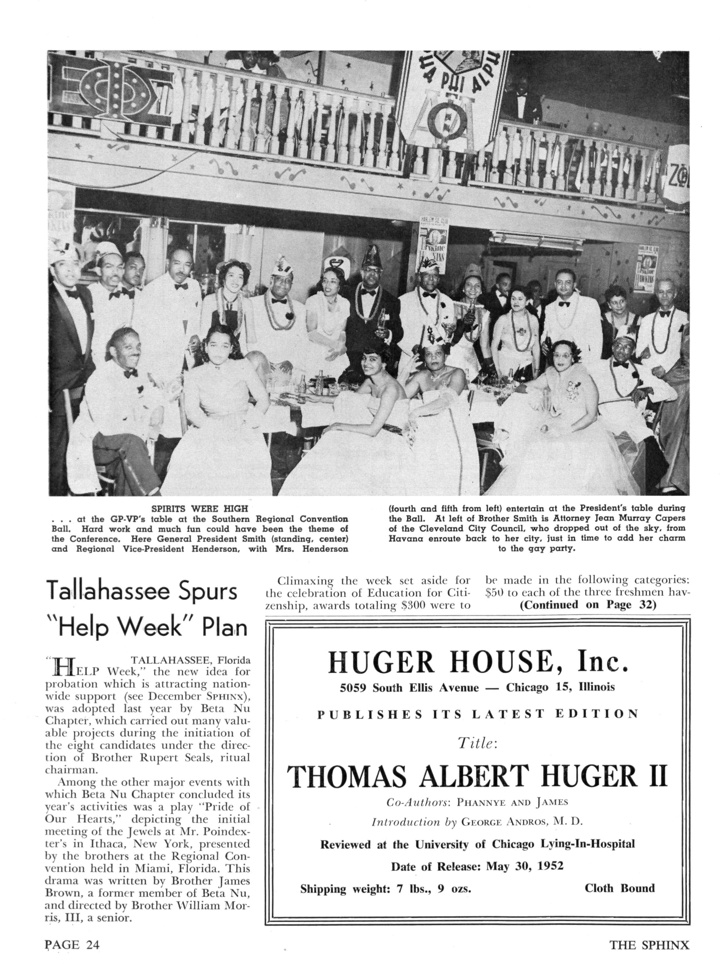 Alpha Kappa Alpha Sorority, Delta Sigma Theta Sorority, Kappa Alpha Psi Fraternity, and the Pan-Hellenic Council sponsored events to make the social side of the convention highly entertaining Mrs Fletcher A Pasdial was president of auxiliary hostesses