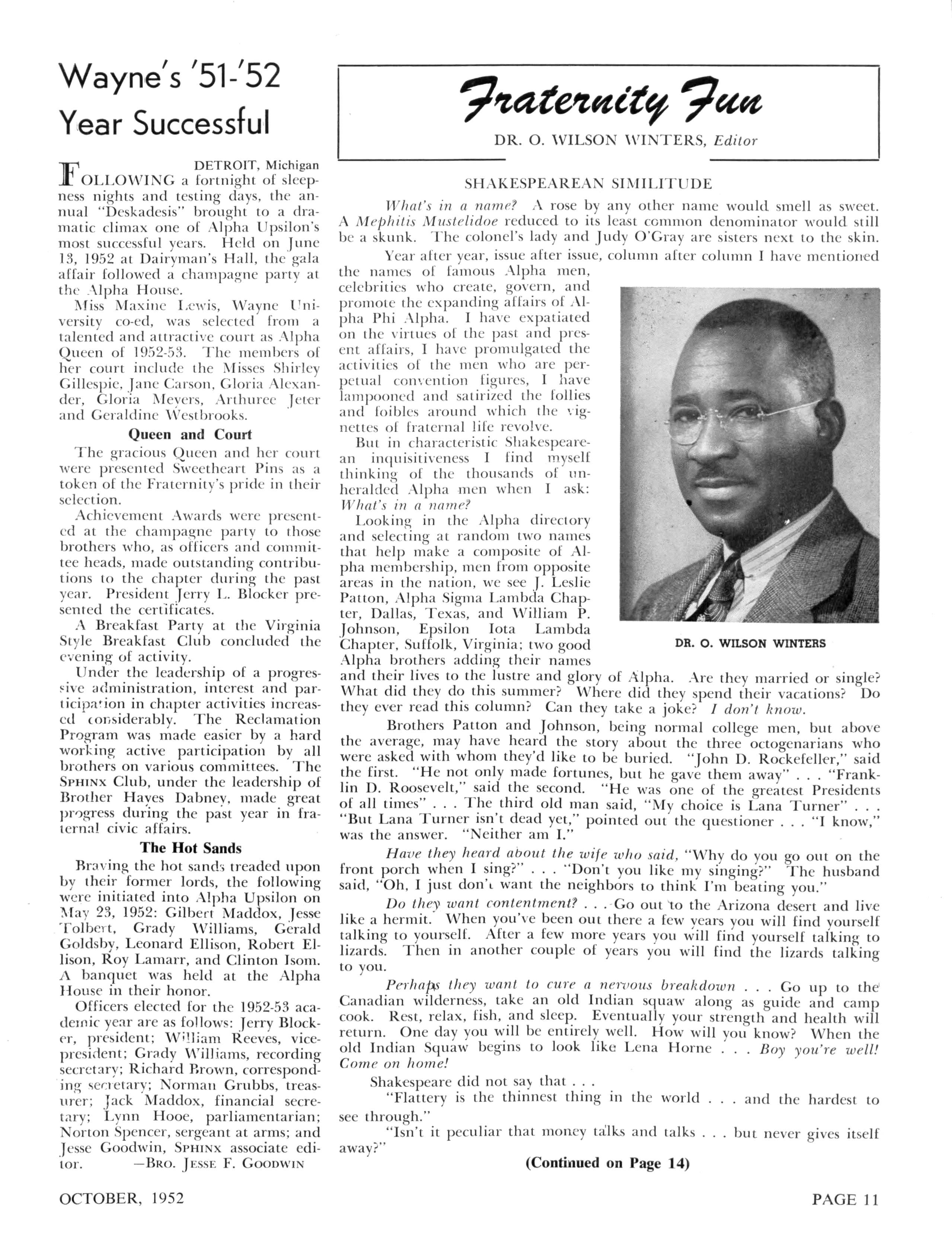 We cannot afford to operate a fraternity in 1952-53upon the blind faith that only methods tried and true in a bygone day are worthy of use in Alpha practice To do this is to deny the practicality of educational devices and techniques We dare not stop to toot our horn to show how far we have come, lest, having stopped, we bepassed byothers traveling the same road