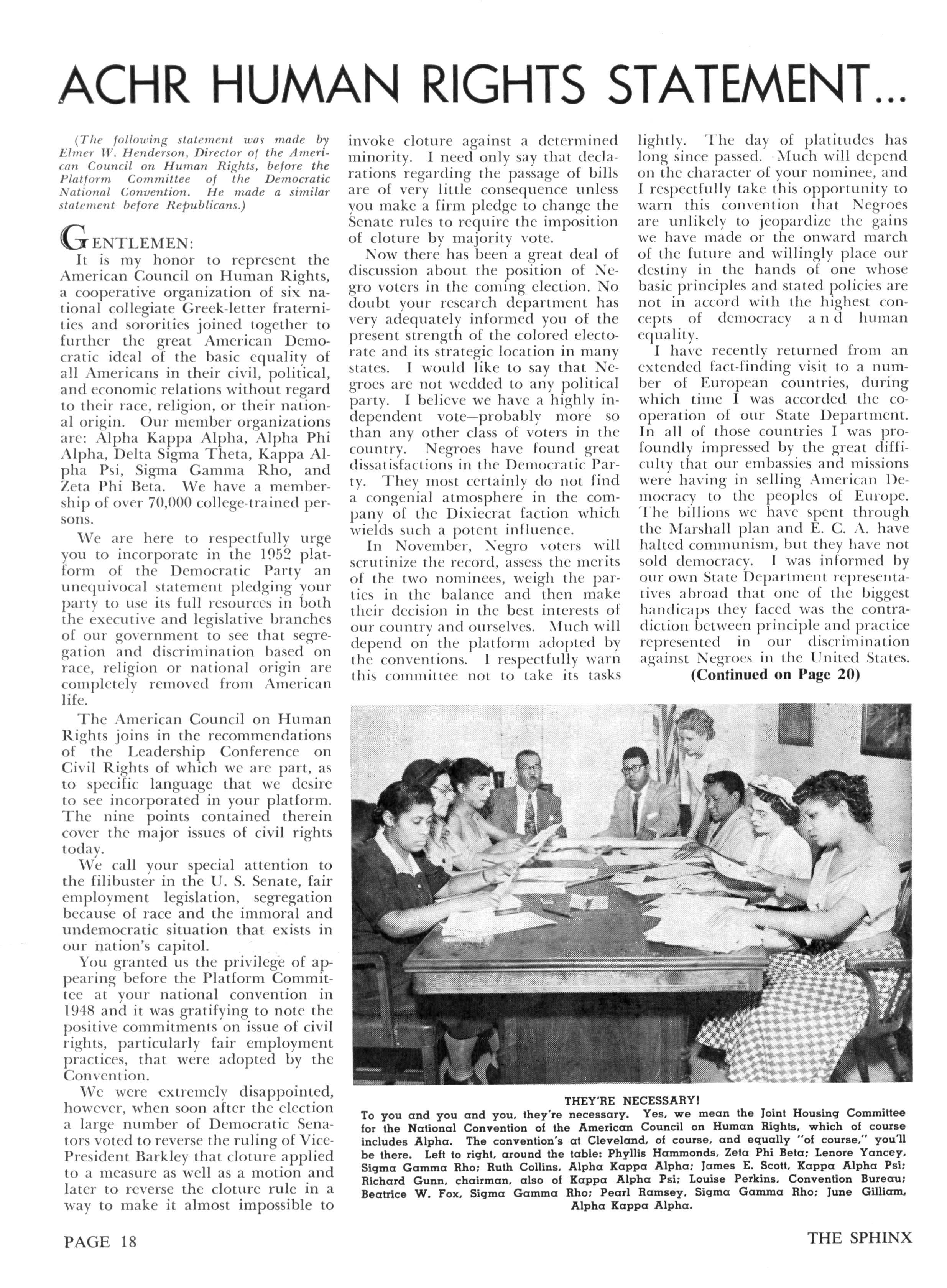 lames E. Huger, Executive Secretary of Alpha Phi Alpha, presents the recommendations of one of the sessions of the Civil Rights Convention-Workshop held on the campus of the University of Chicago, June 30 The meetings were sponsored by the Chicago Council of the American Council on Human Rights Workshop recommendations were presented to the national conventions of the major parties by Elmer W. Henderson, A.C.H.R. national director. Seated on the platform behind Mr. Huger are Mrs. Victoria McClerkin. Alpha Kappa Alpha, General Chairman of the program; William H. Browne, III, Alpha Phi Alpha, President of the Chicago A.C.H.R., and Elmer W. Henderson, A.C.H.R. national director.