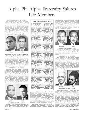 Alpha Phi Alpha Fraternity Salutes Life Members BROTHER CHARLES H. WESLEY Life member, Past General President, historian of Alpha Phi Alpha. World famous as educator, historian, author and speaker; president of Ohio's Central State College since 1947; active among college administrators of the state; noted graduate of Fisk, Yale and Harvard, with B.A., M.A. and Ph.D., respectively. Honorary doctorates: Wilberforce, Virginia State, Allen, Morris Brown. Among his several books is The History of Alpha Phi Alpha — a Development in Negro College Life.