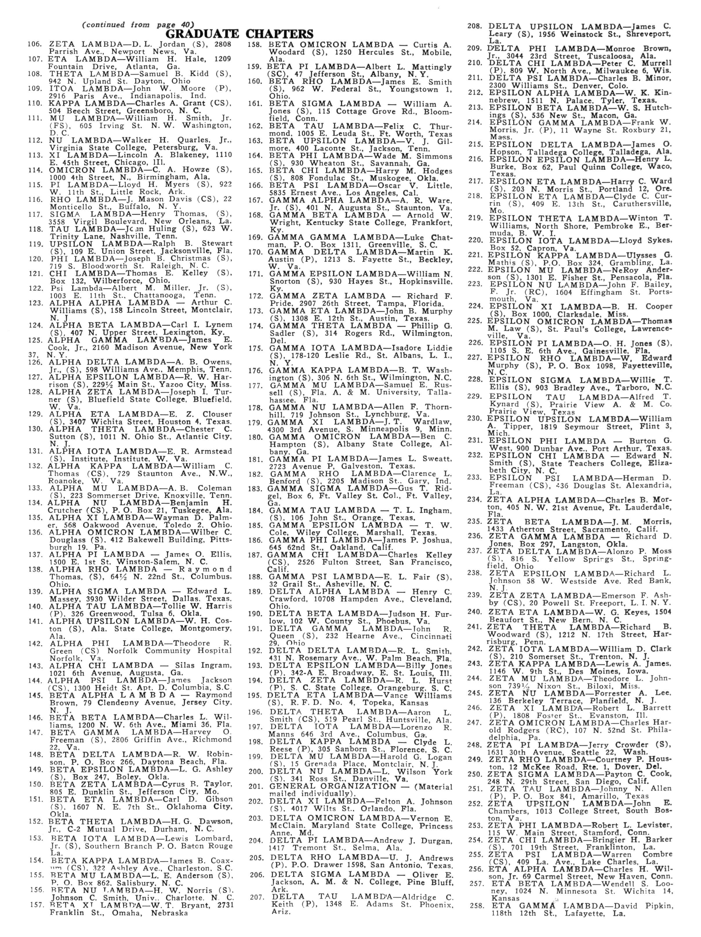 219. EPSILON THETA LAMBDA—Winton T. Williams, North Shore, Pembroke E., Bermuda, B W I 220. EPSILON IOTA LAMBDA—Lloyd Sykes, Box 52. Capron, Va.