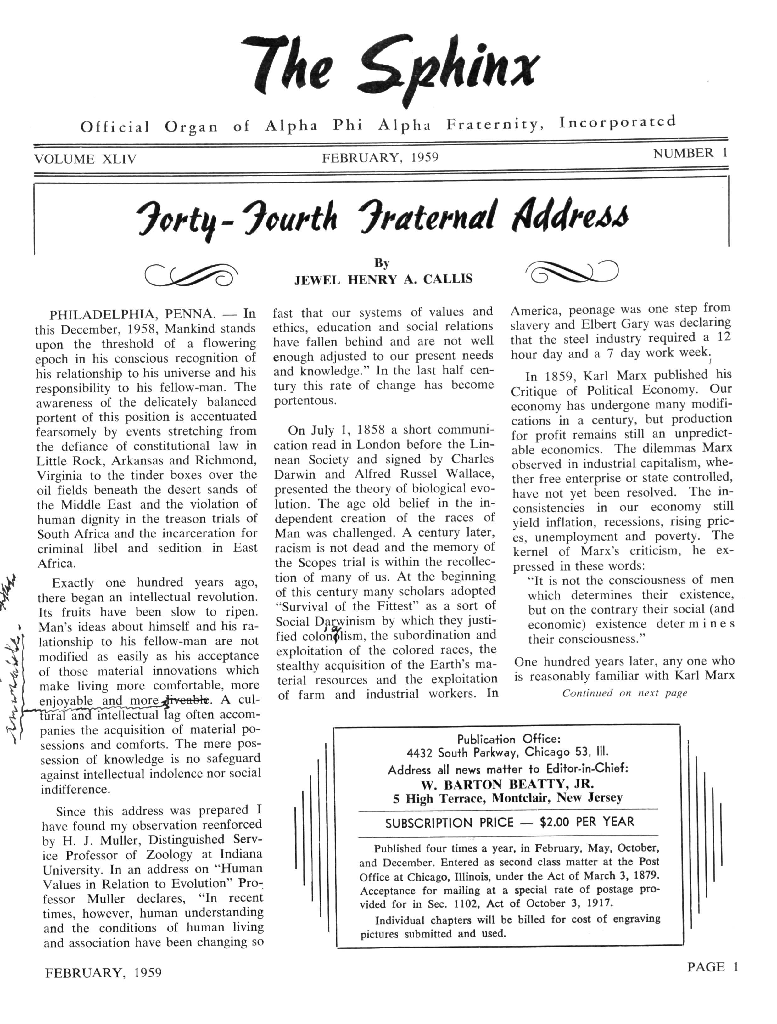 Editor-in-Chief "TH E SPHINX" : W BARTO N BEATTY, Jr., # 5 Hig h Terrace, Montclair, Ne w Jersey