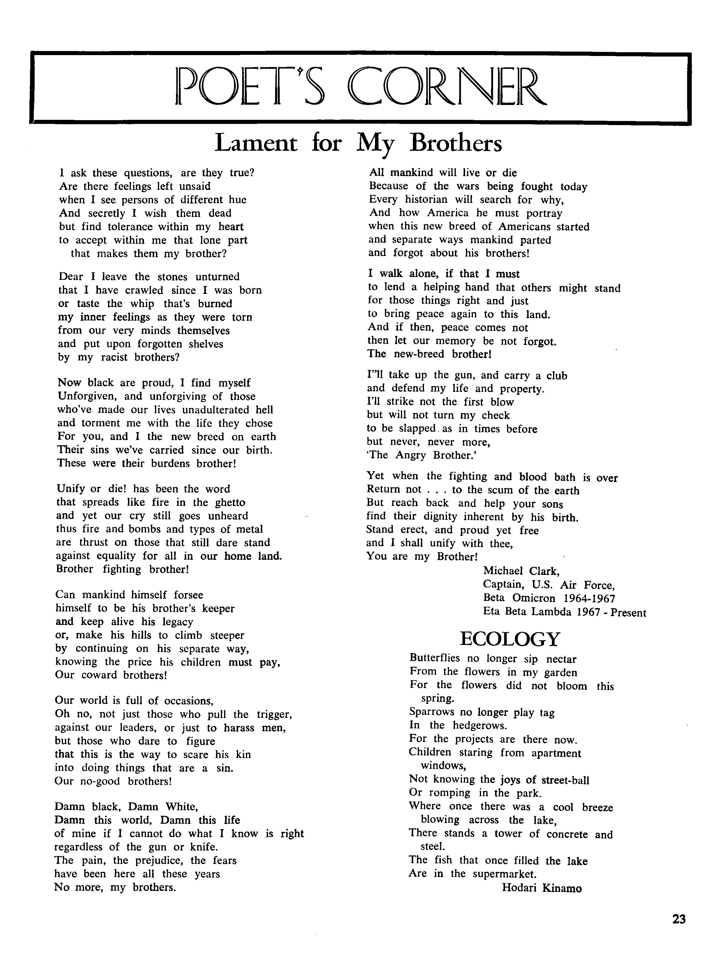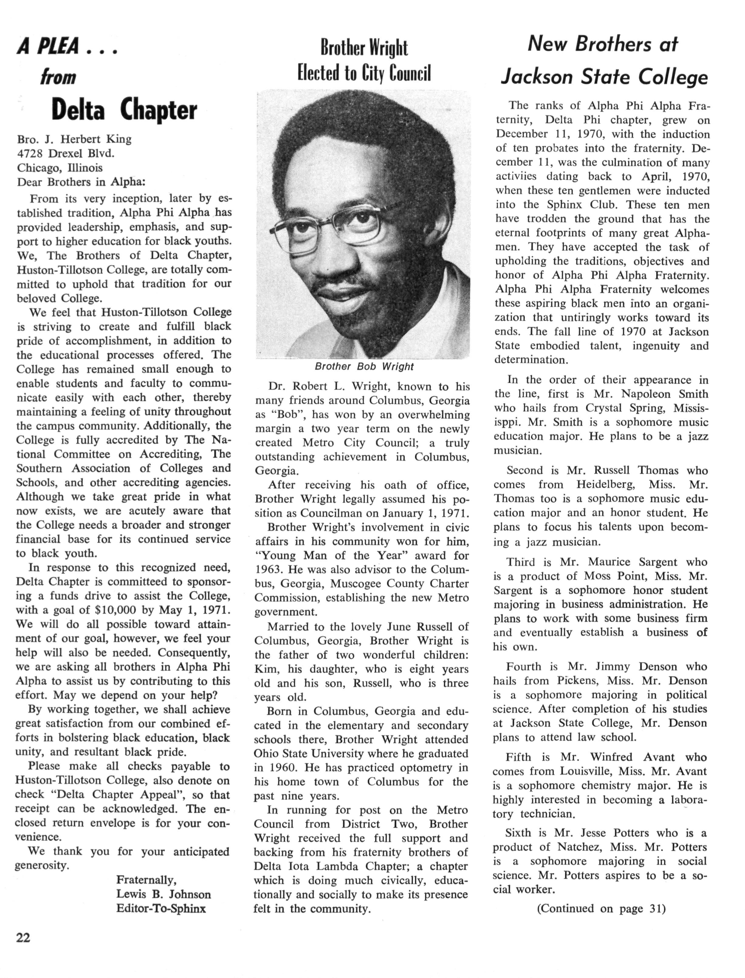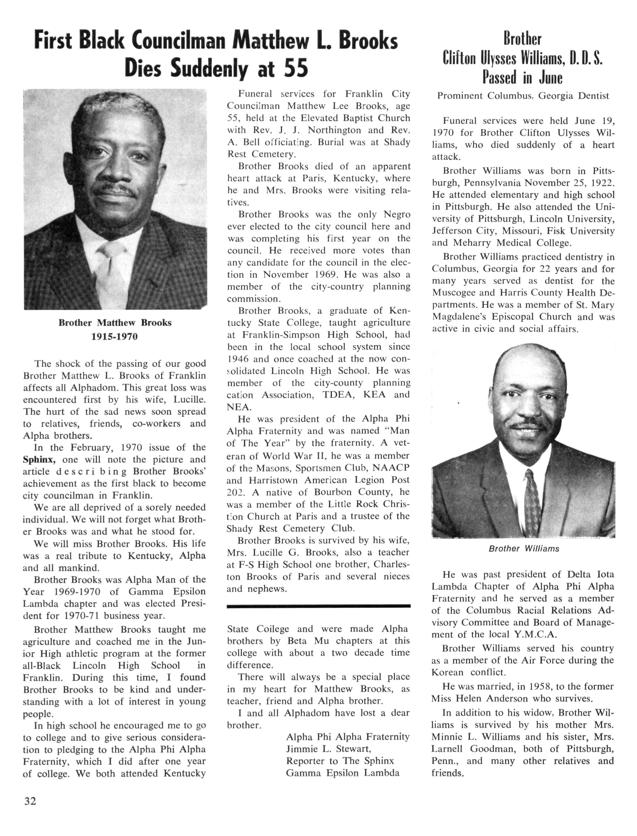 In the February, 1970 issue of the Sphinx, one will note the picture and article descr i bin g Brother Brooks' achievement as the first black to become city councilman in Franklin.