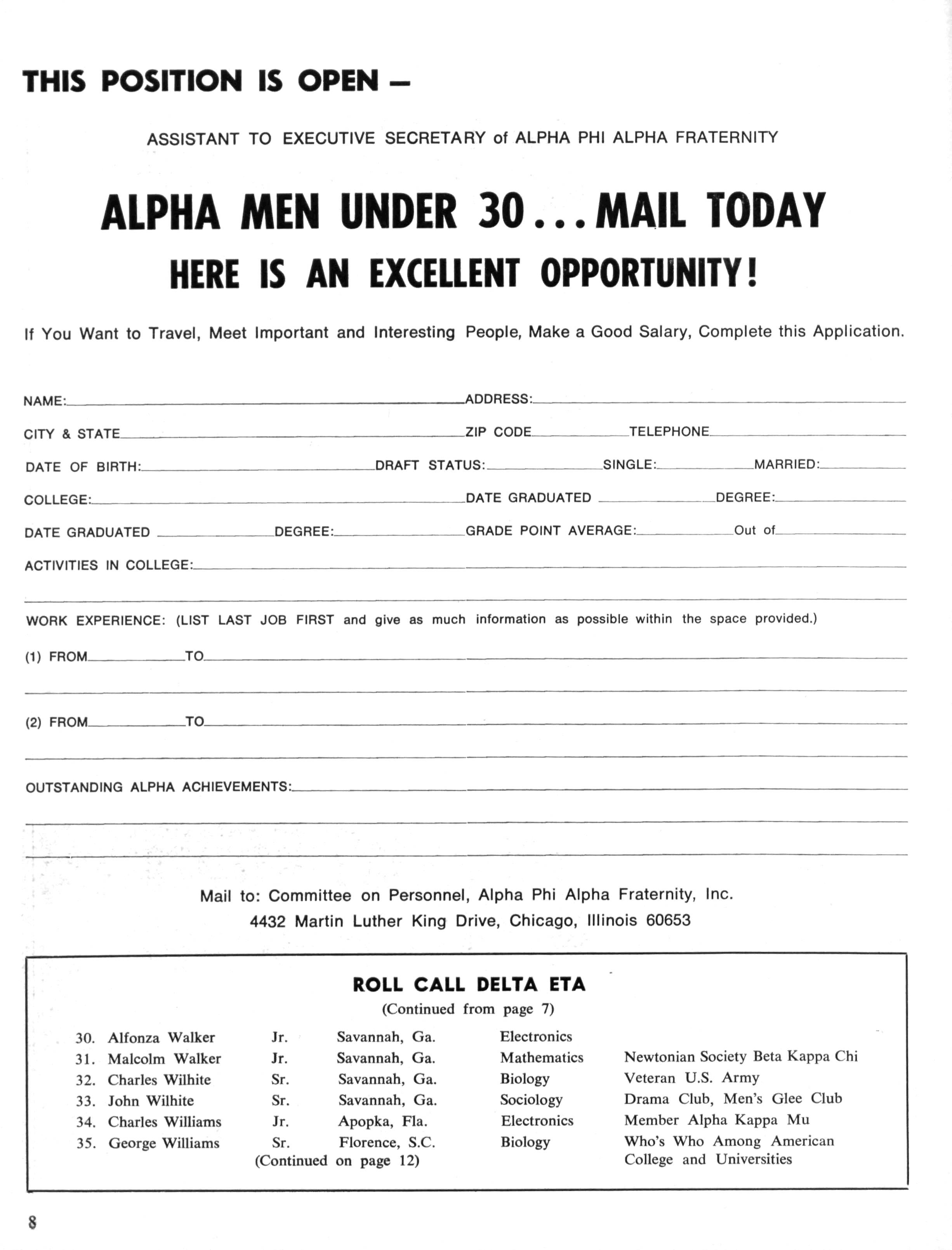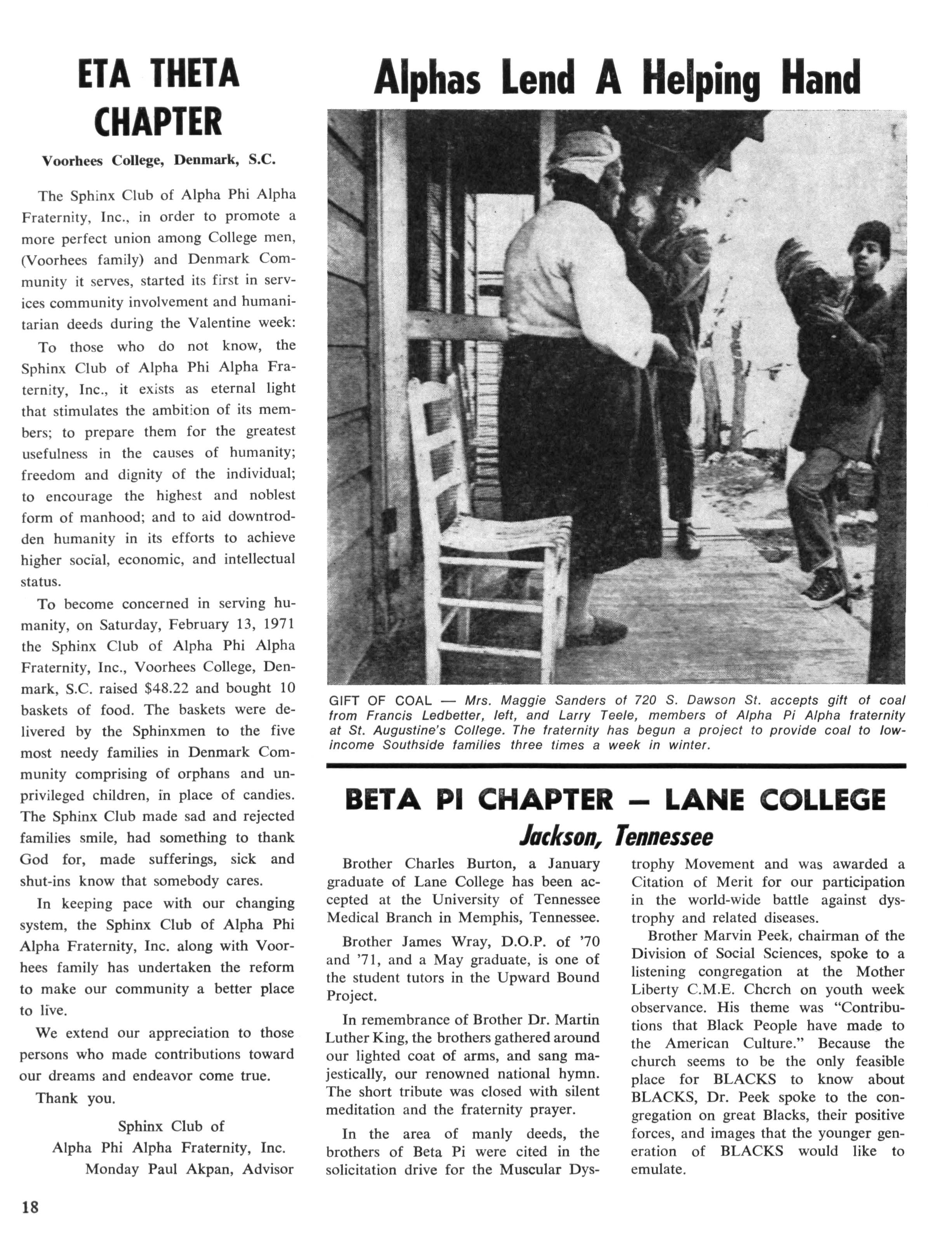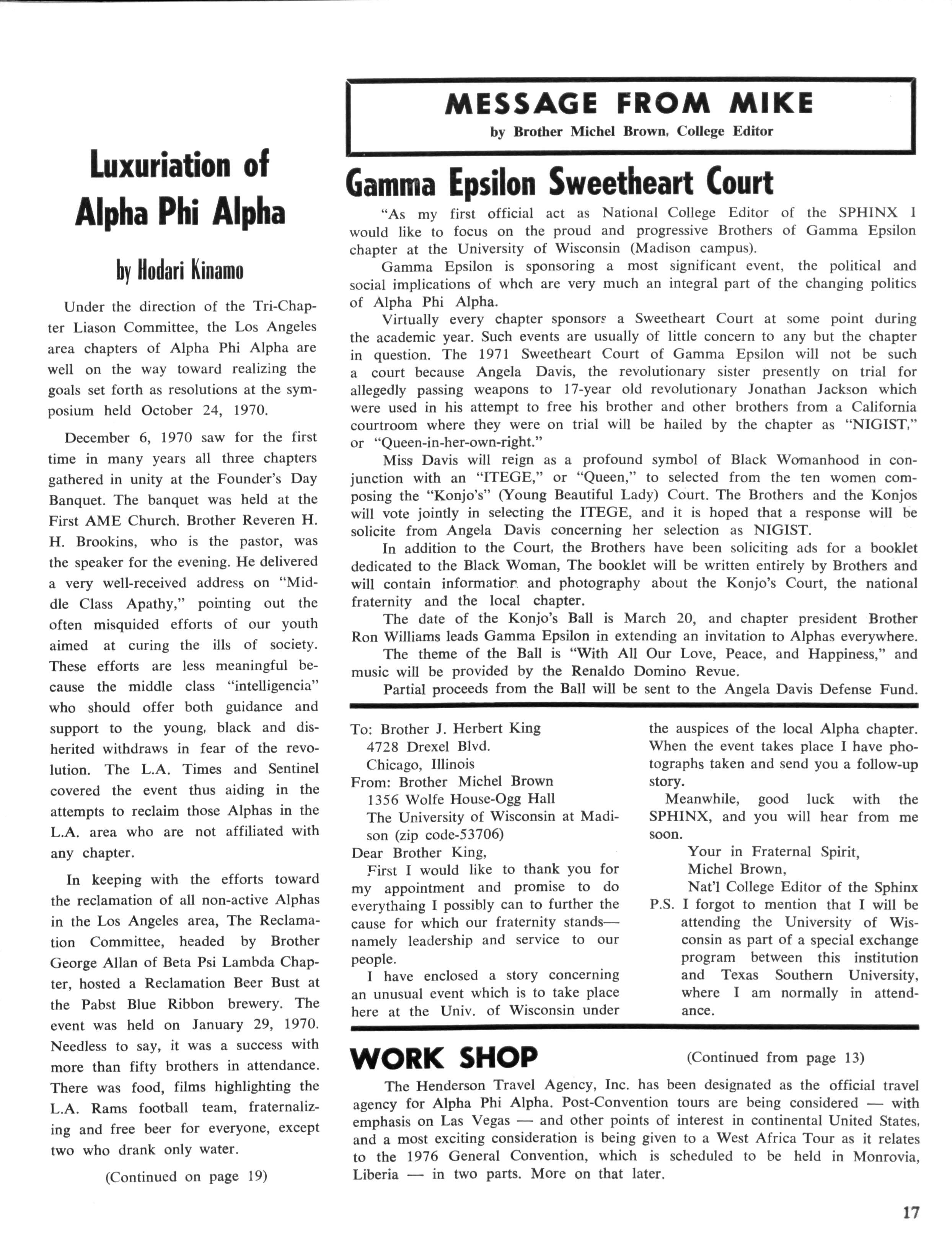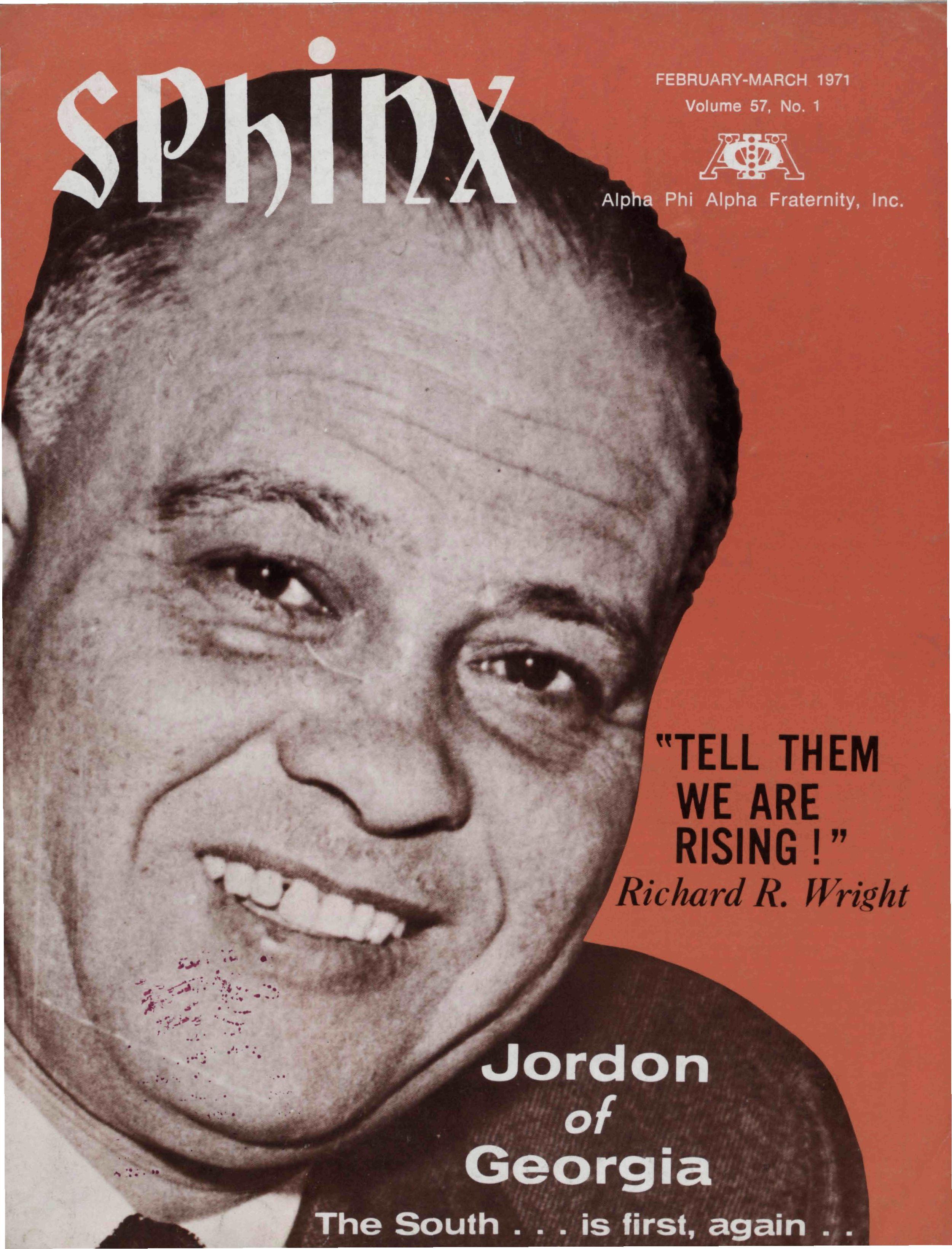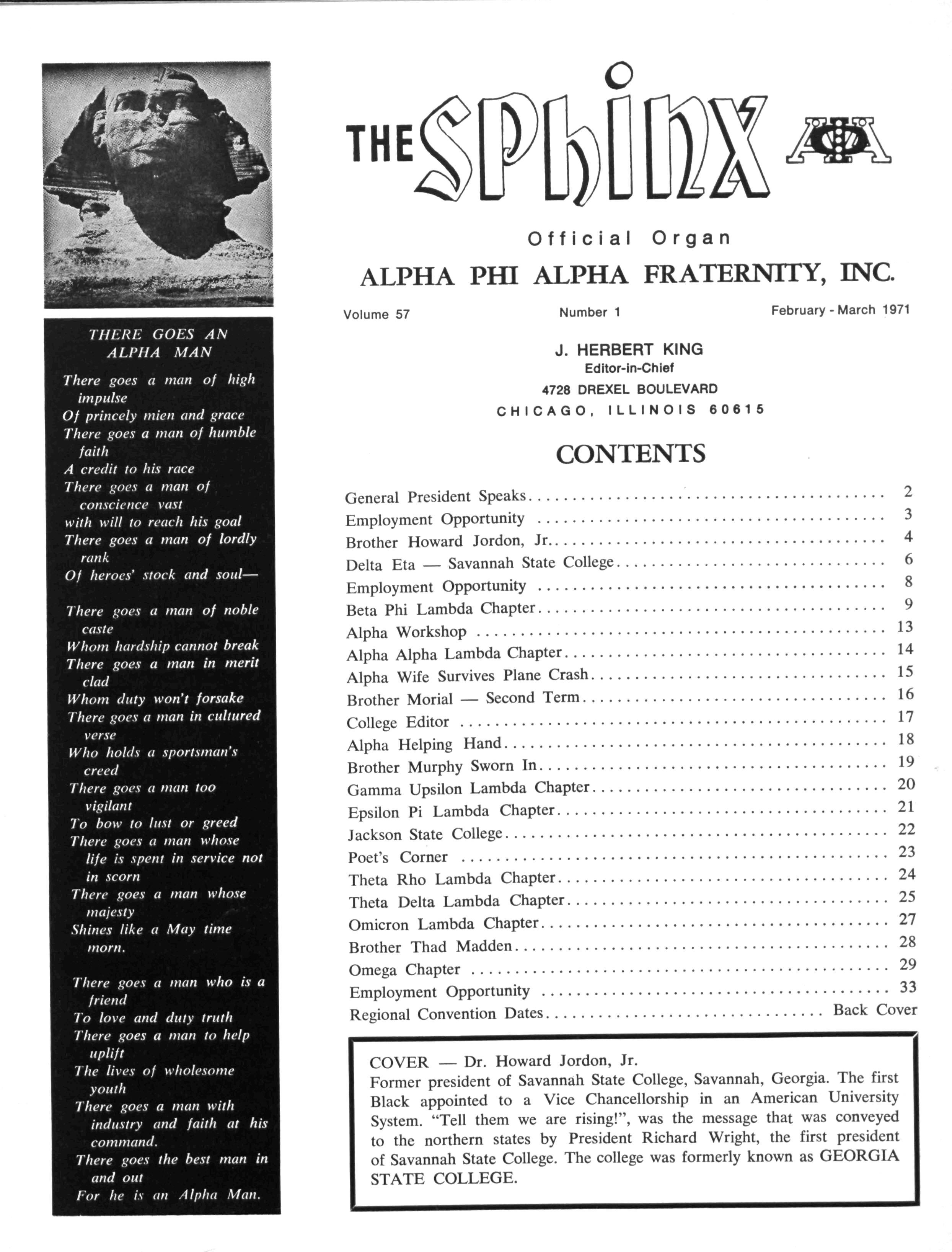 The Sphinx is the official magazine of the Alpha Phi Alpha Fraternity, Inc., 4432 Dr Martin Luther King Dr., Chicago, III., with editorial offices at 4728 Drexel Blvd., Chicago, III 60615 Published four times a year: February, May, October and December Address all editorial mail to 4728 Drexel Blvd., Chicago, III 60615 Change of Address: Send both addresses to Alpha Phi Alpha Fraternity, 4432 Dr Martin Luther King Drive, Chicago, III Manuscripts or art submitted to The Sphinx should be accompanied by addressed envelopes and return postage Editor assumes no responsibility for return of unsolicited manuscripts or art